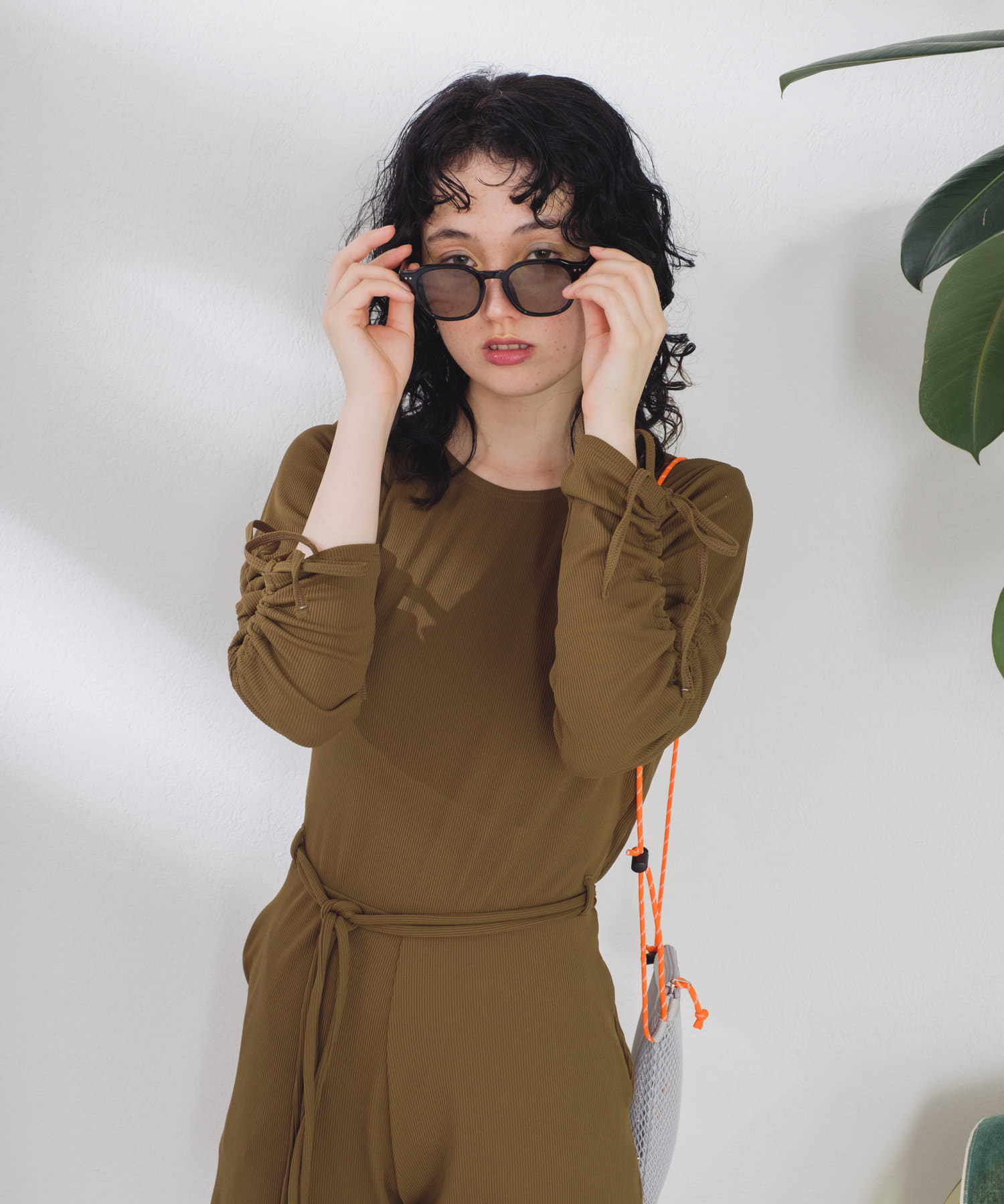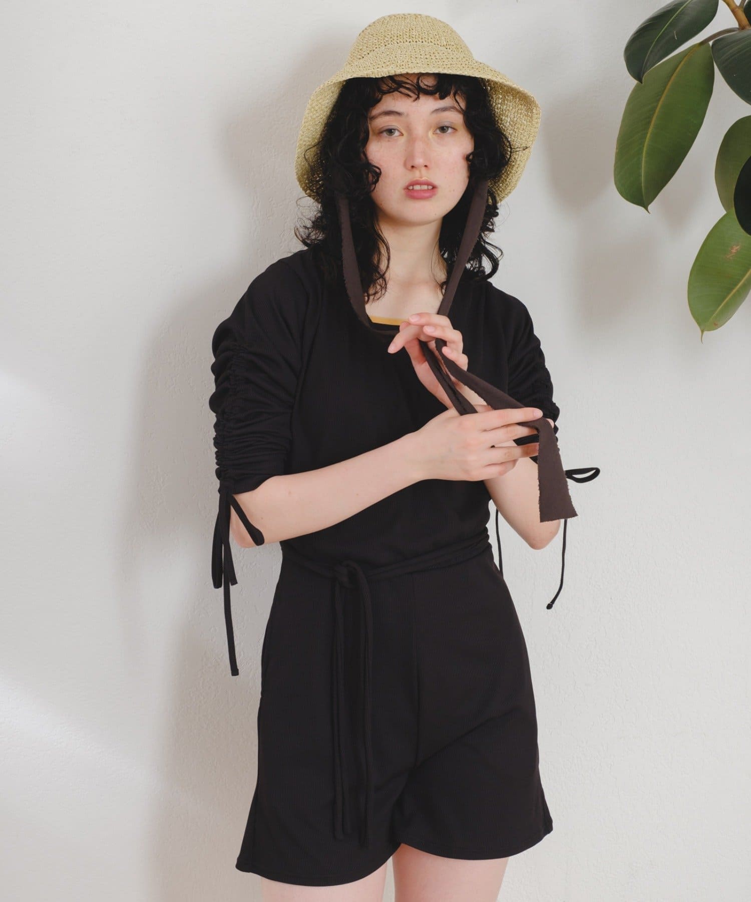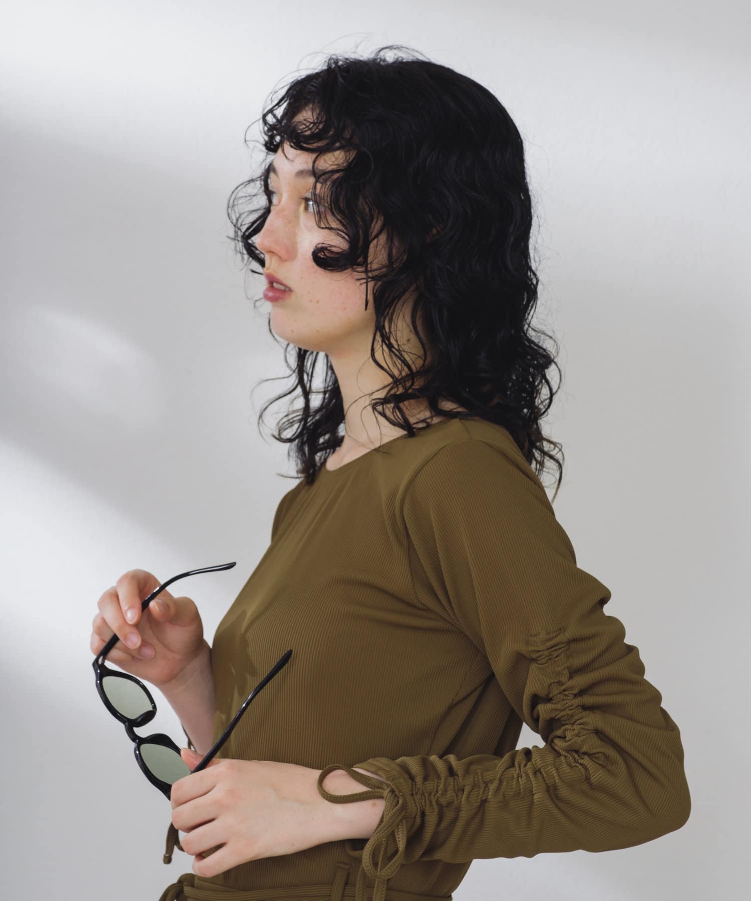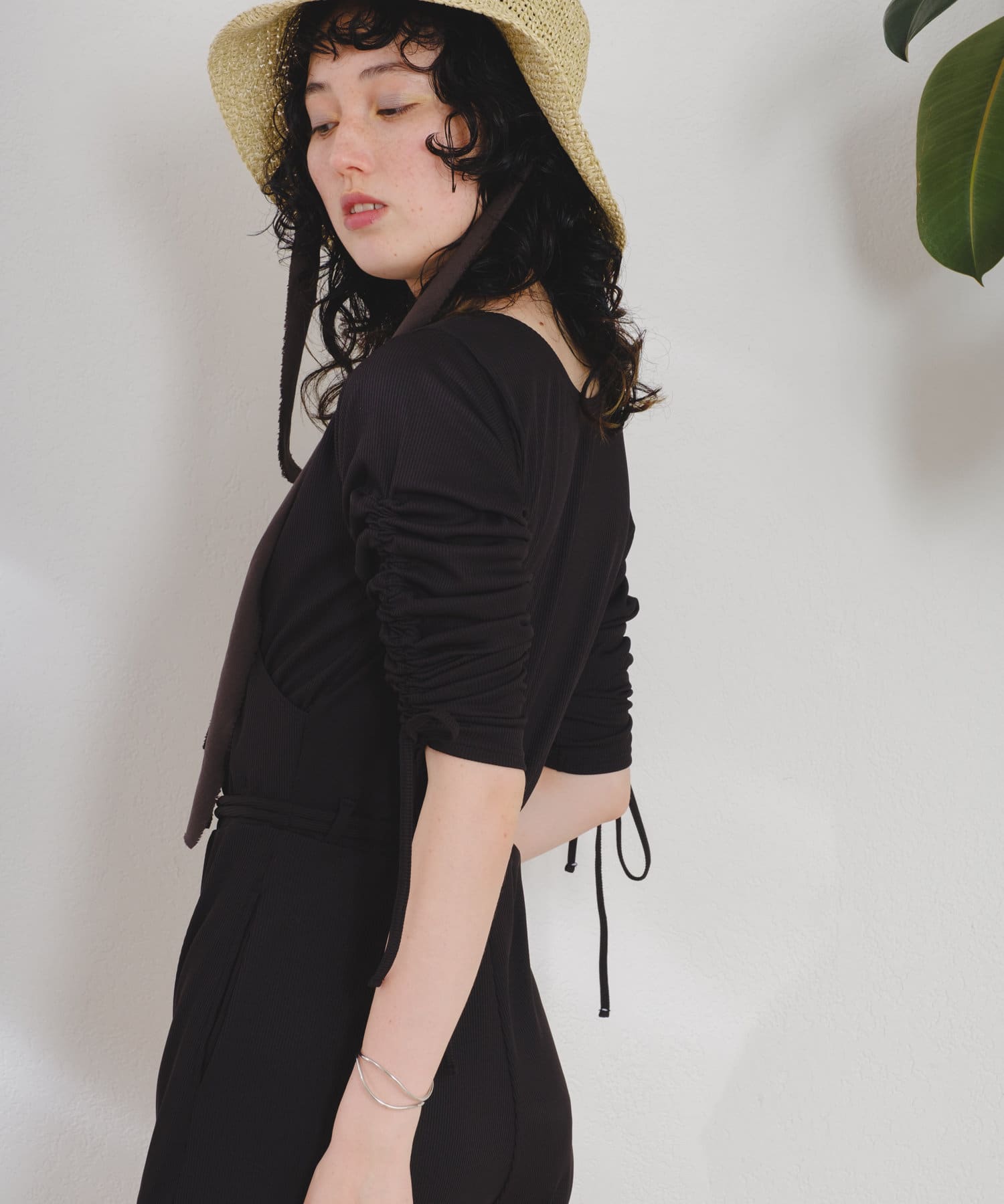 紐でシャーリング具合をお好みで変えていただけるトレンドなデザインです。