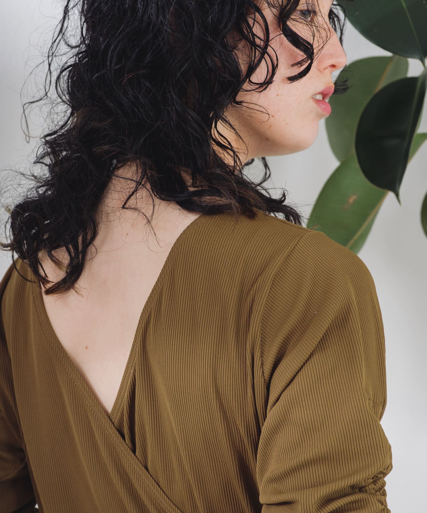 Vネックでデコルテラインを引き立ててくれるデザインです。