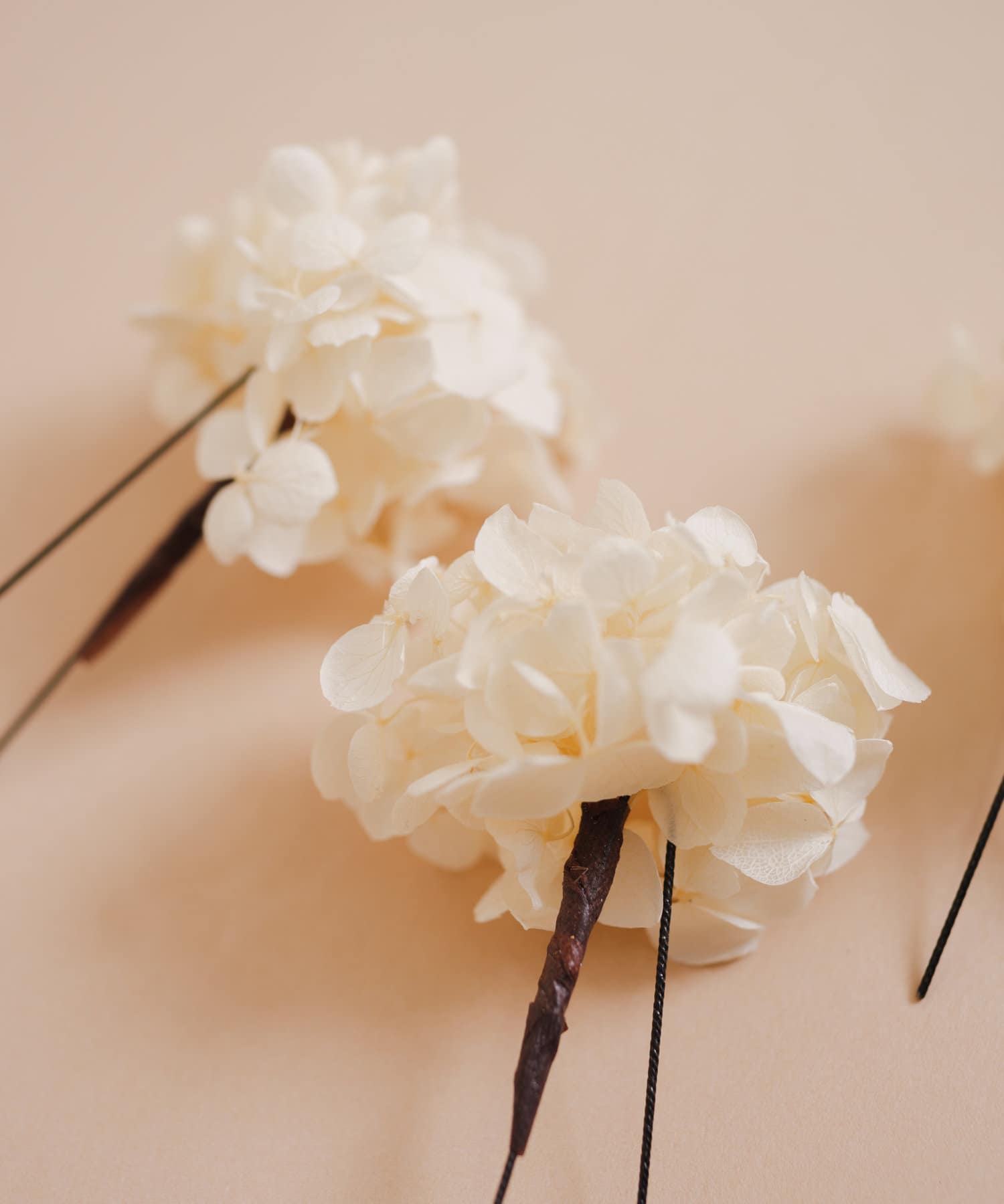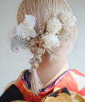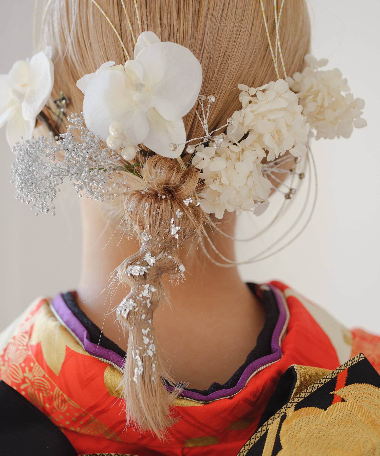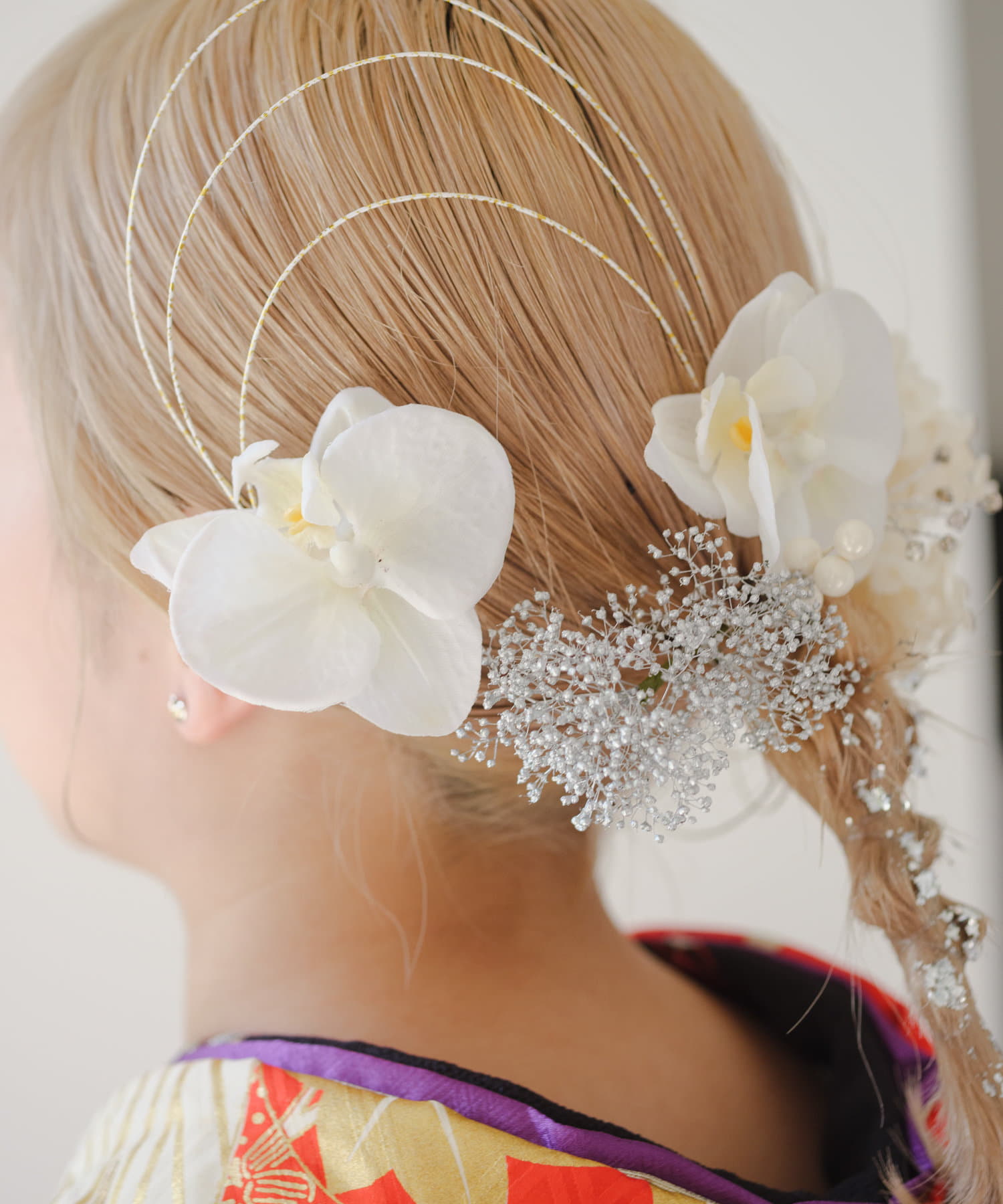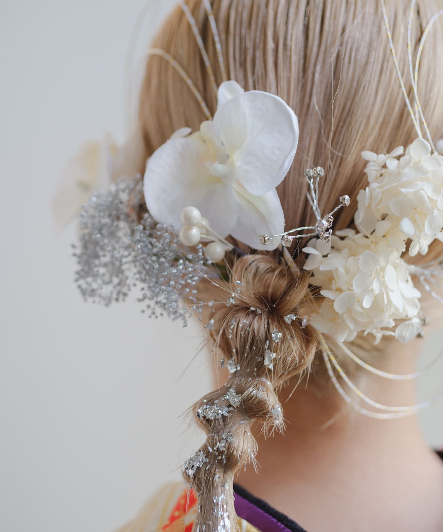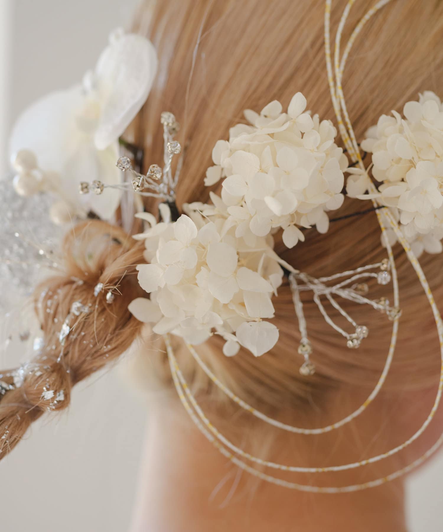 ブリザーブドフラワーの胡蝶蘭と紫陽花、ドライフラワーのかすみ草の髪飾り。