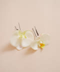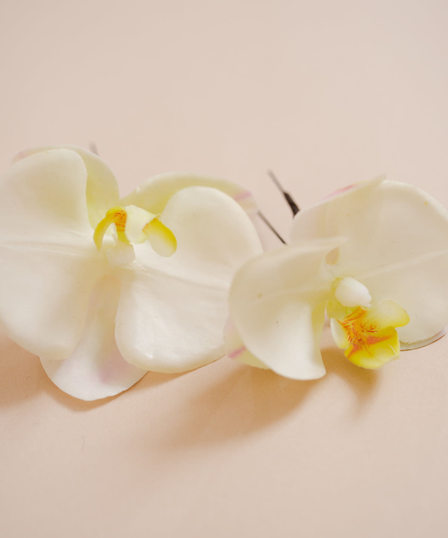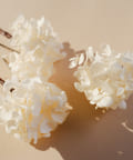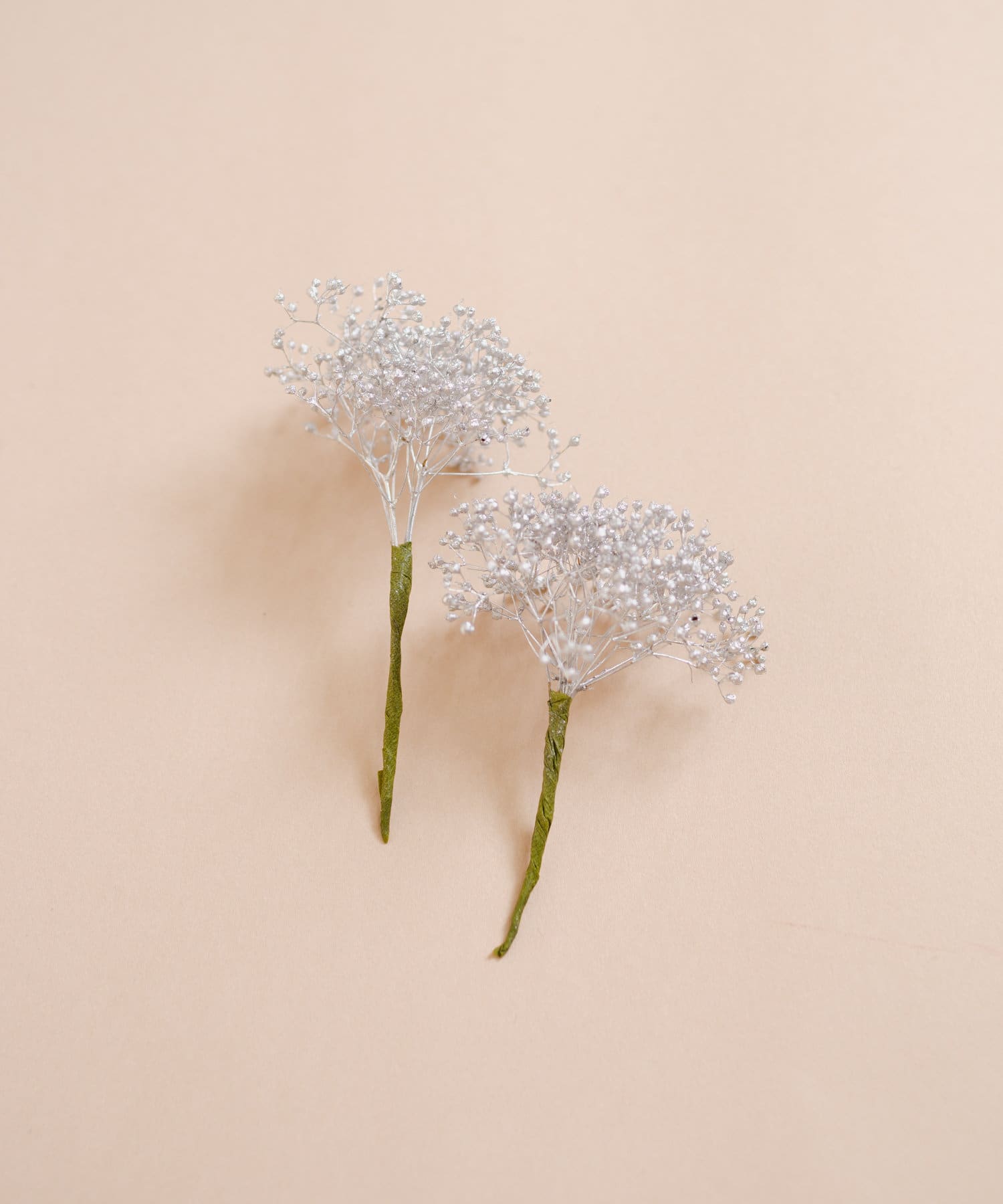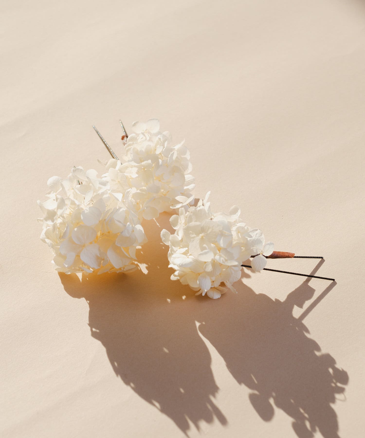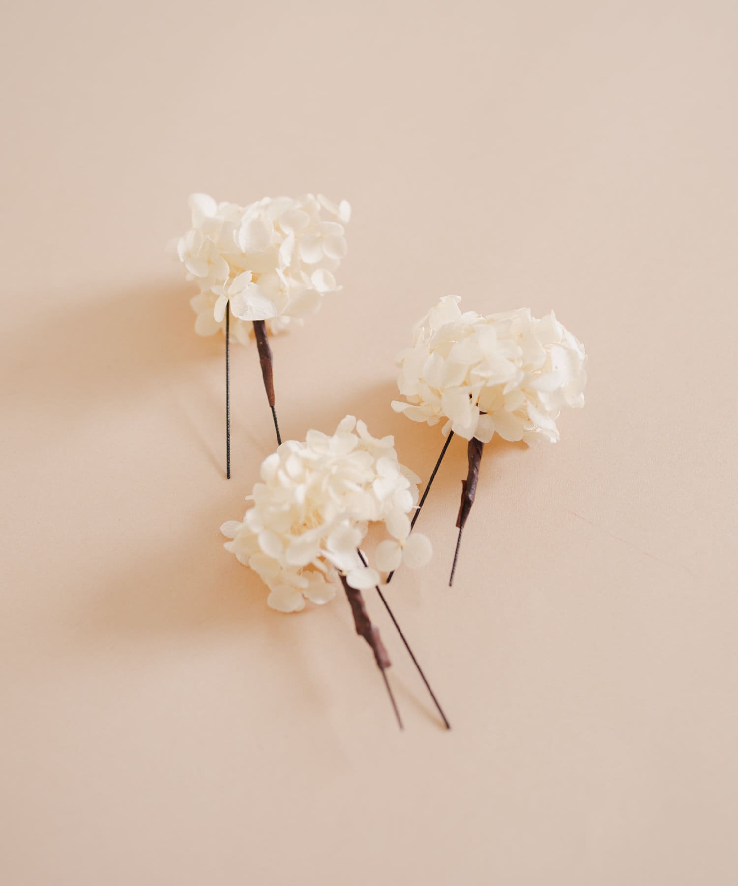 ブリザーブドフラワーの胡蝶蘭と紫陽花、ドライフラワーのかすみ草の髪飾り。