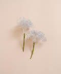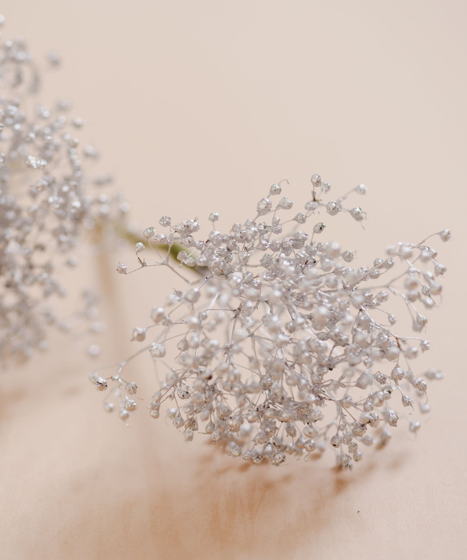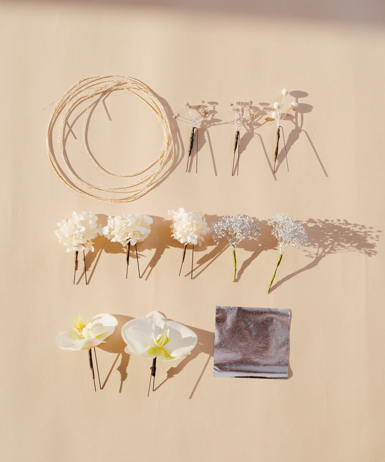 ホワイト胡蝶蘭2本、ホワイト紫陽花3本、シルバーかすみ草2本、パール1本、ビジュー2本、銀箔1枚、水引1本