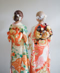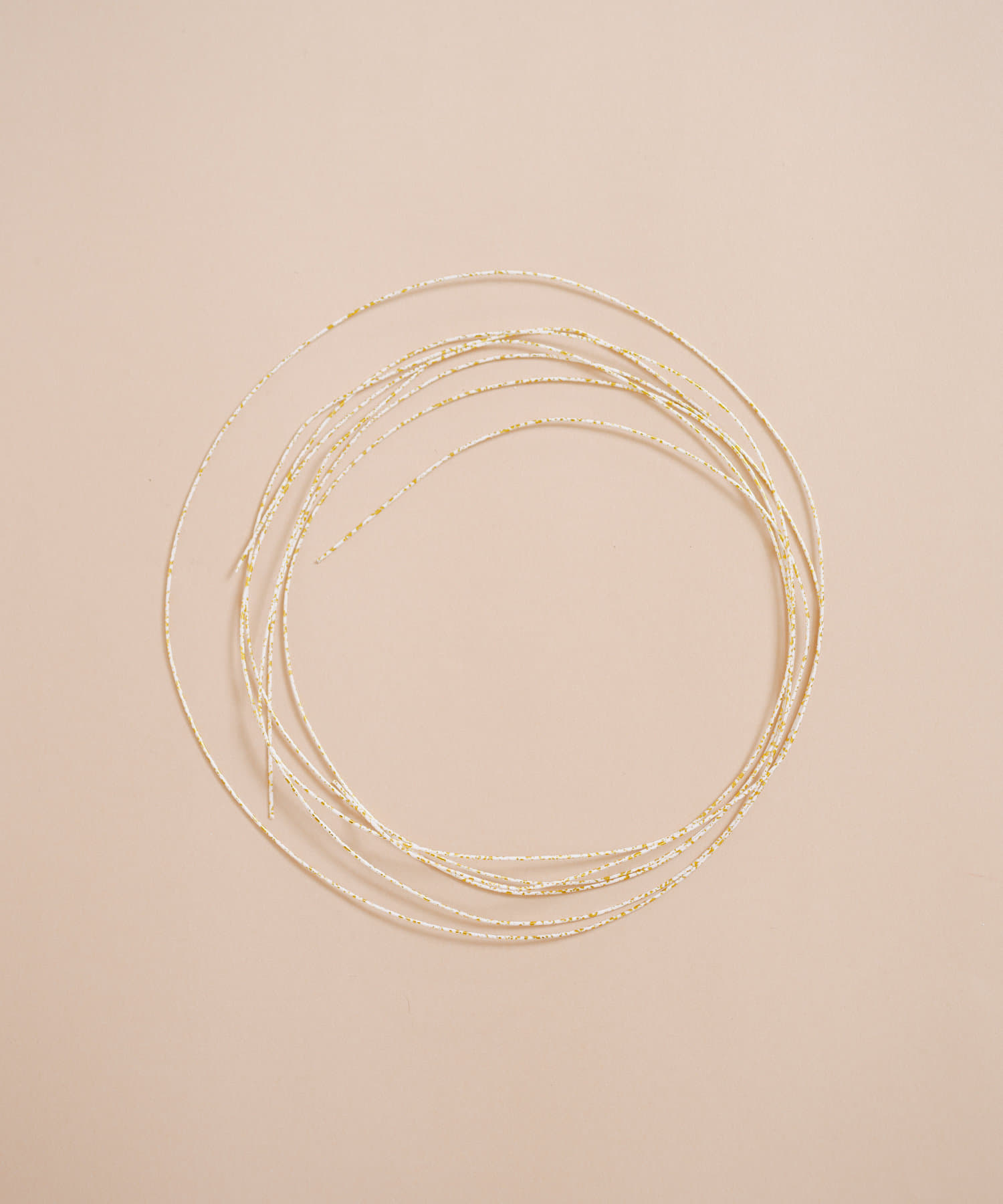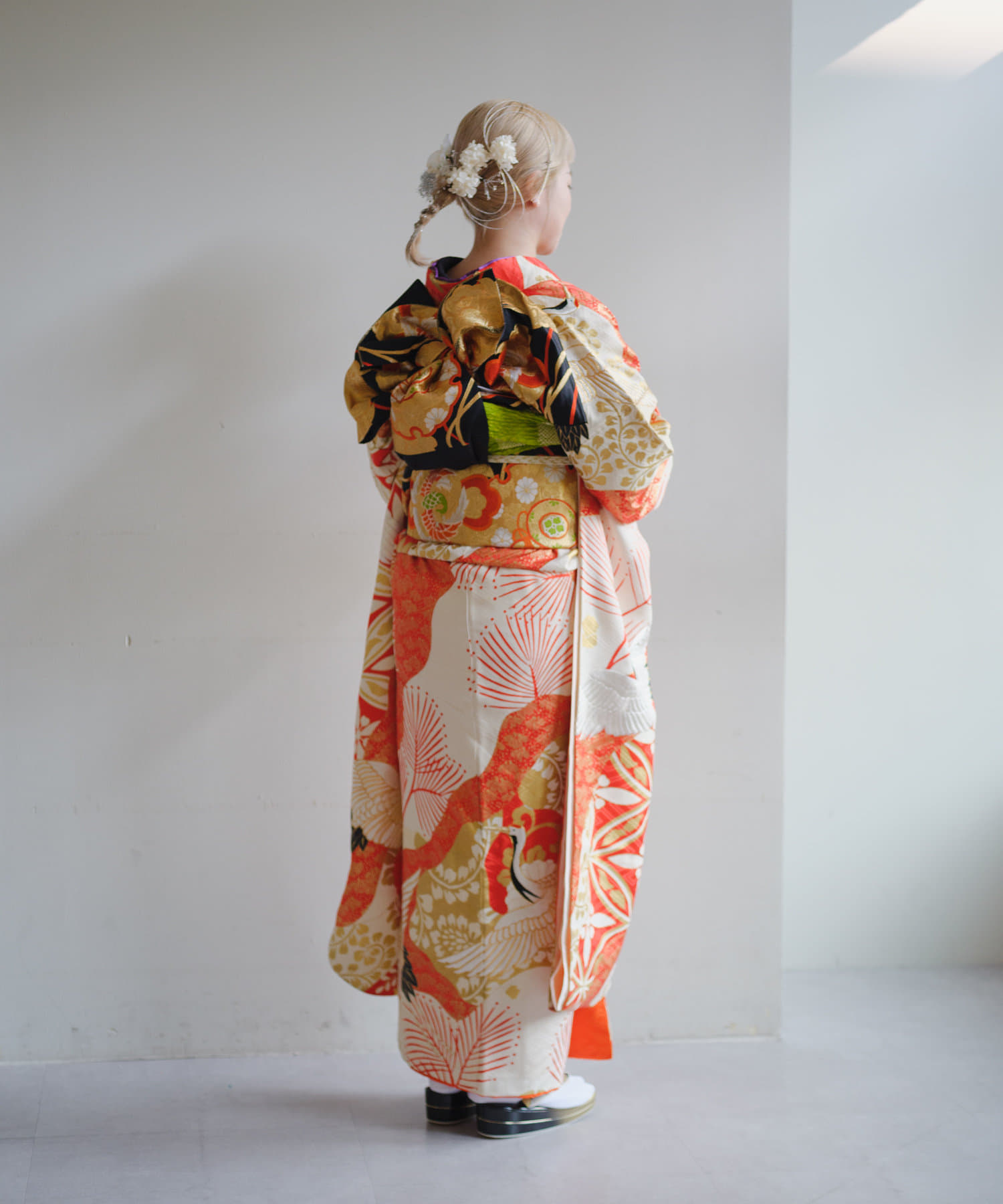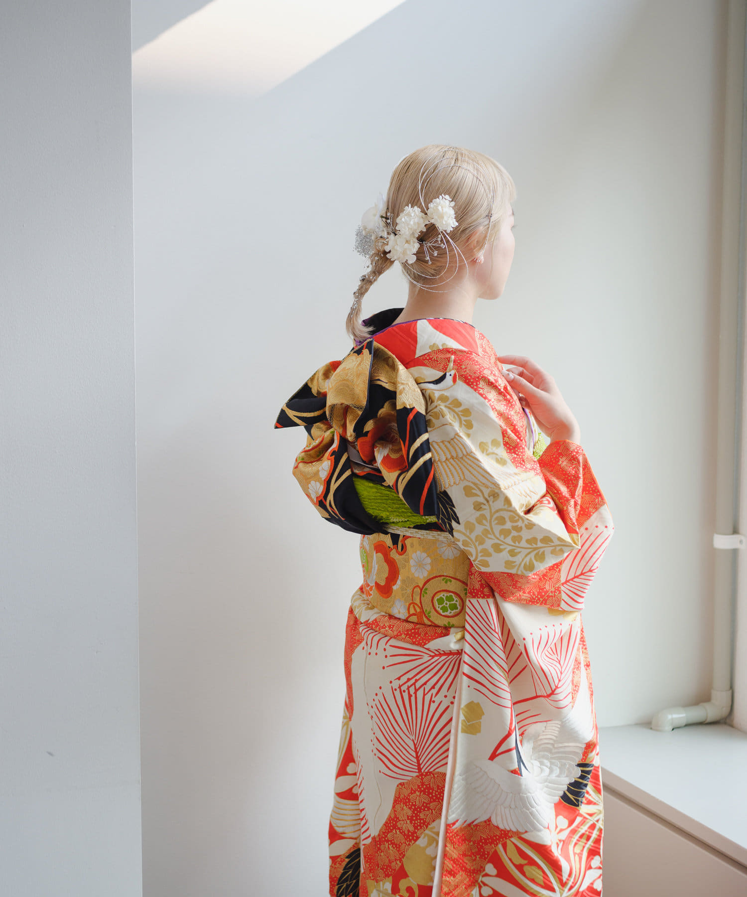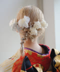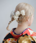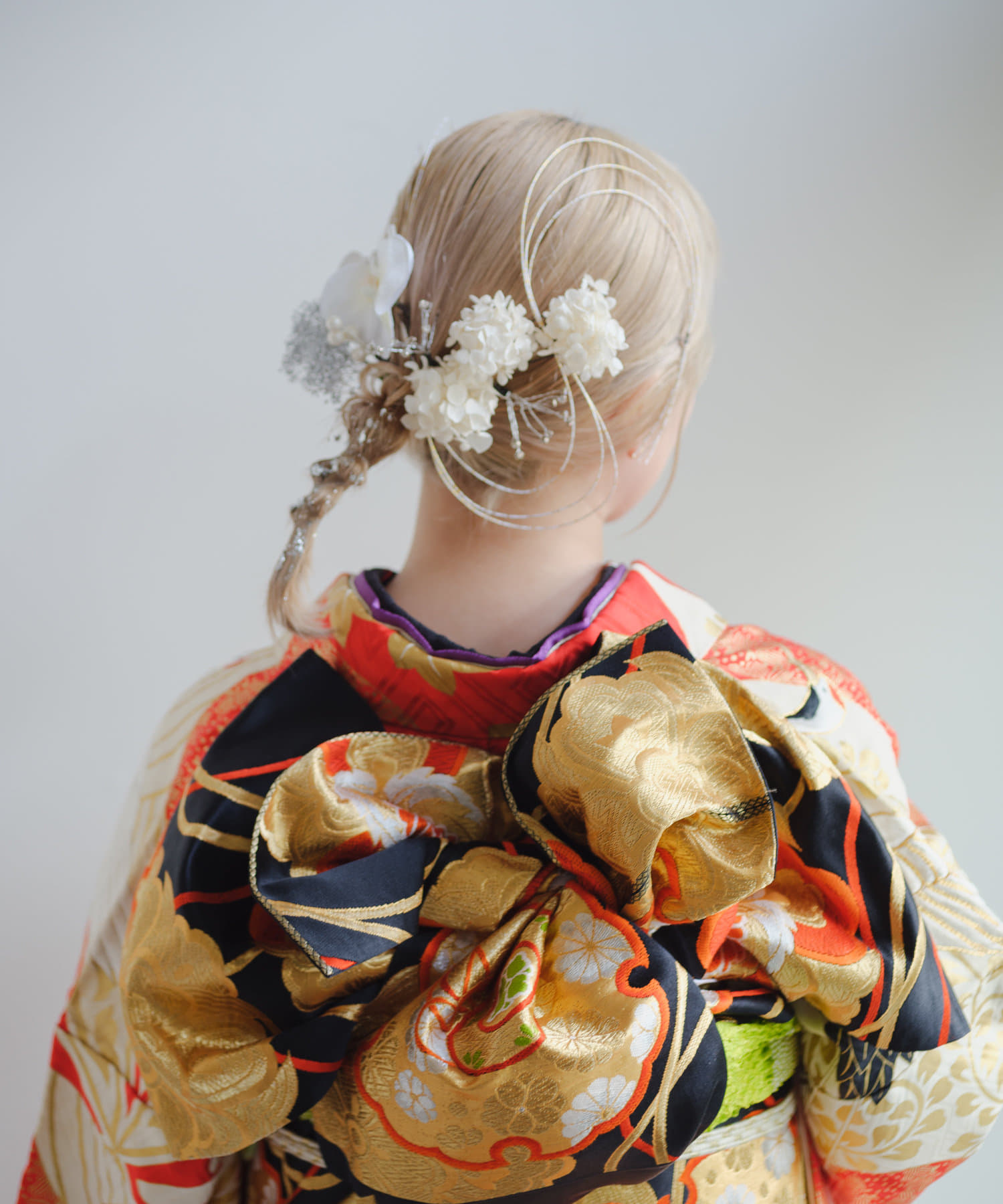 水引を美しい曲線でヘアセットし、金箔を小さくちぎって髪を装飾しました。