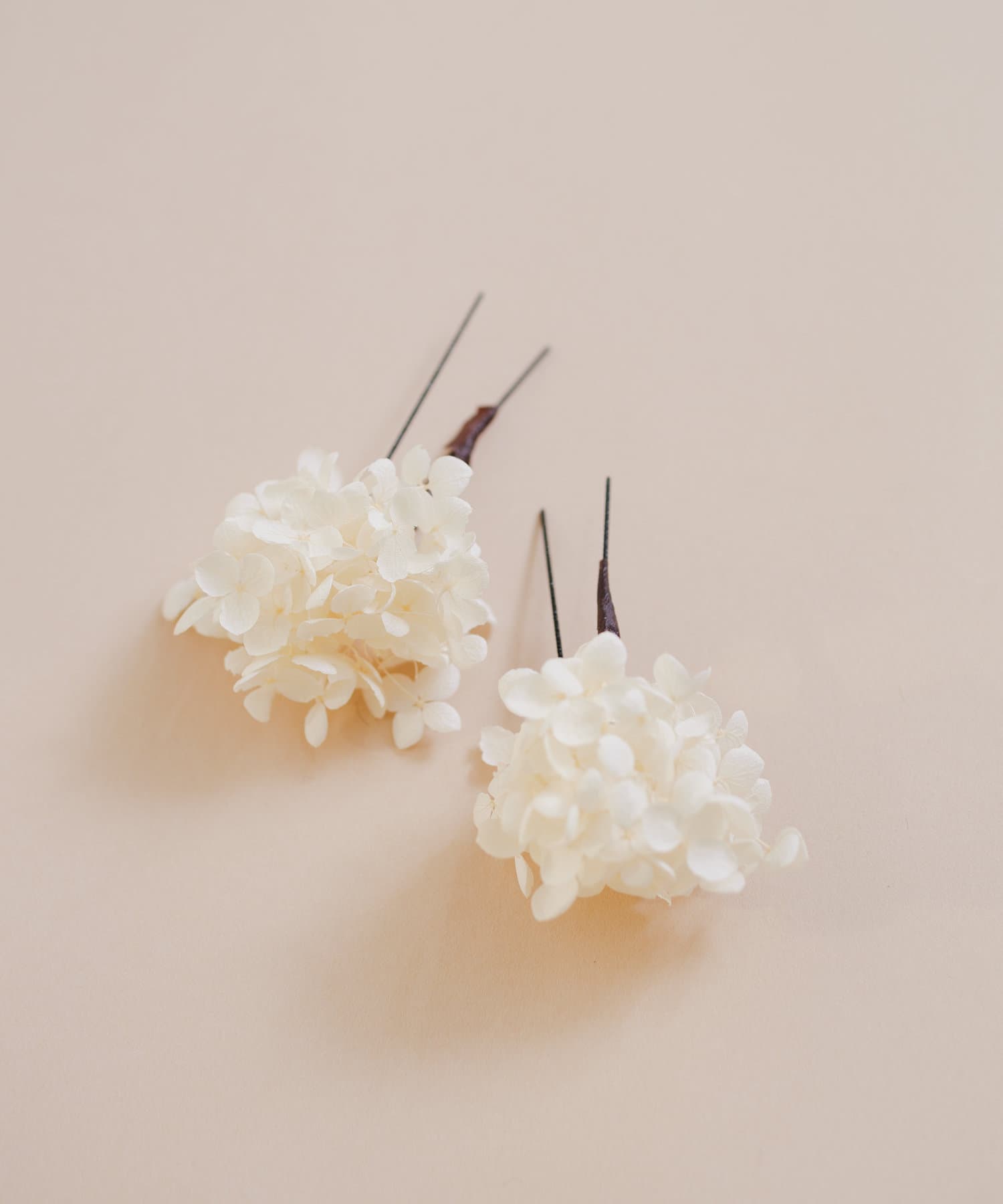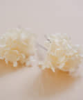 アーティフィシャルフラワーのマム、ブリザーブドフラワーの紫陽花、ドライフラワーのかすみ草の髪飾り。