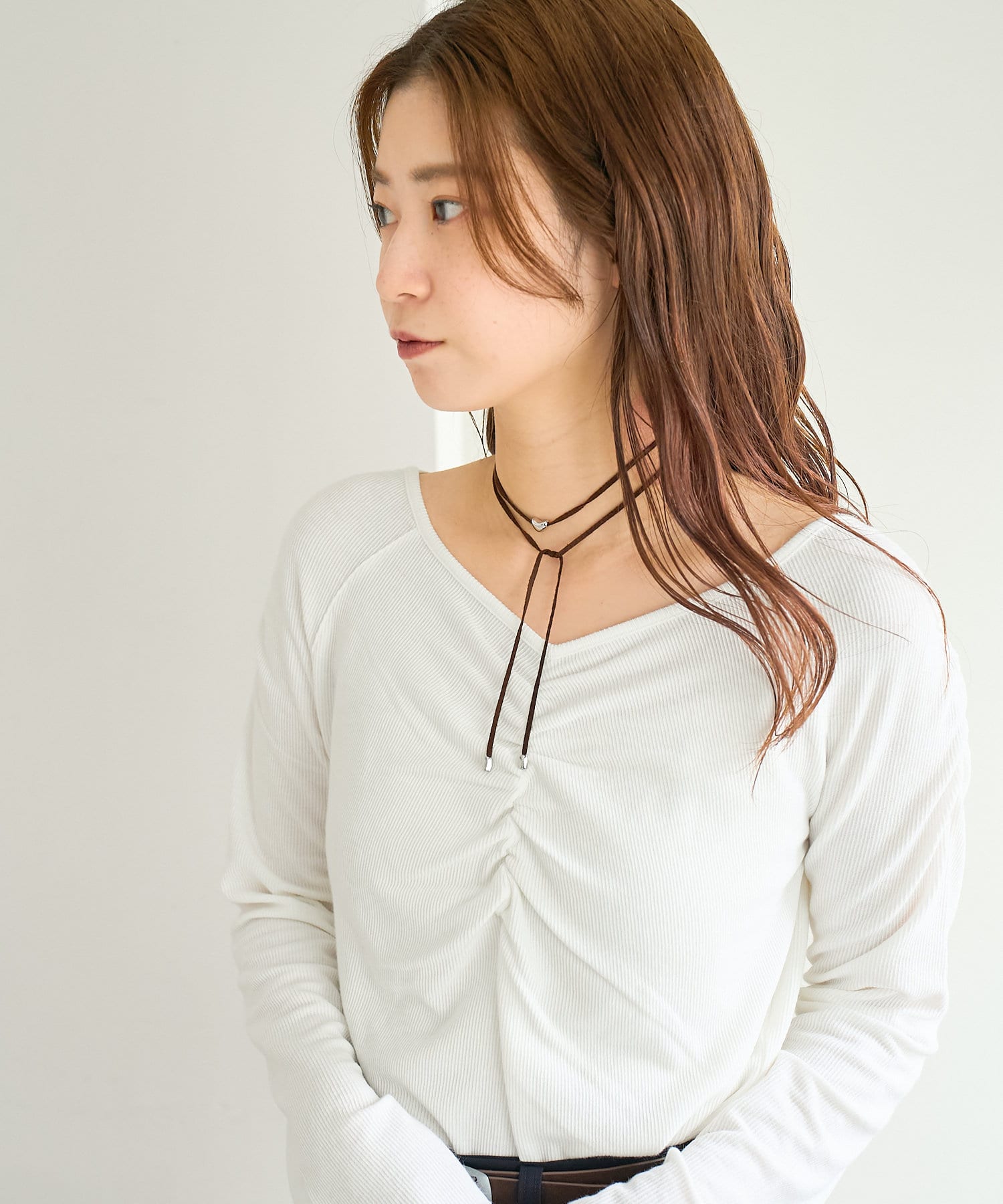 購入場所:パルクローゼット紐が細めなので主張しすぎず合わせやすいです。付け方で色々楽しめます。