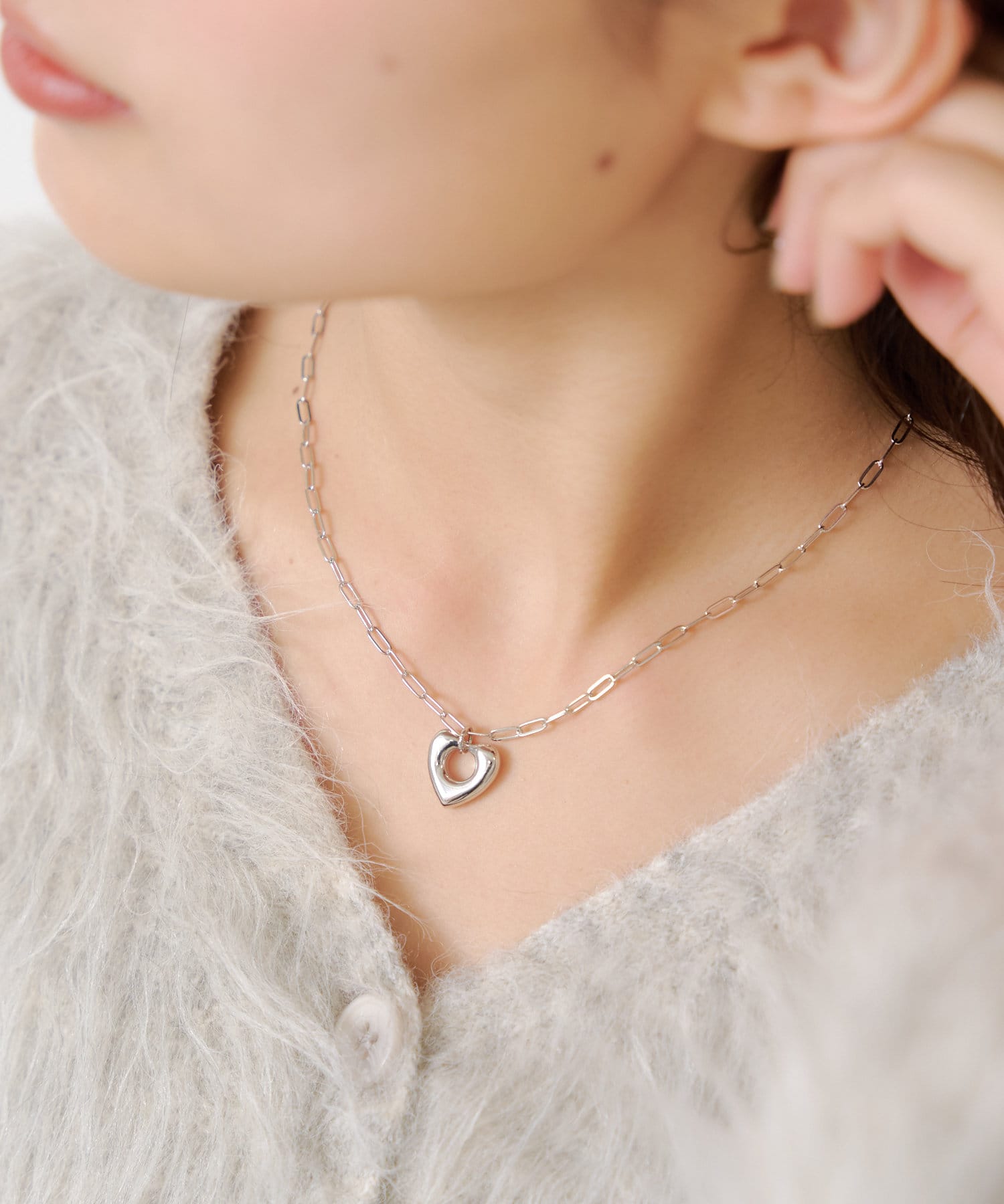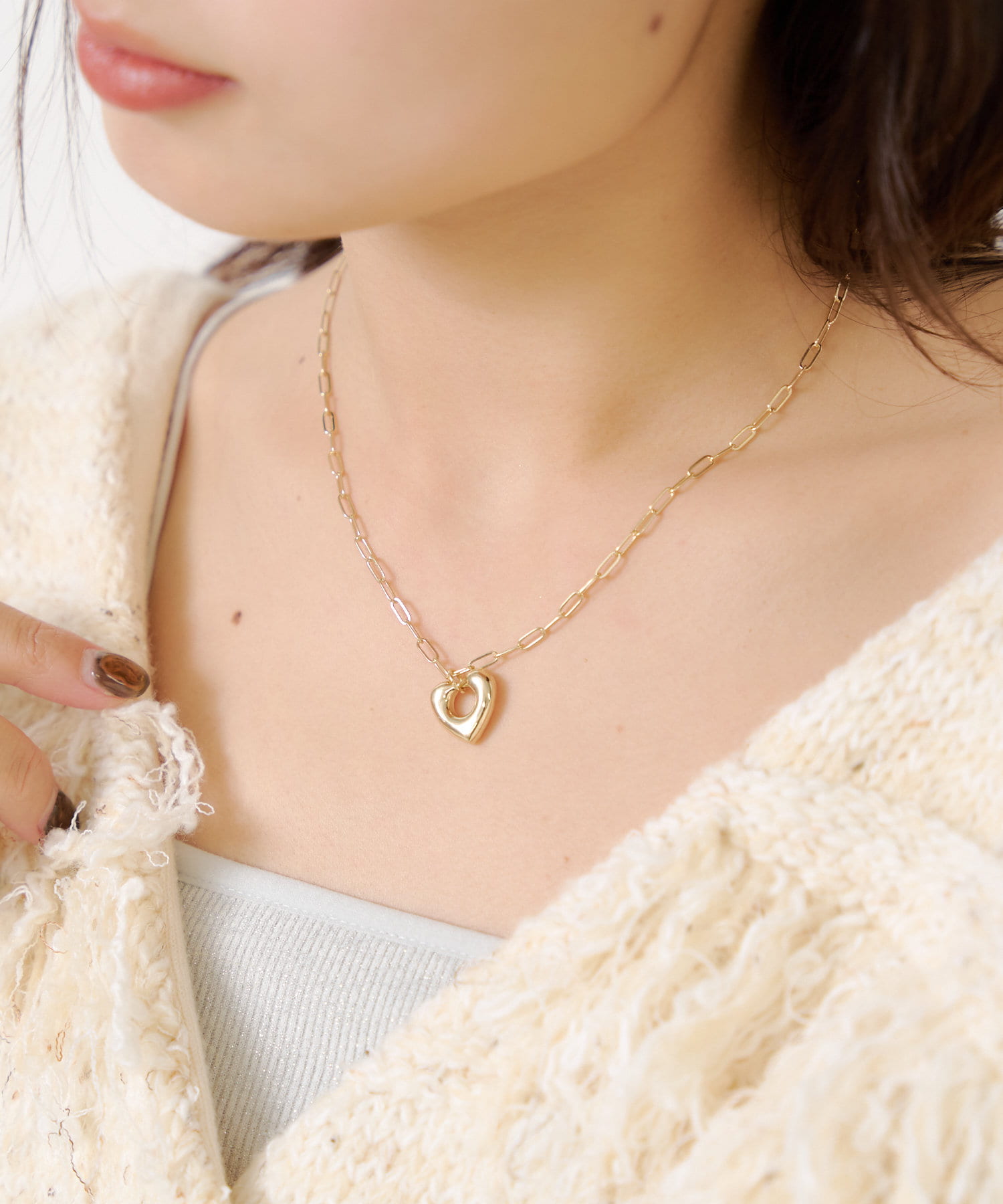 柔らかい曲線で描かれた立体的なハートチャームが、胸元にさりげなく華やかさをプラスしてくれます。