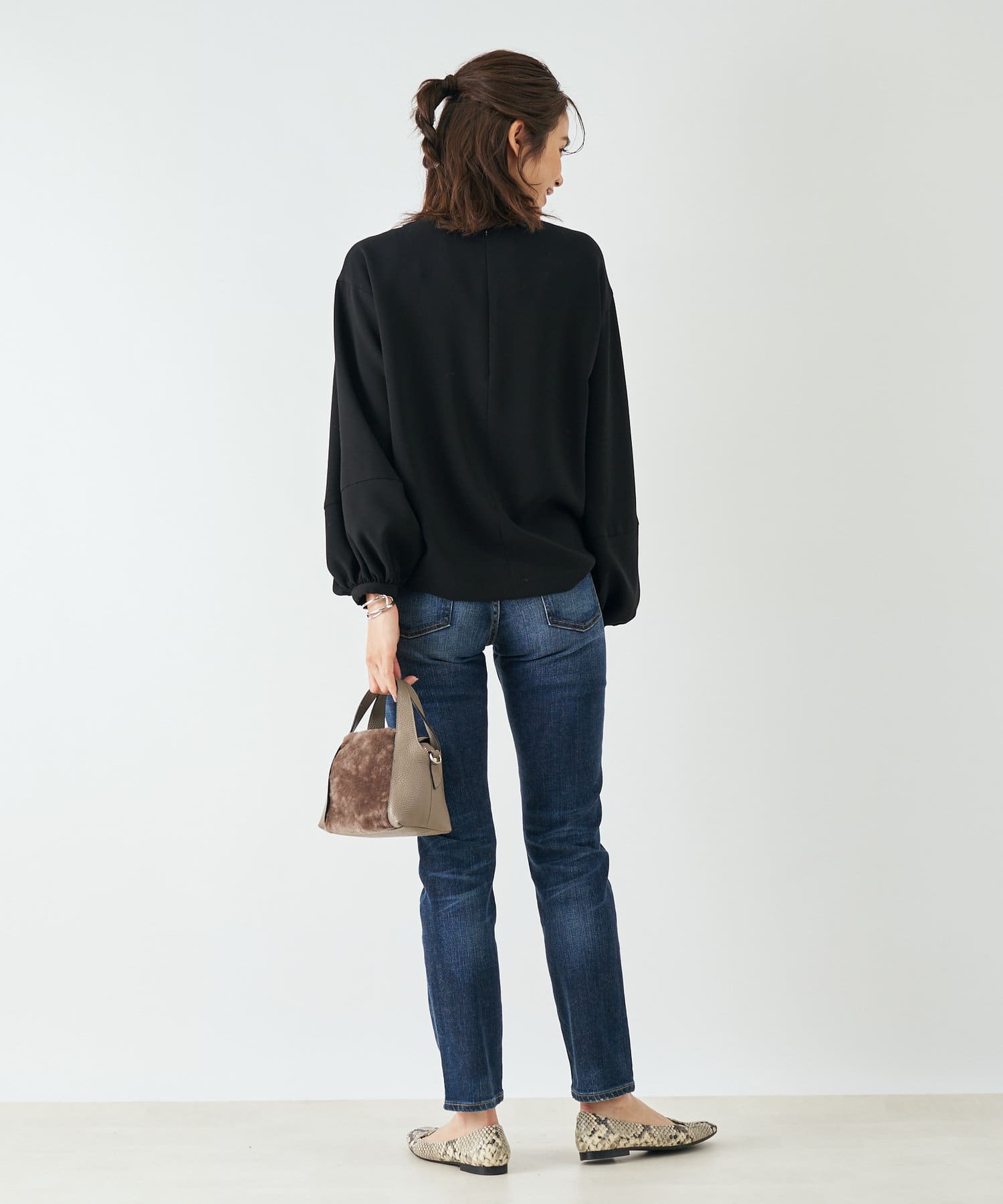 脚を真っ直ぐきれいに見せてくれるシルエットで、カジュアルスタイルはもちろん、フェミニンなスタイルも馴染むアイテムです。
