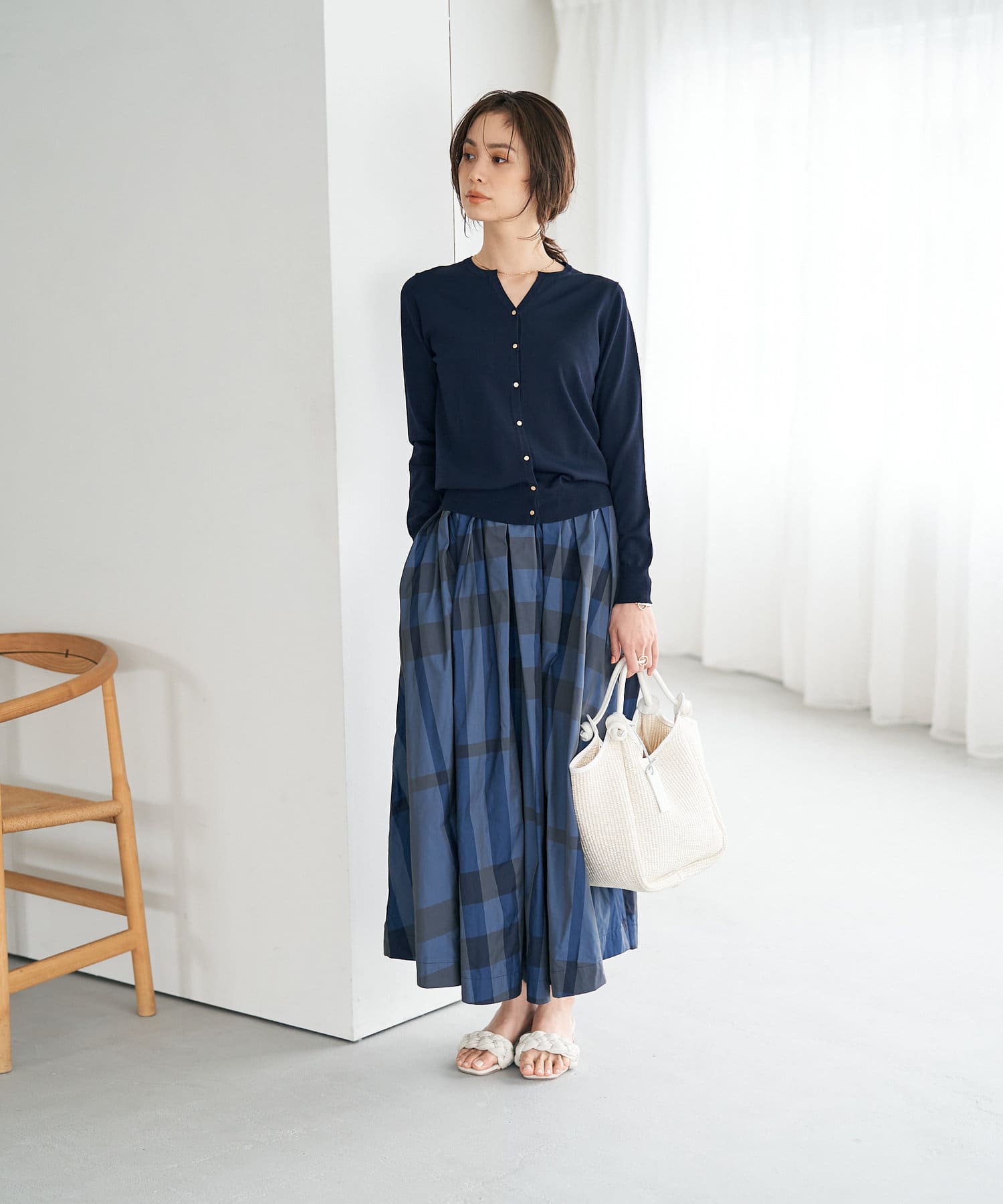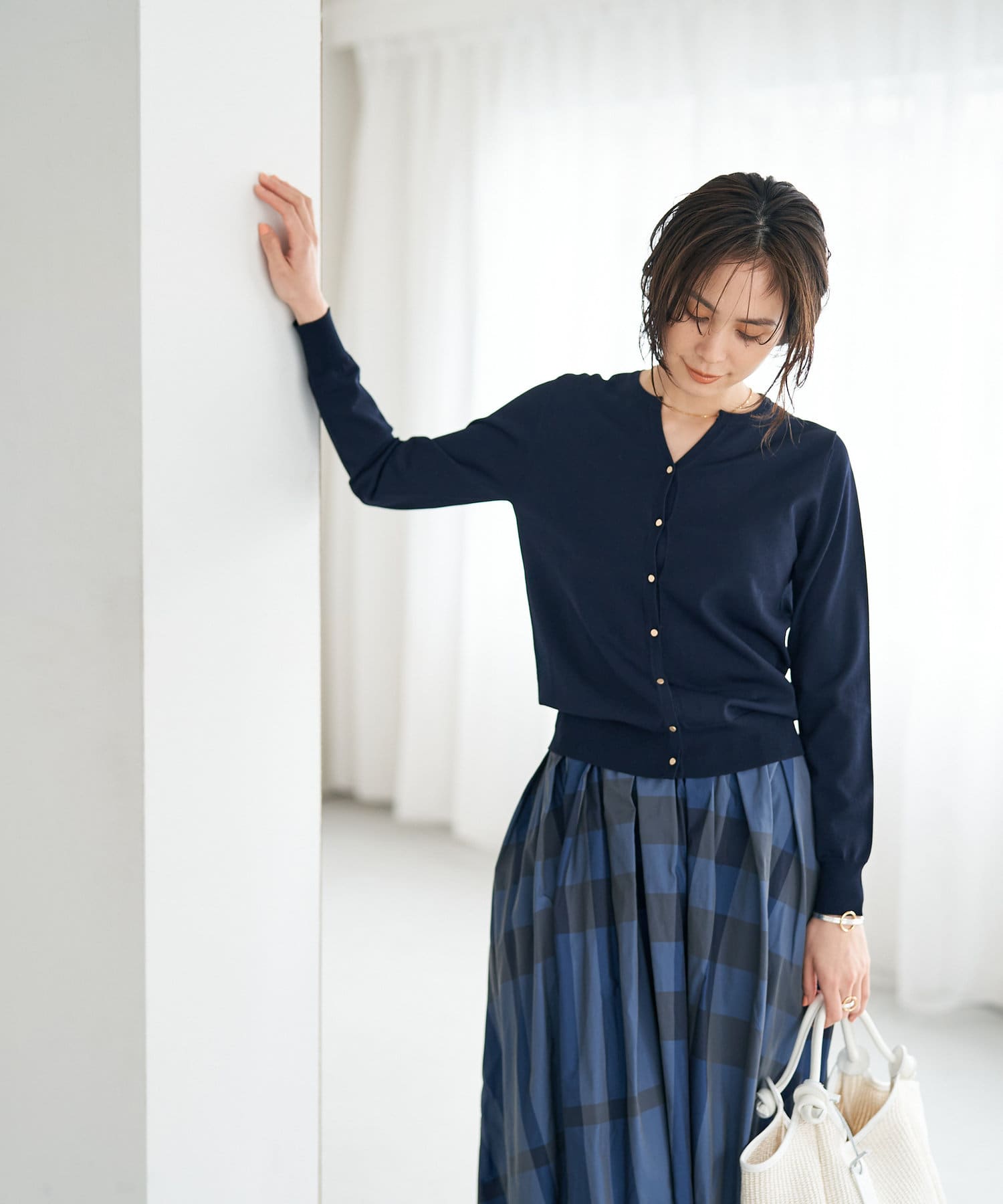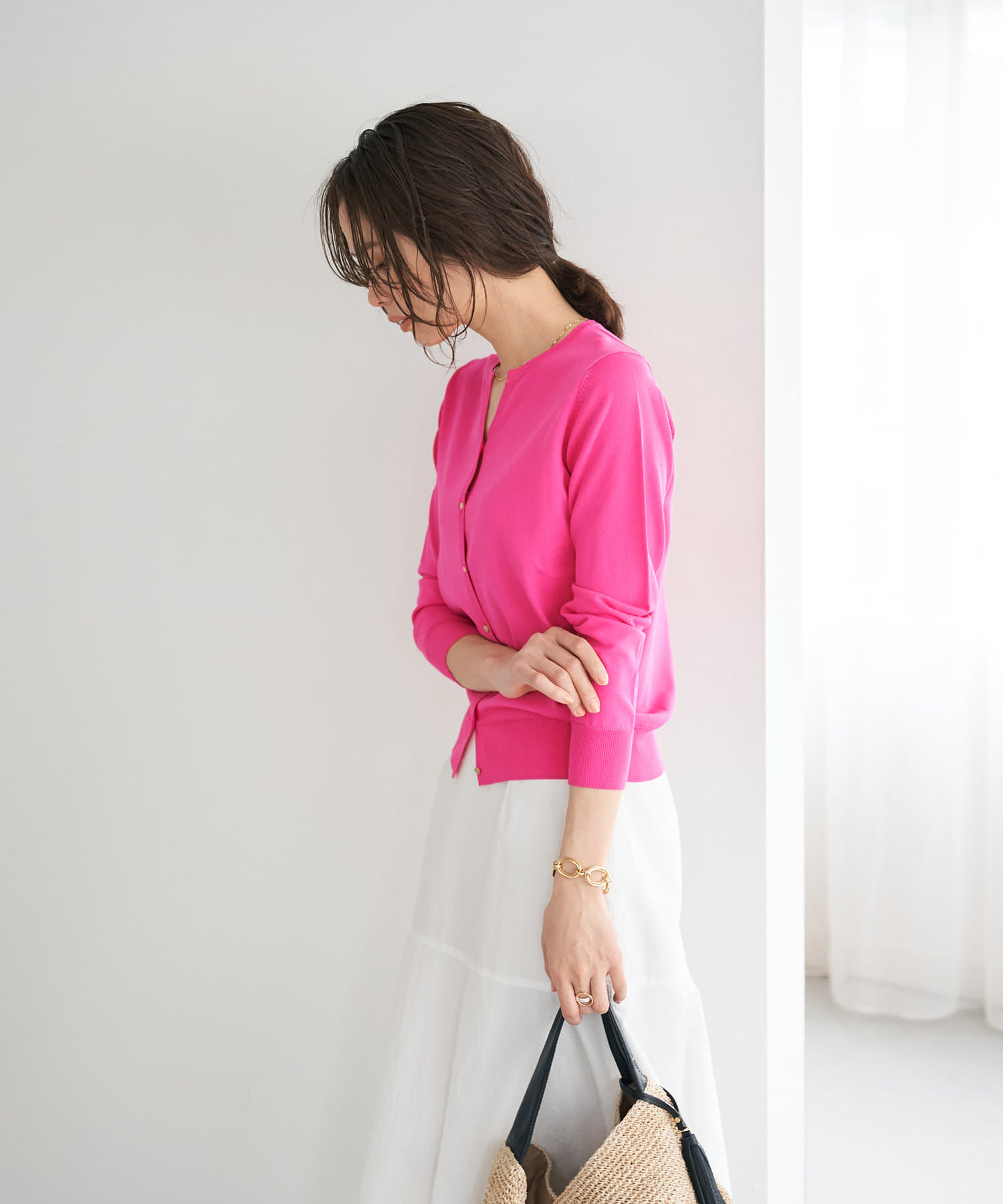 さらりとしたタッチなのでブラウスやカットソー・ワンピースやノースリーブなどの羽織にも最適。
