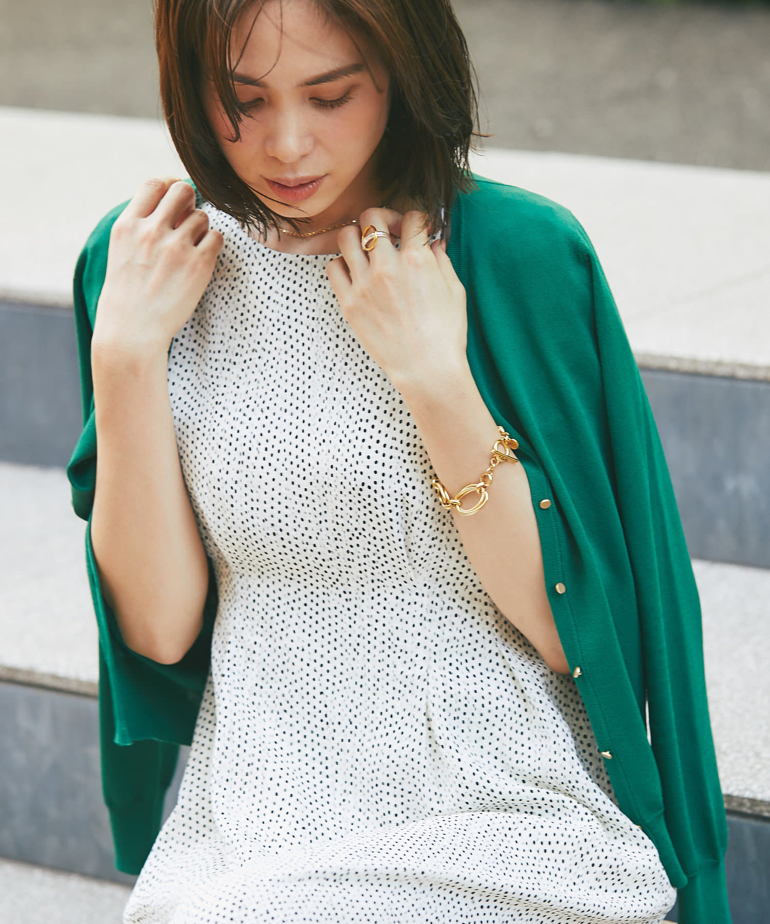 ゴールドの釦が上品な印象の女性らしい雰囲気のアイテムです。