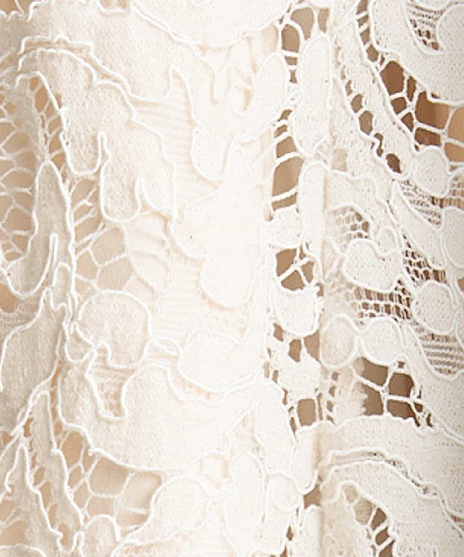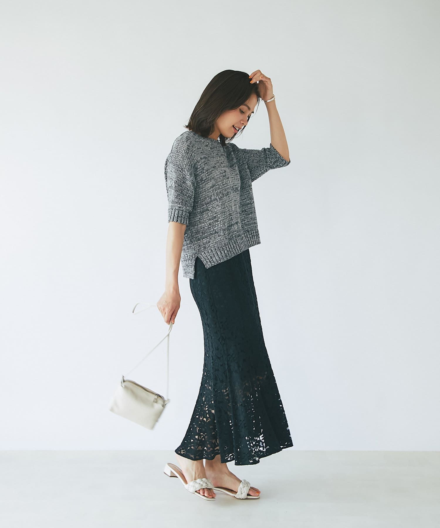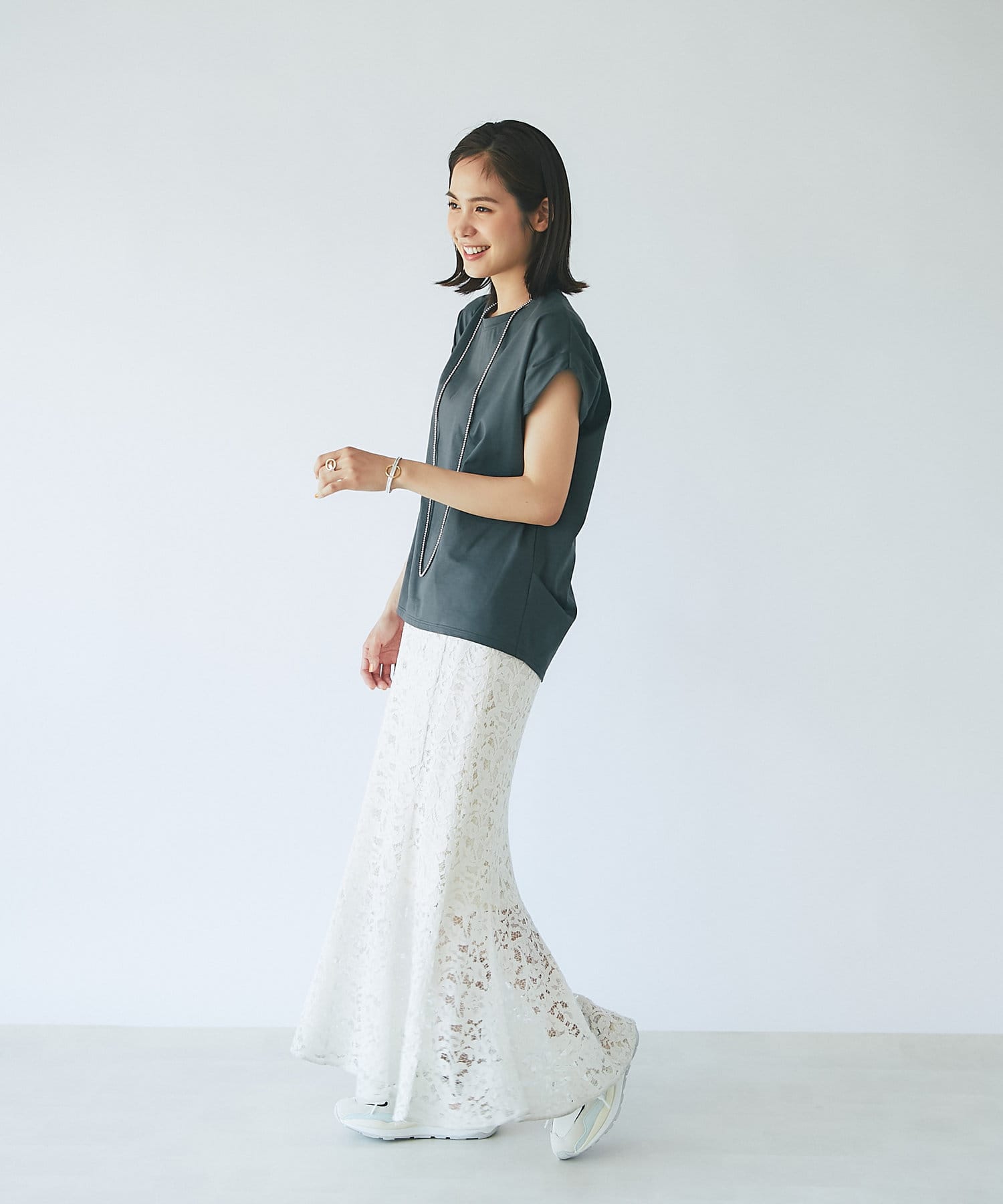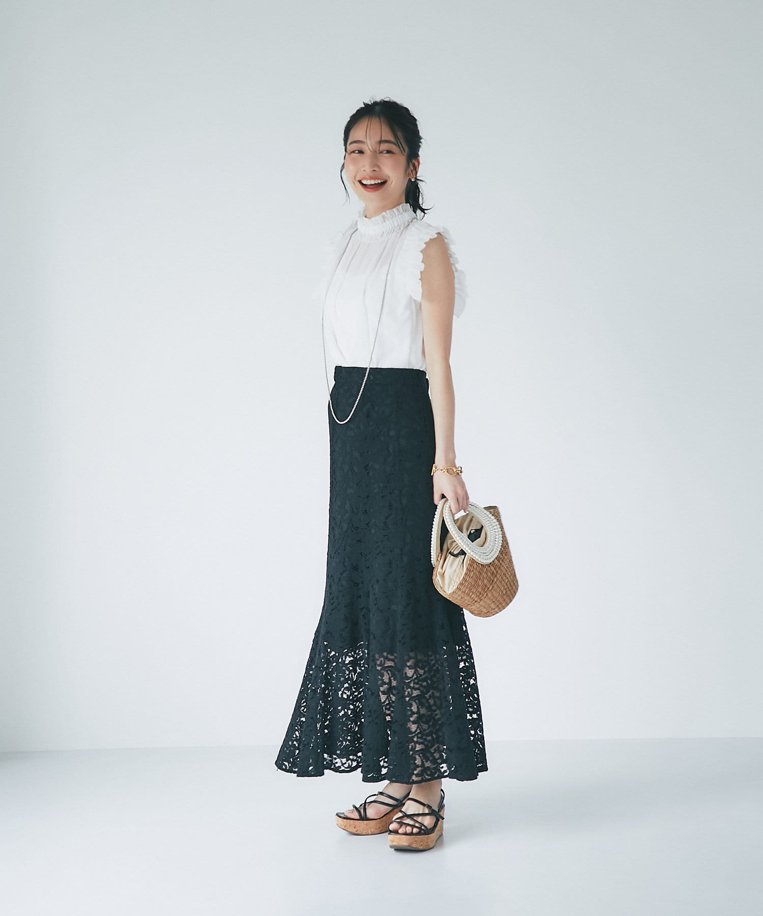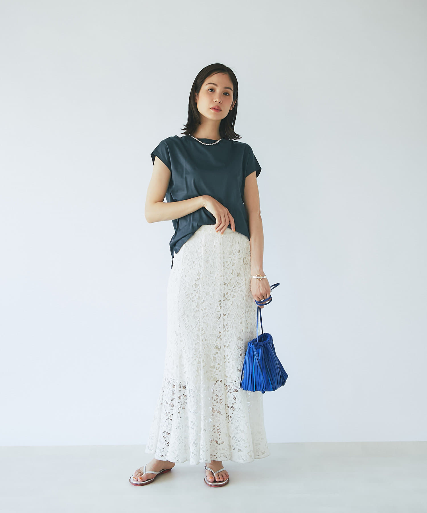 裏地は短めにする事で、レースの隙間から覗くヘルシーな肌見せが抜け感と大人の女性の雰囲気に。