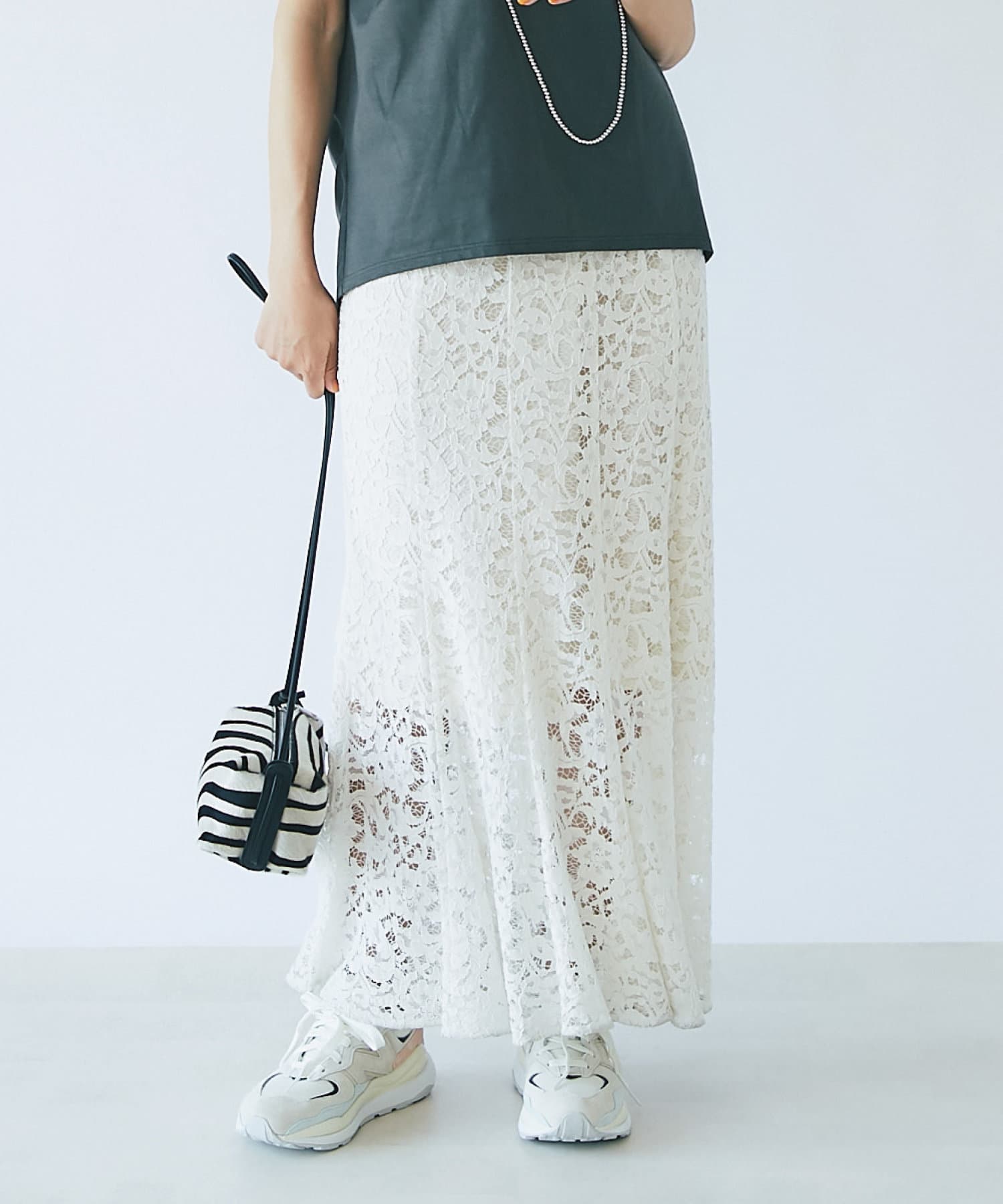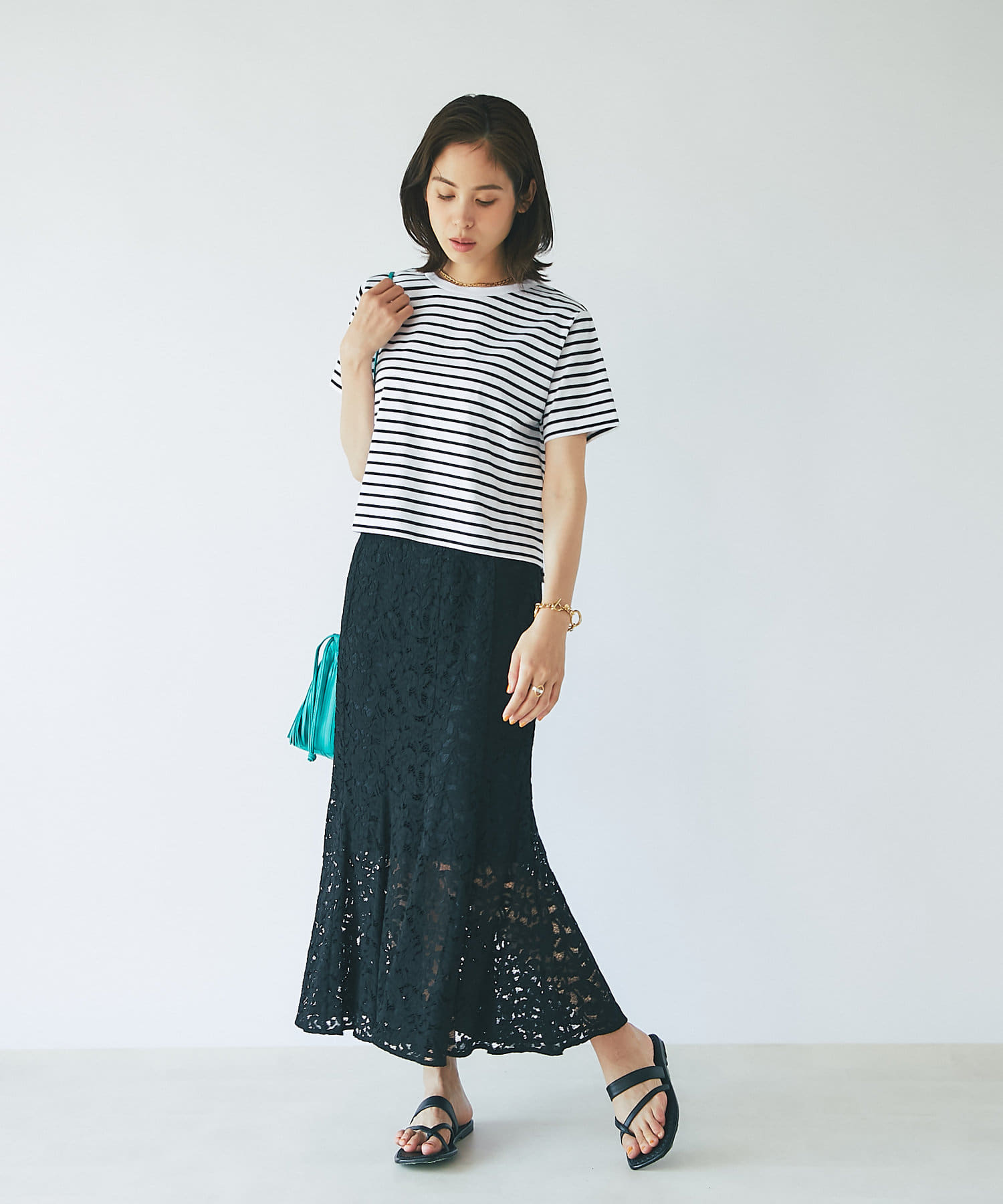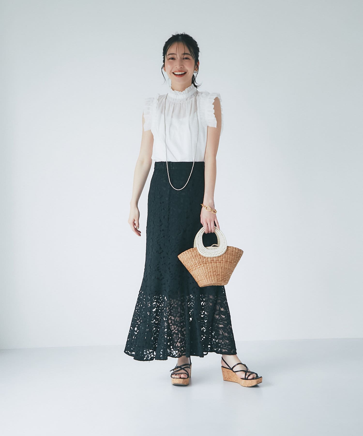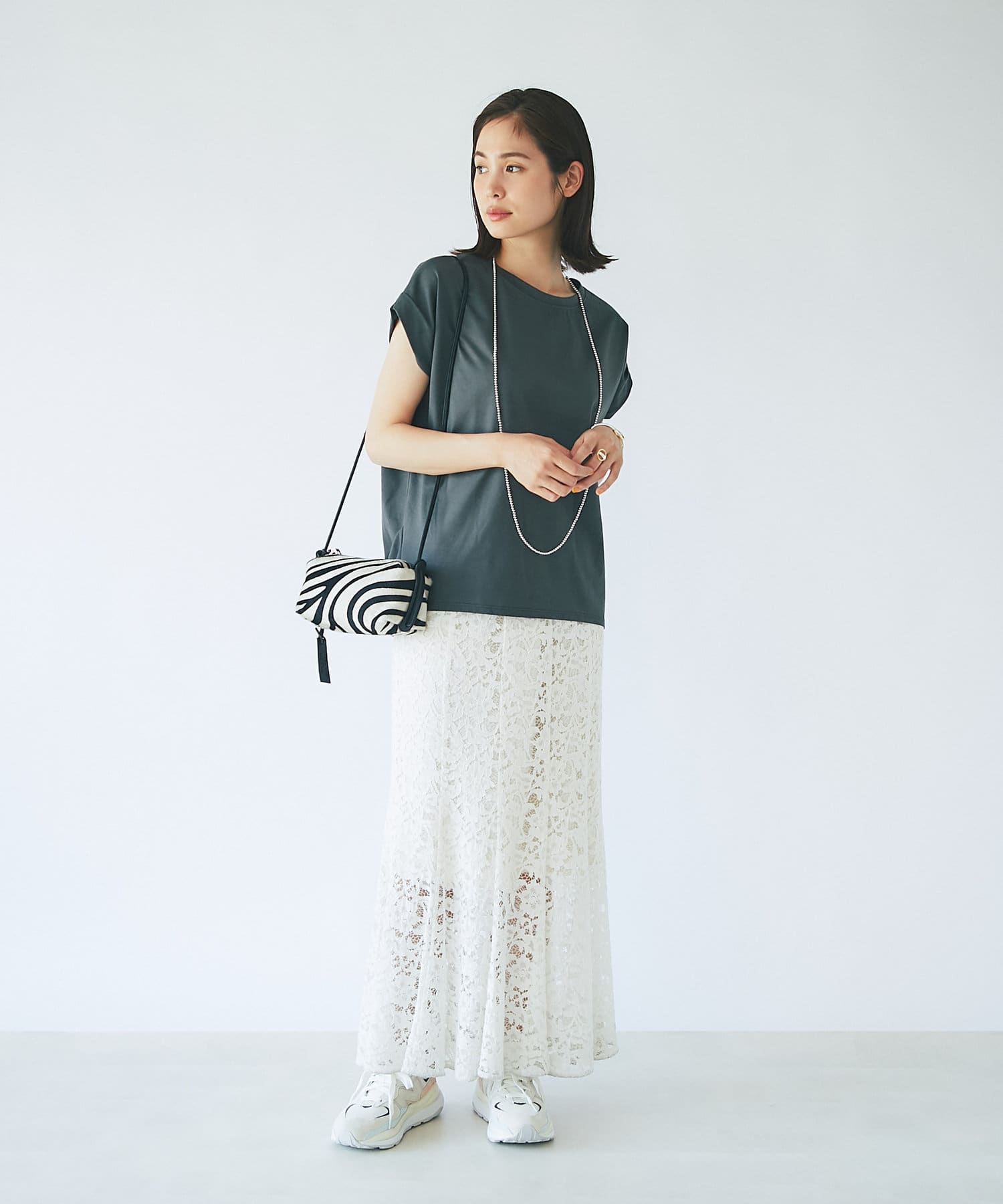 裏地は短めにする事で、レースの隙間から覗くヘルシーな肌見せが抜け感と大人の女性の雰囲気に。
