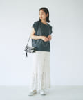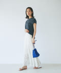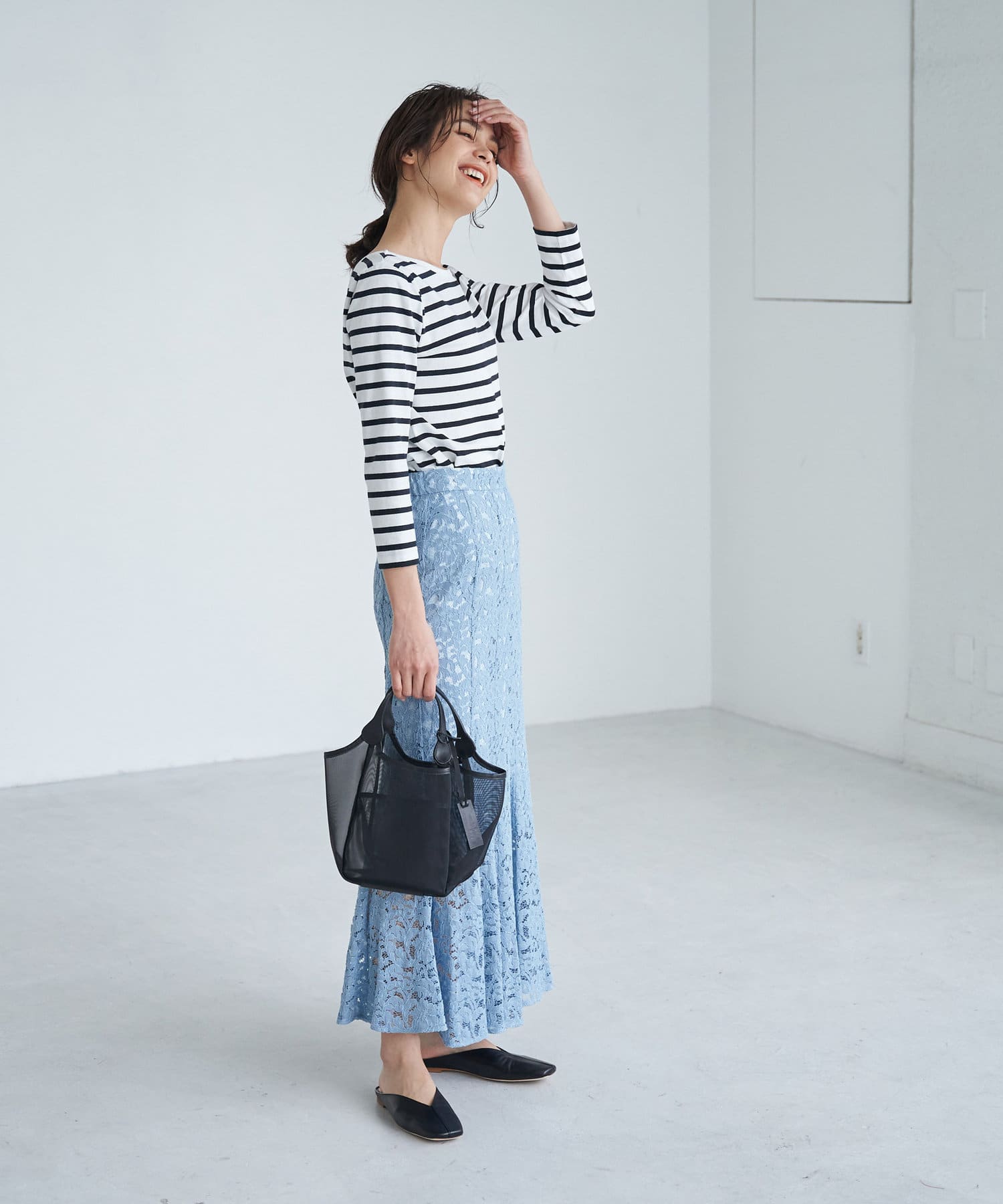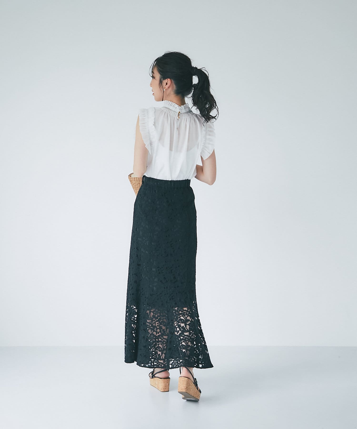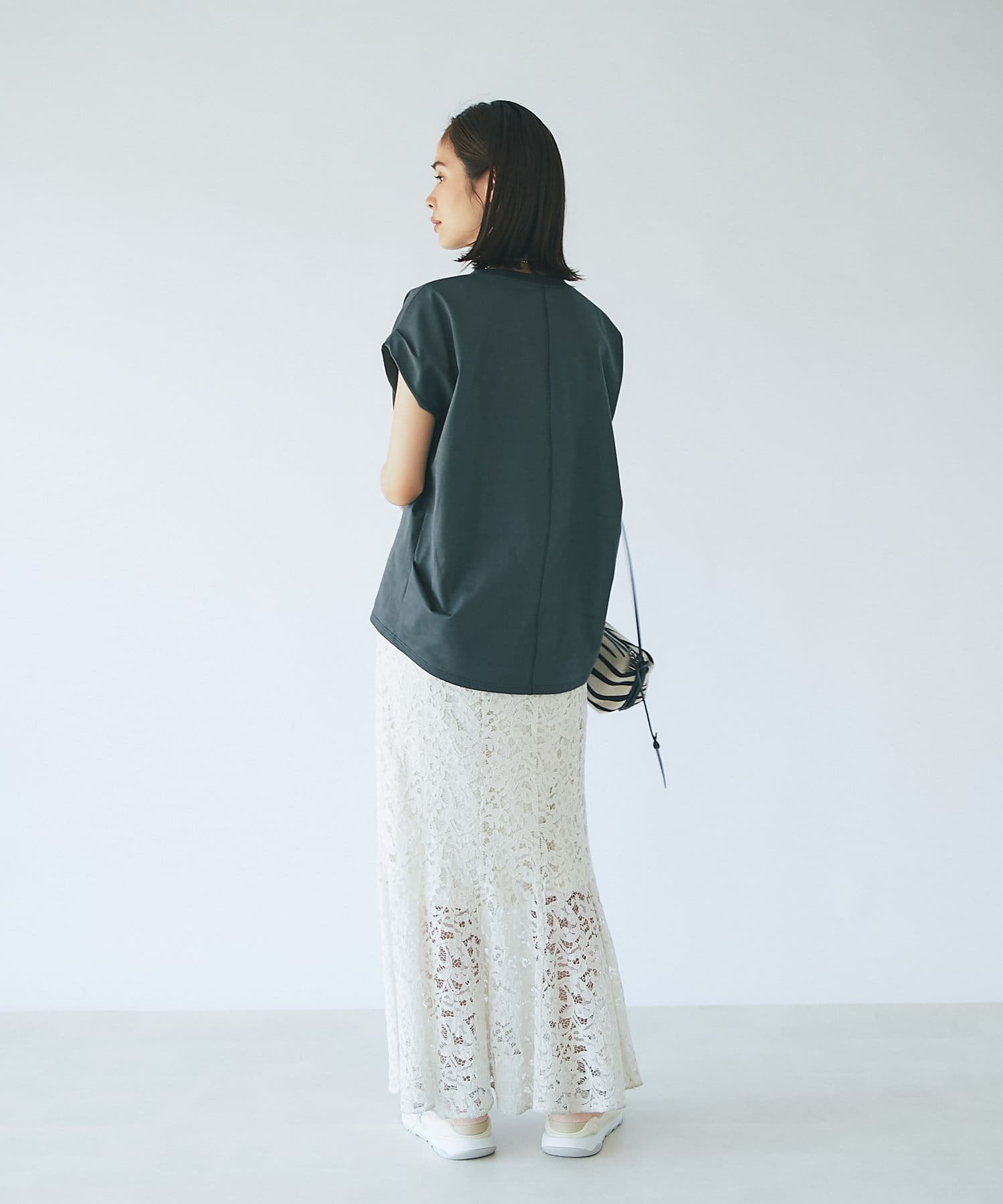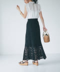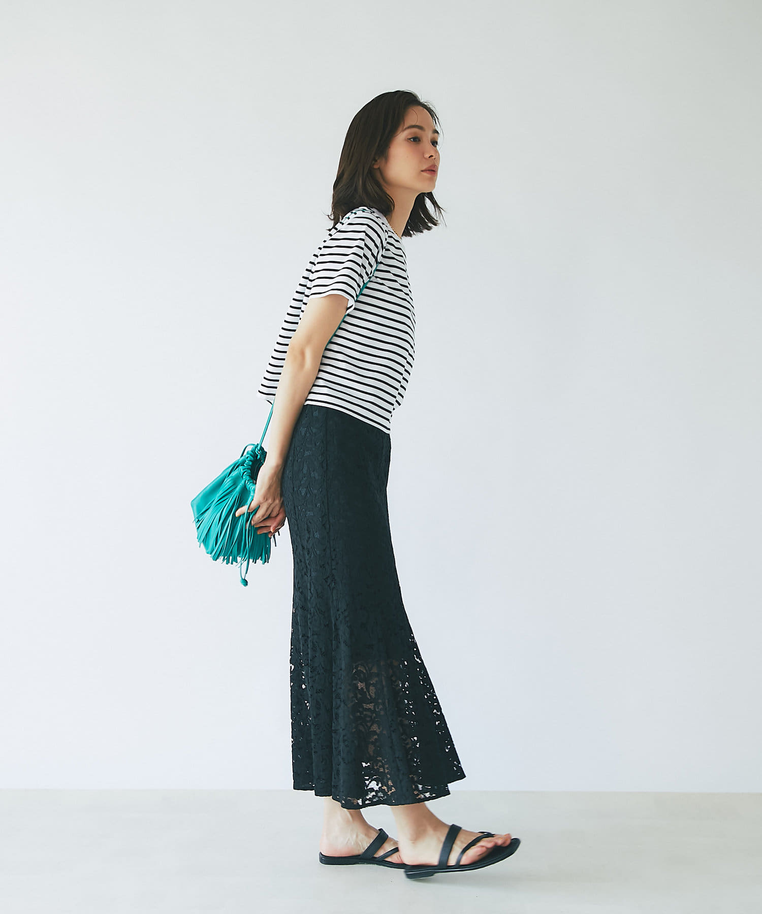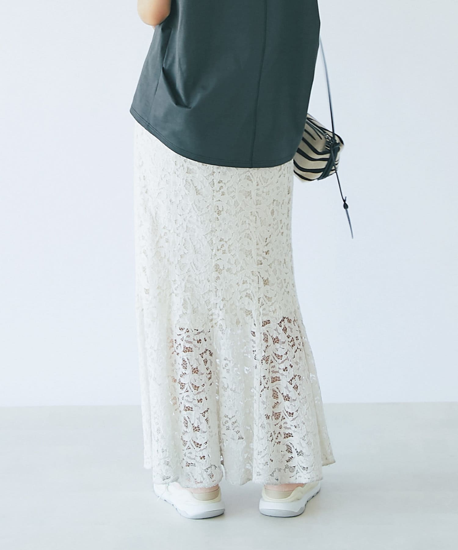 裏地は短めにする事で、レースの隙間から覗くヘルシーな肌見せが抜け感と大人の女性の雰囲気に。