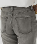 ハイライズで腰の位置を高く見せる美脚効果のデニムパンツ