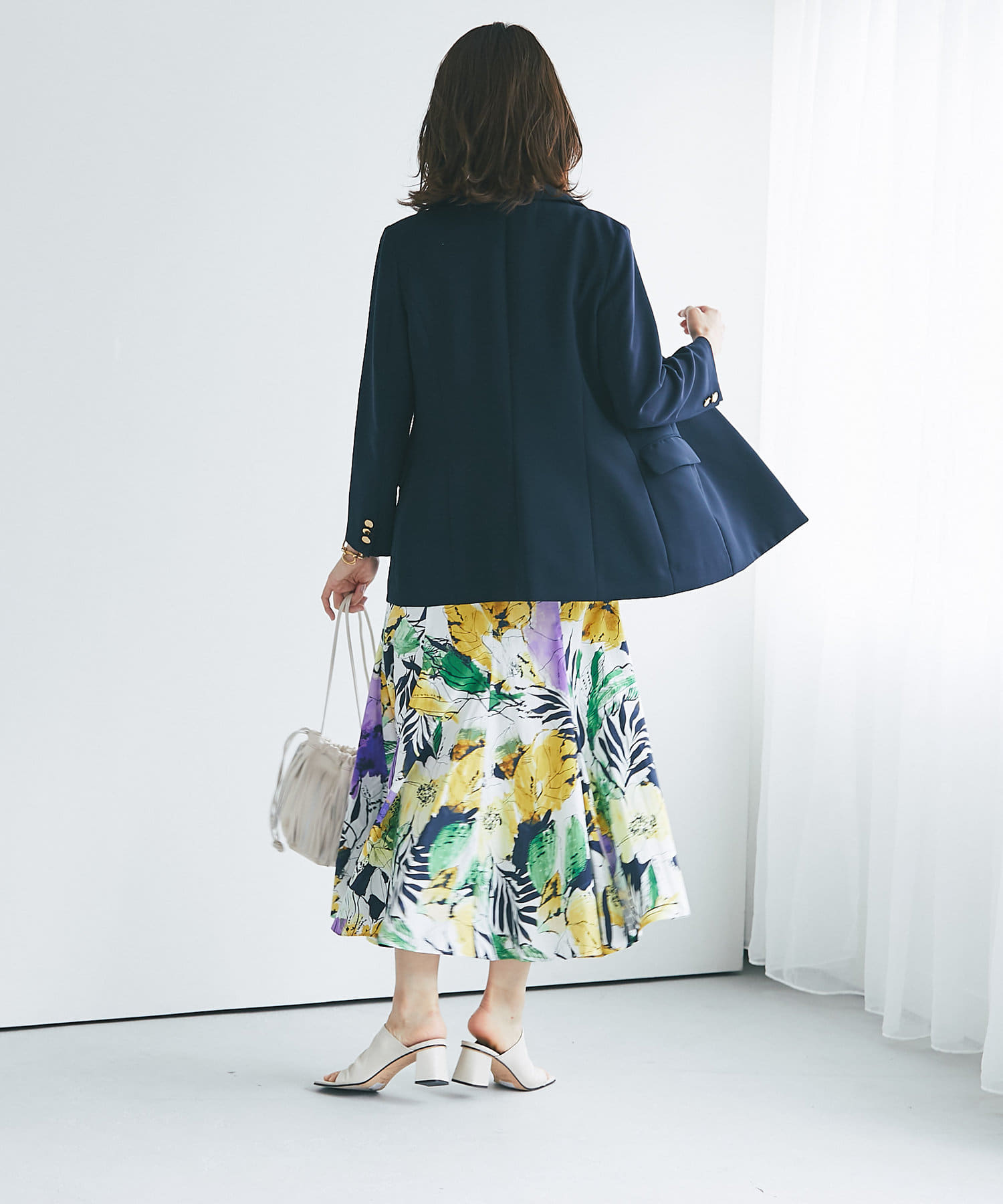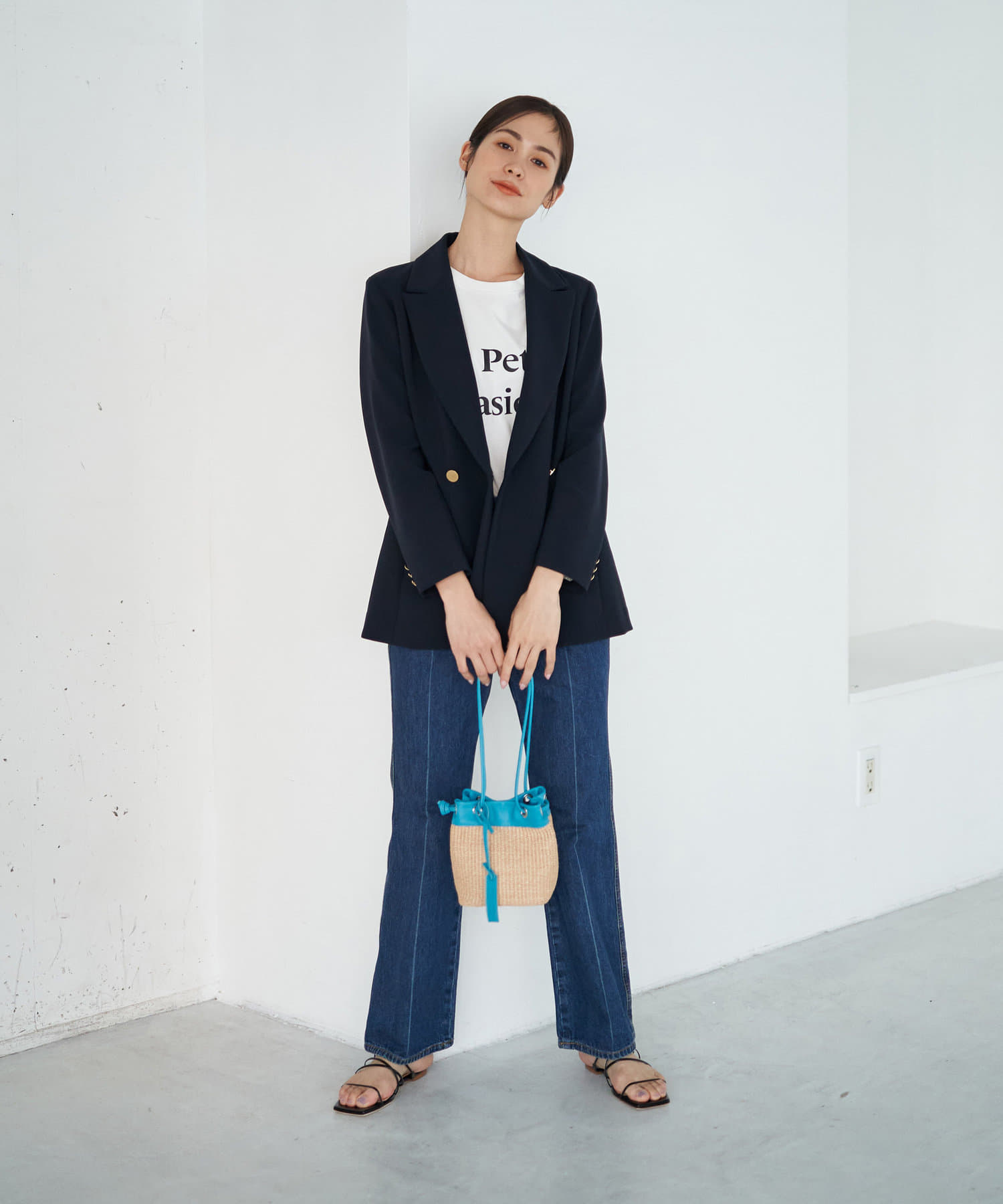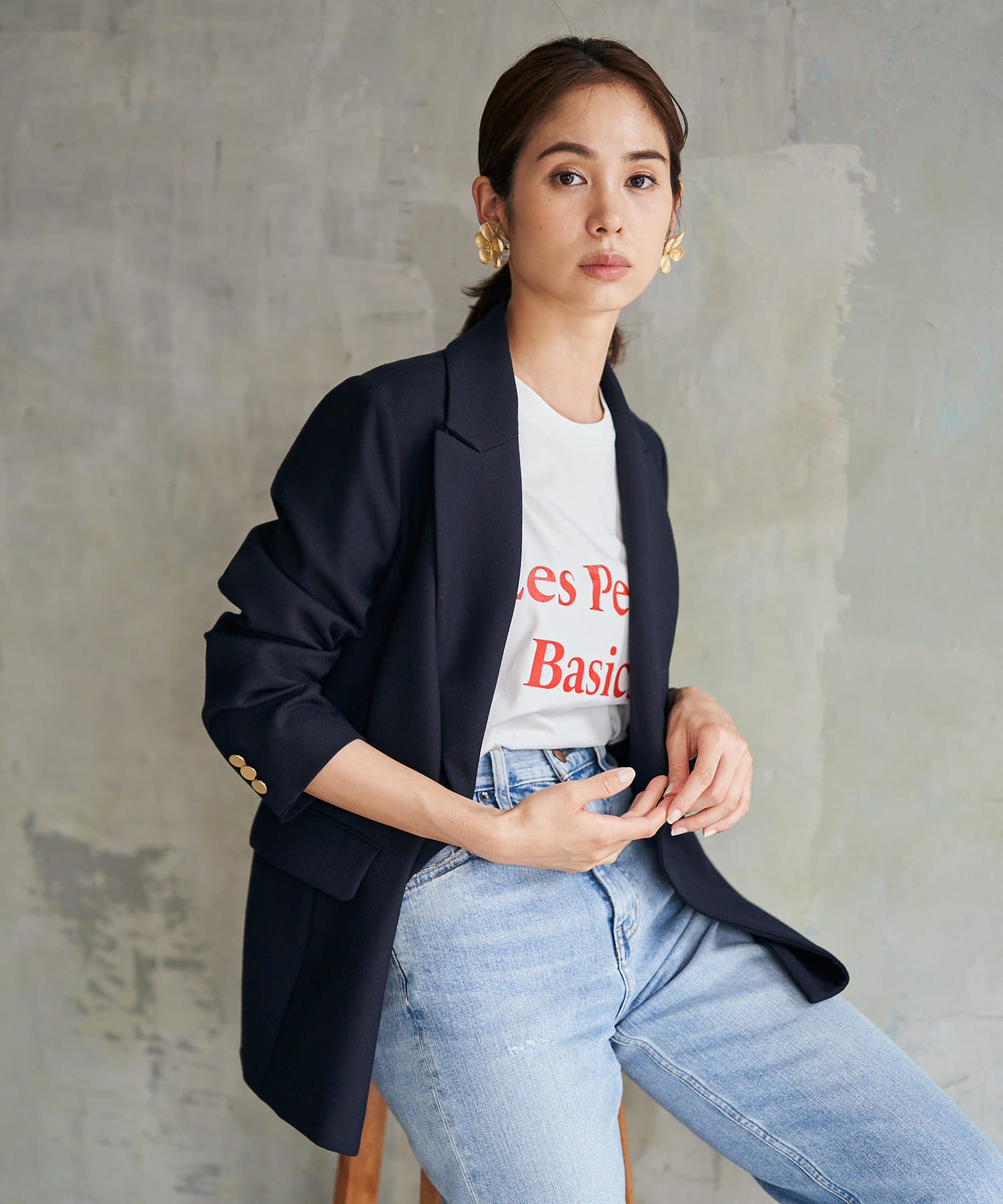 ジャケットは、ダブルのボタン位置がウエストより少し上にあるので、着るだけでメリハリが出て、スタイルアップ効果があります。