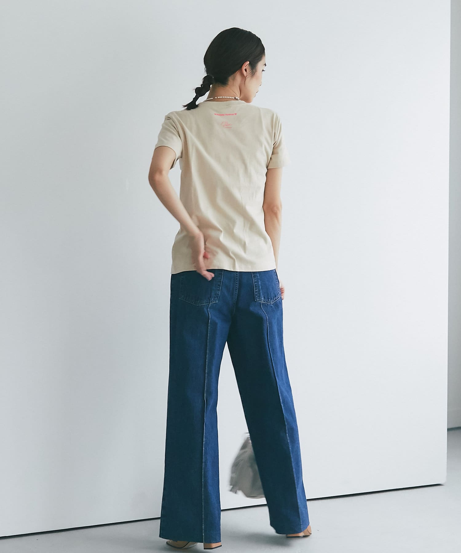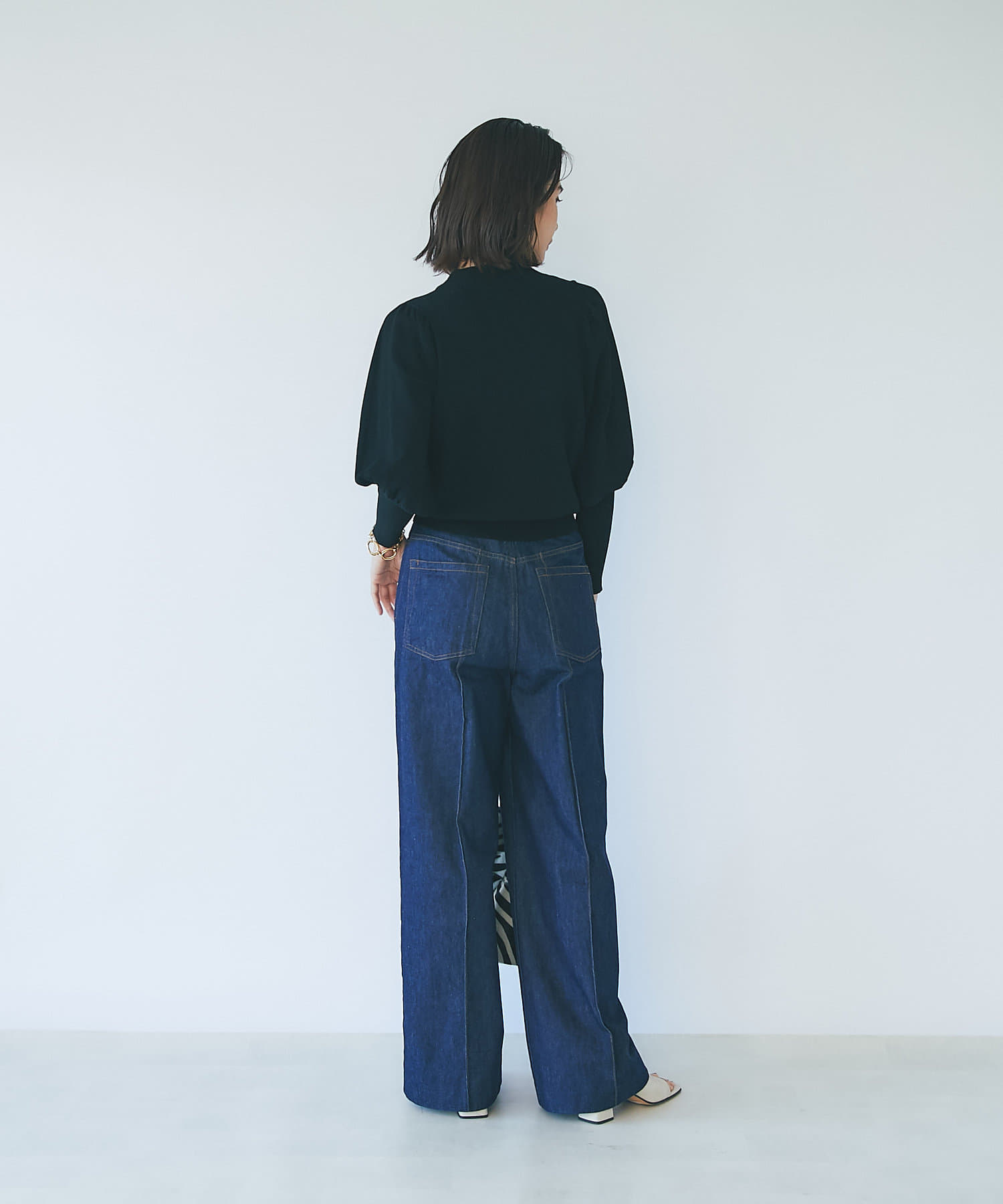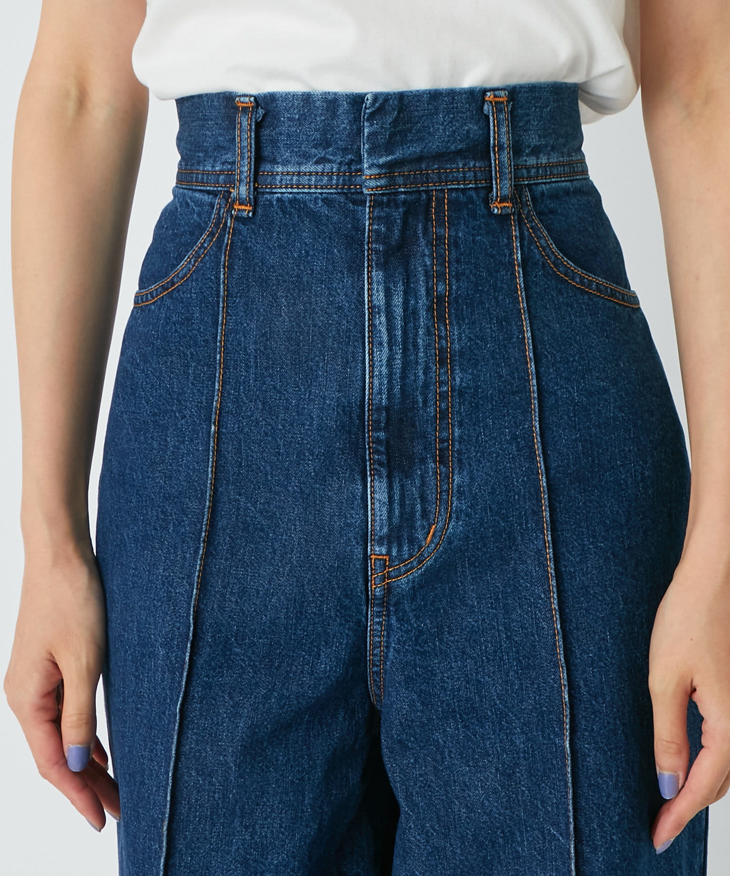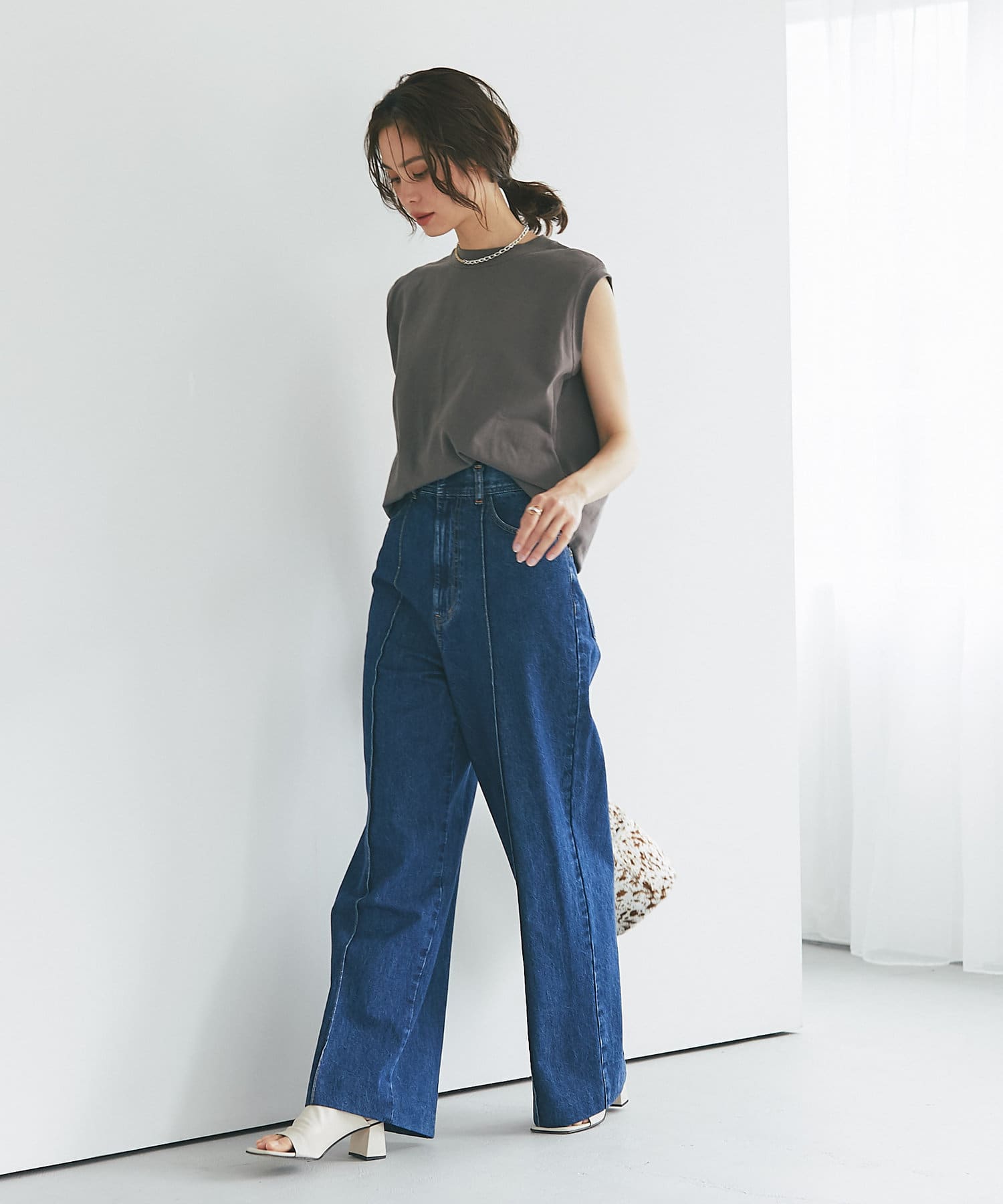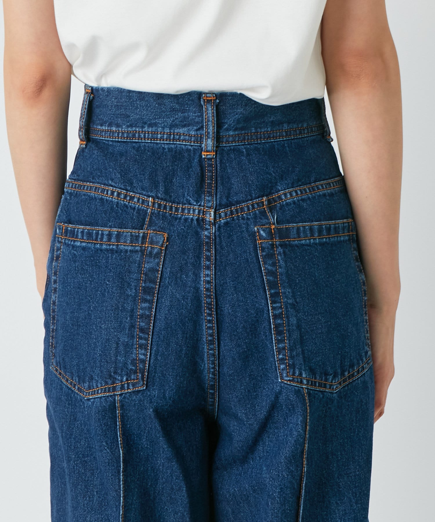 ハイウエストで全体的に目線が上になるので、脚長効果抜群のシルエット。
