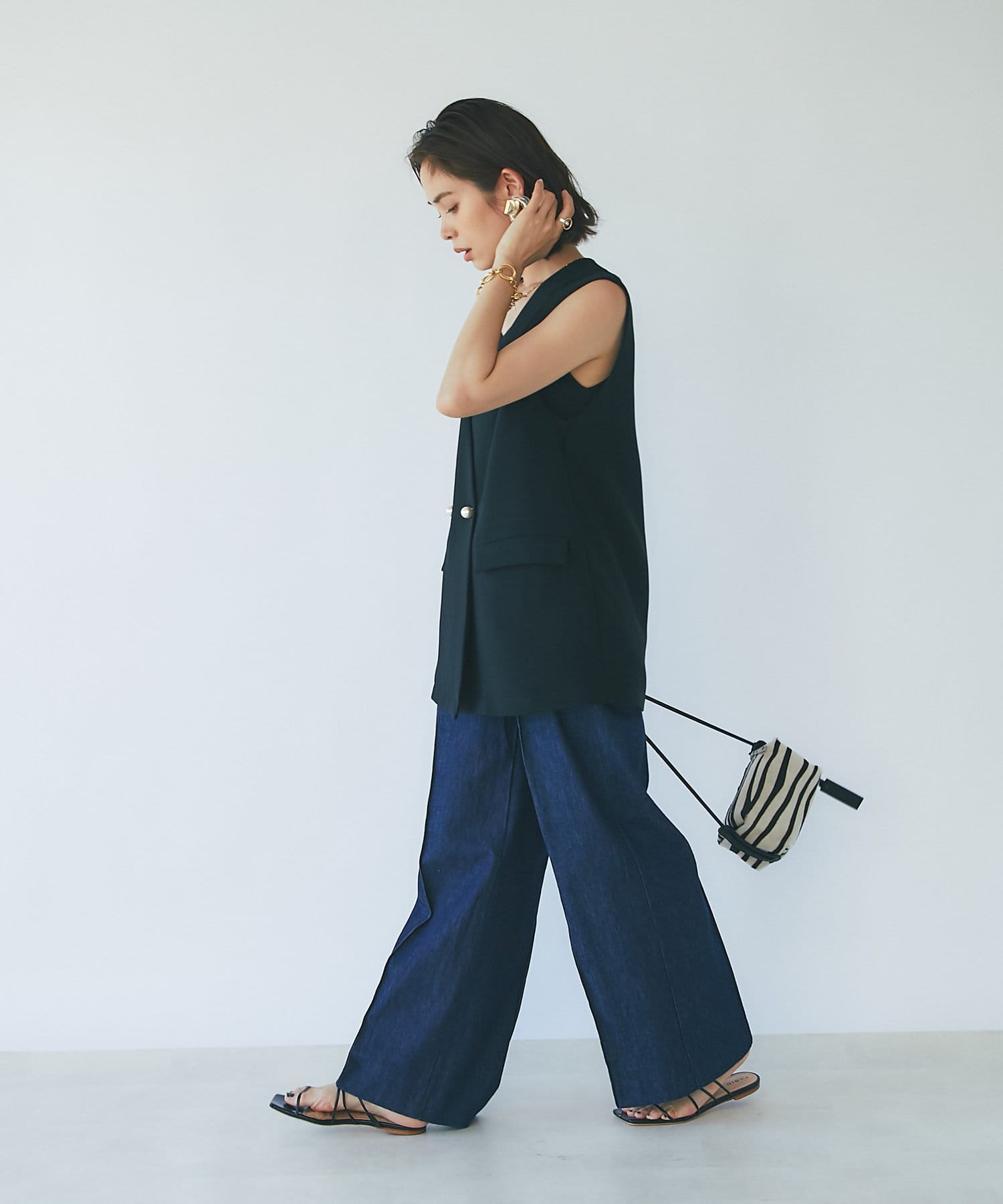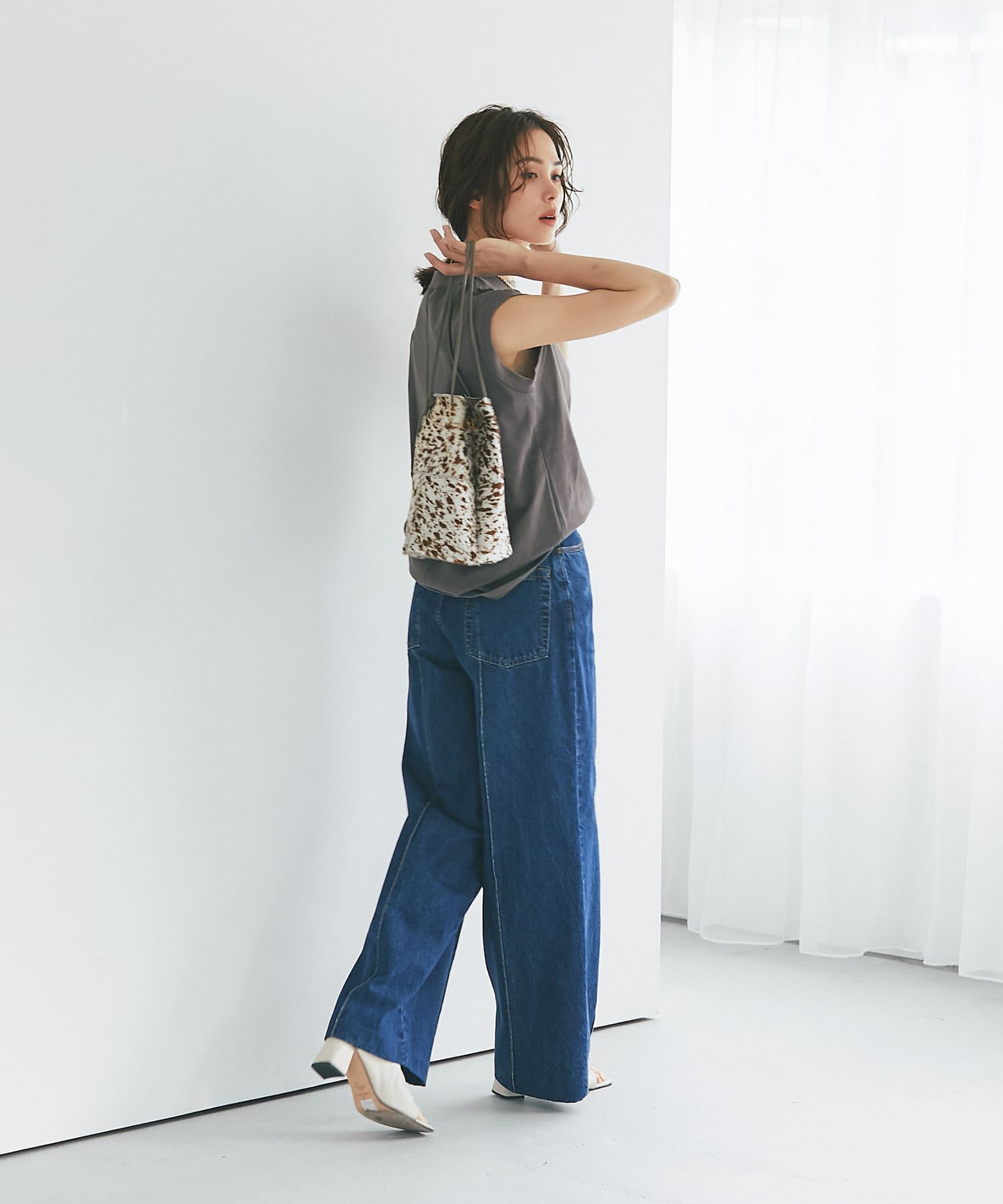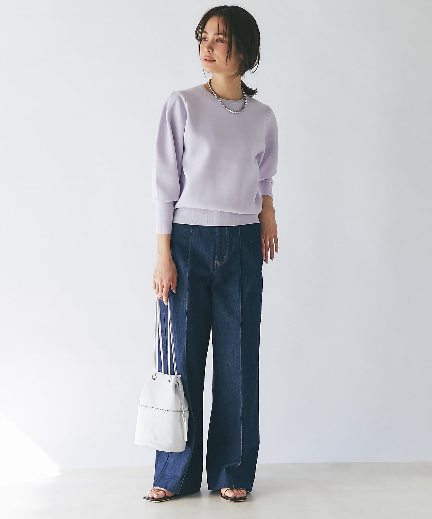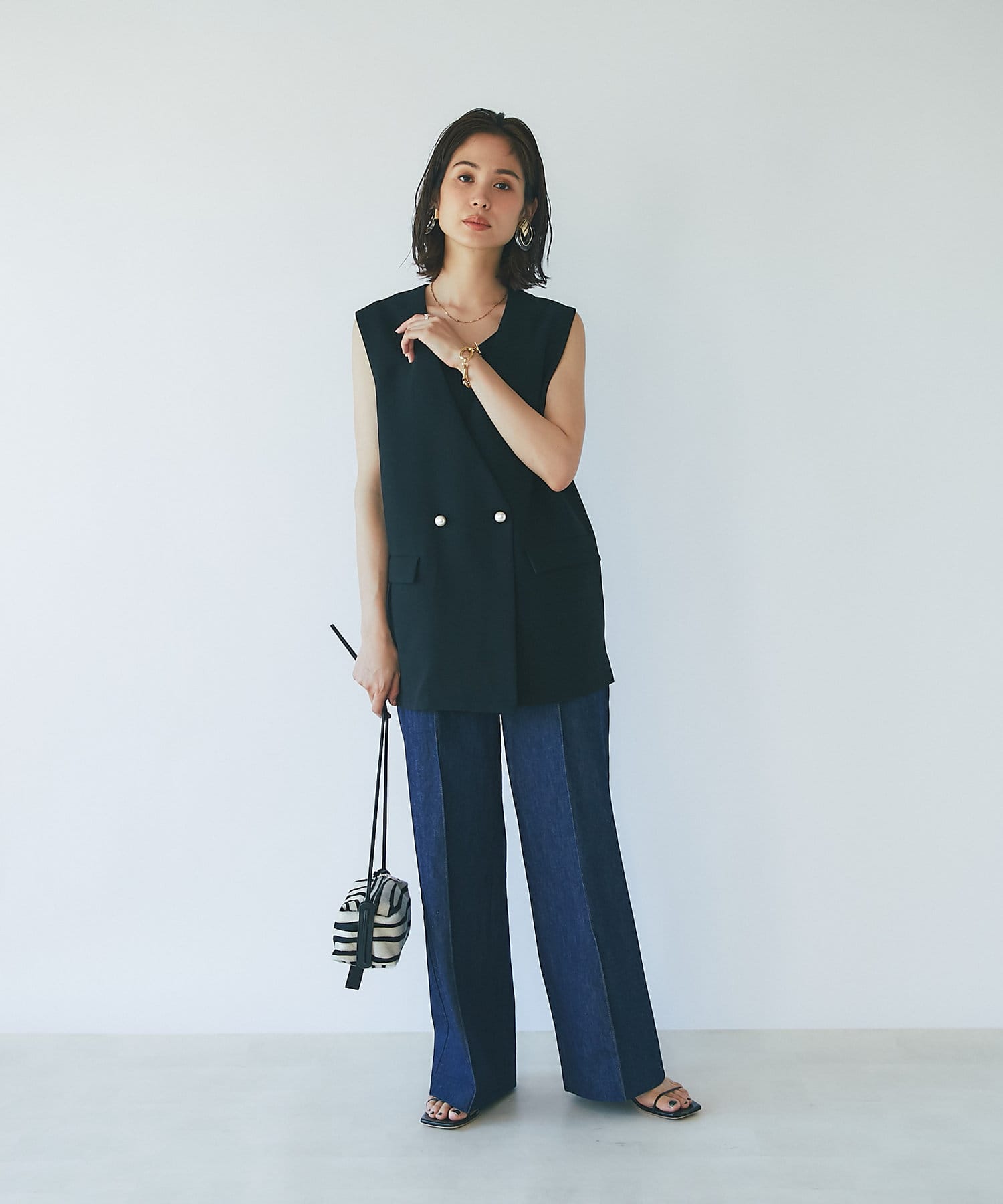ハイウエストで全体的に目線が上になるので、脚長効果抜群のシルエット。
