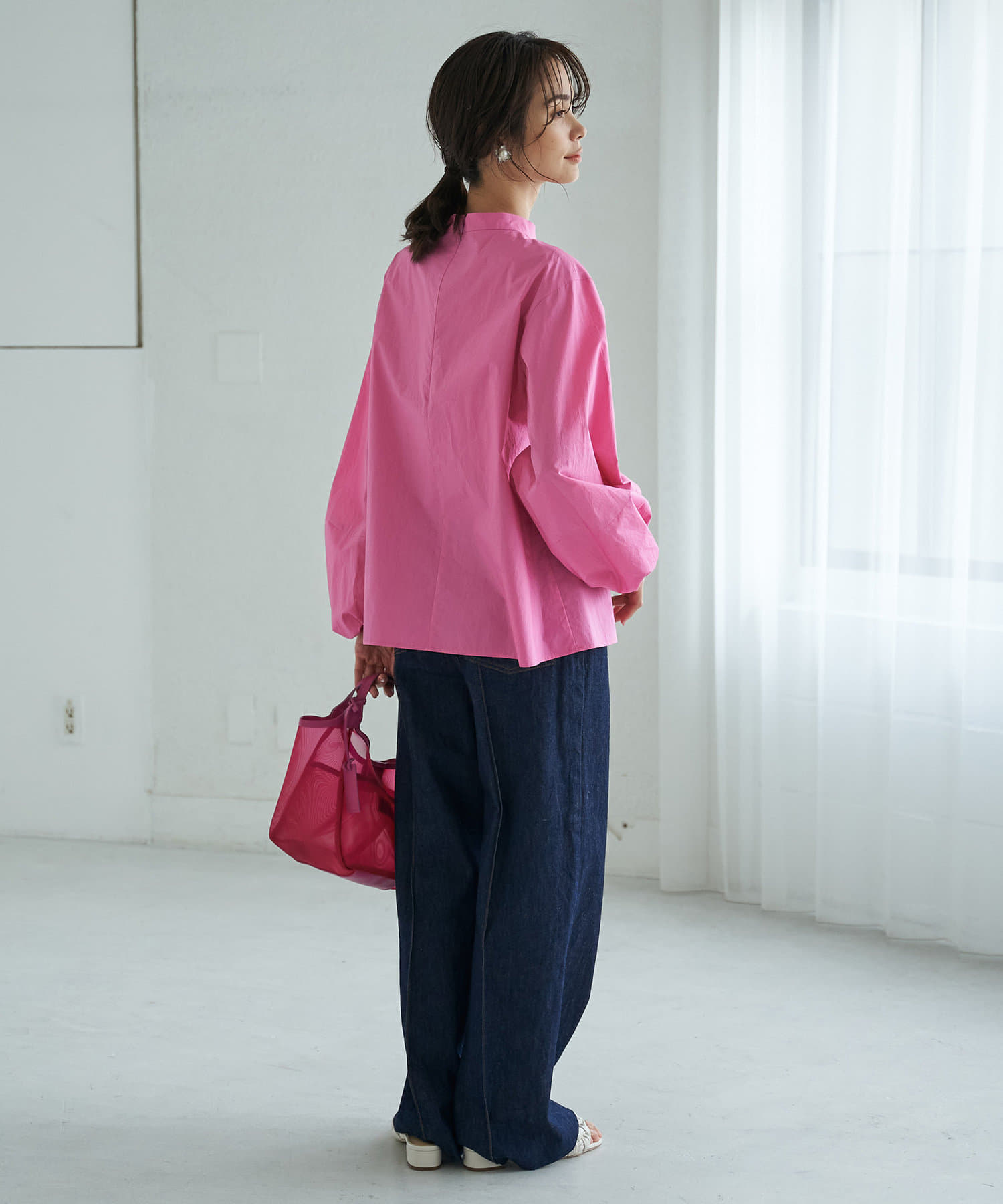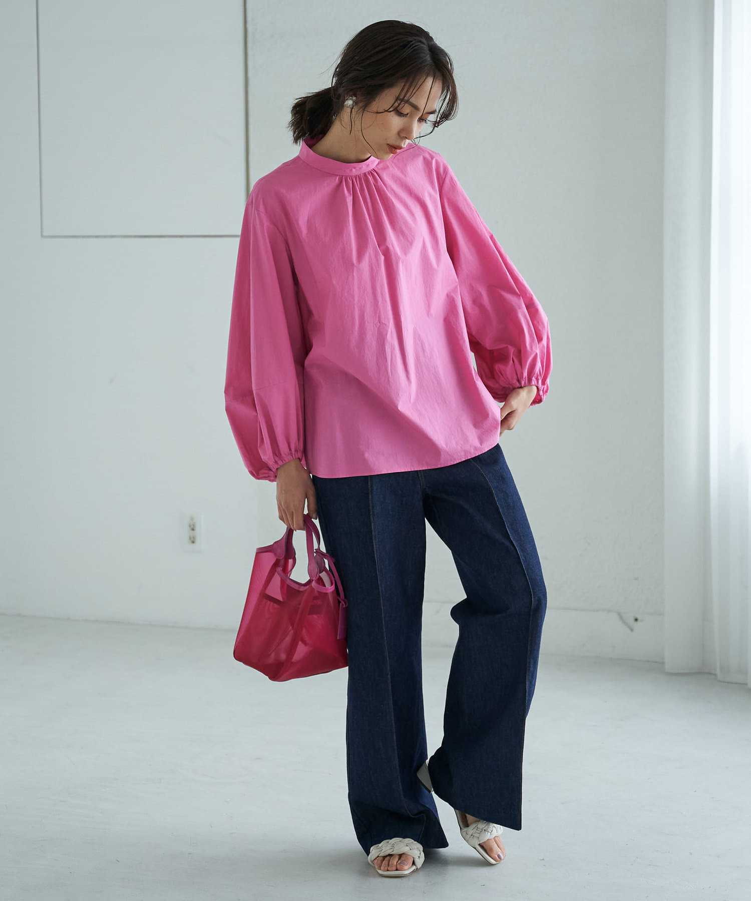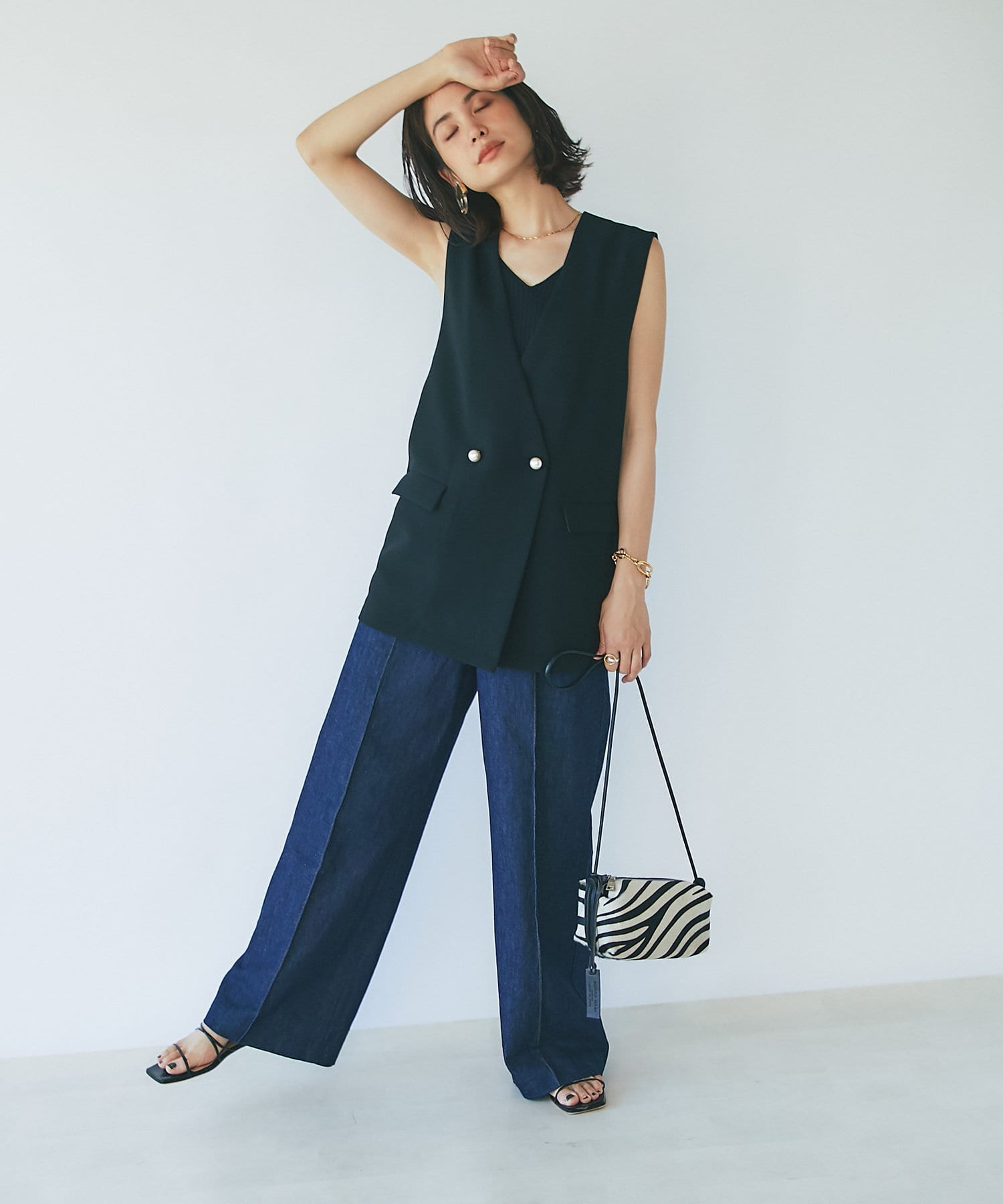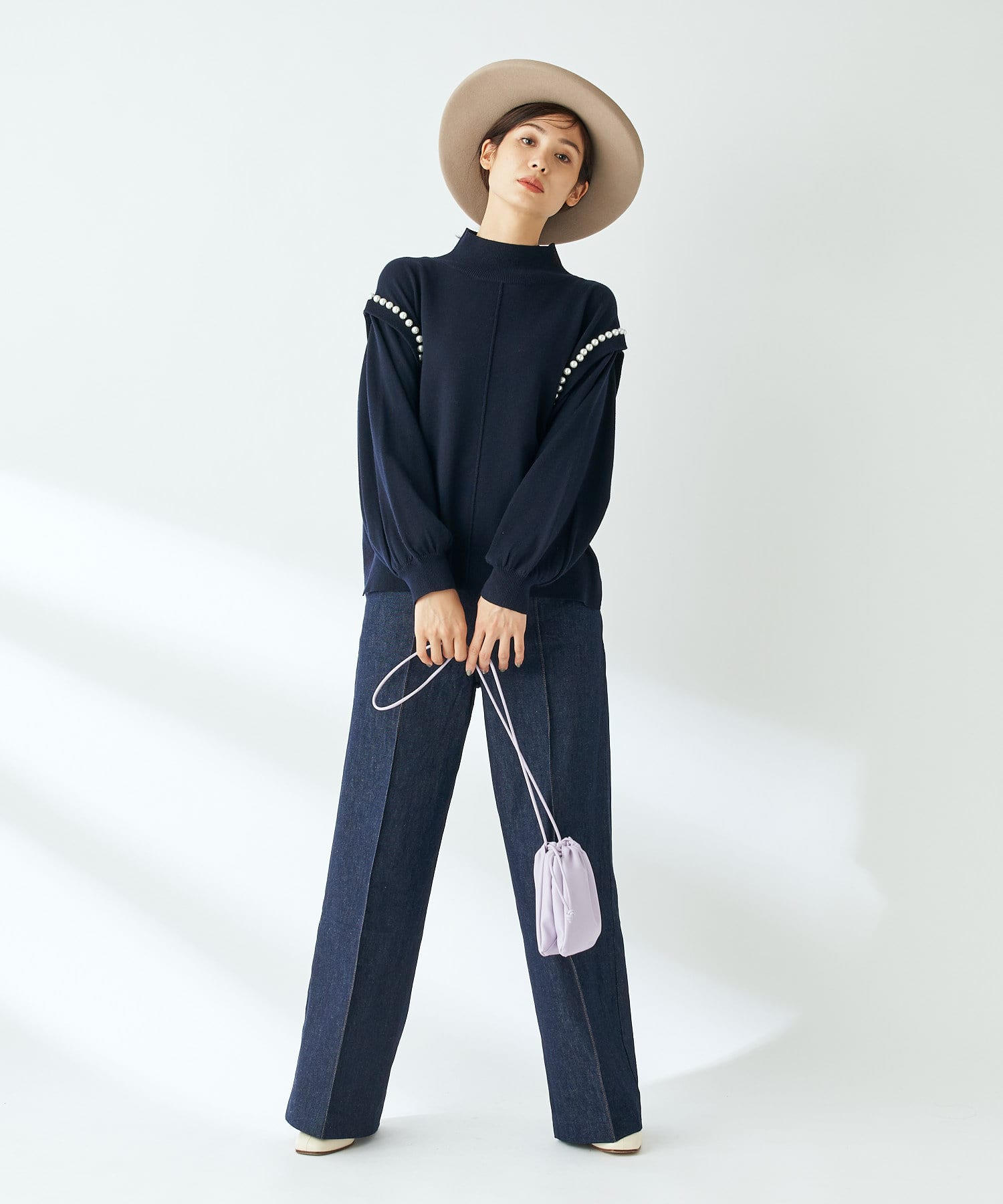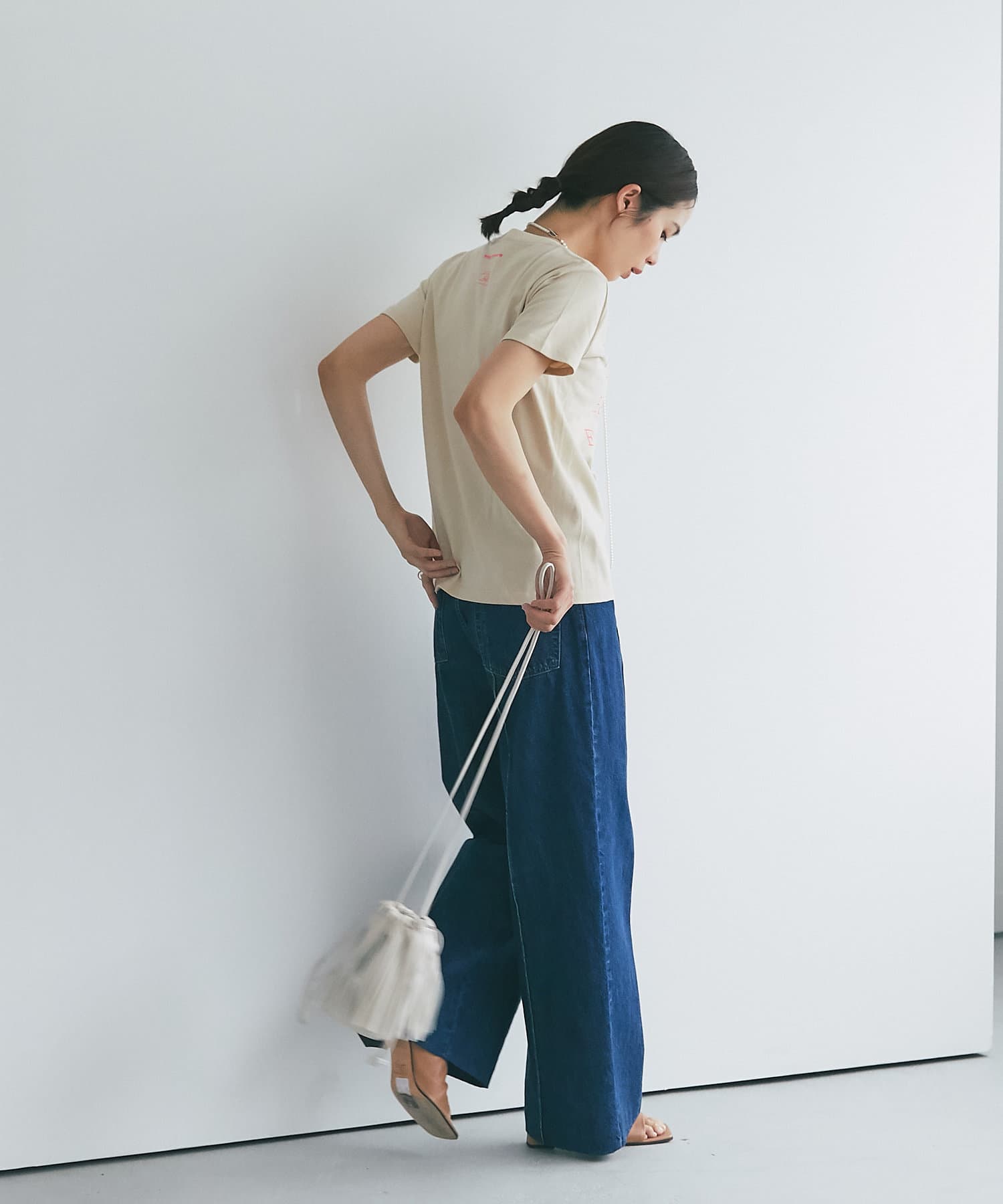 ハイウエストで全体的に目線が上になるので、脚長効果抜群のシルエット。