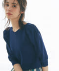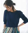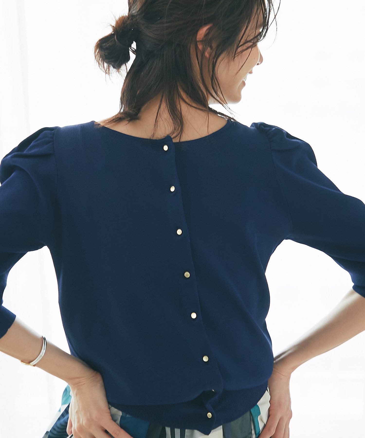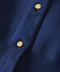 前はゴールドの釦がポイントになっているクルーネック、後ろは浅めのVネックラインで1枚で違う印象が楽しめるカーディガンです。