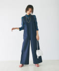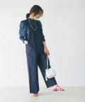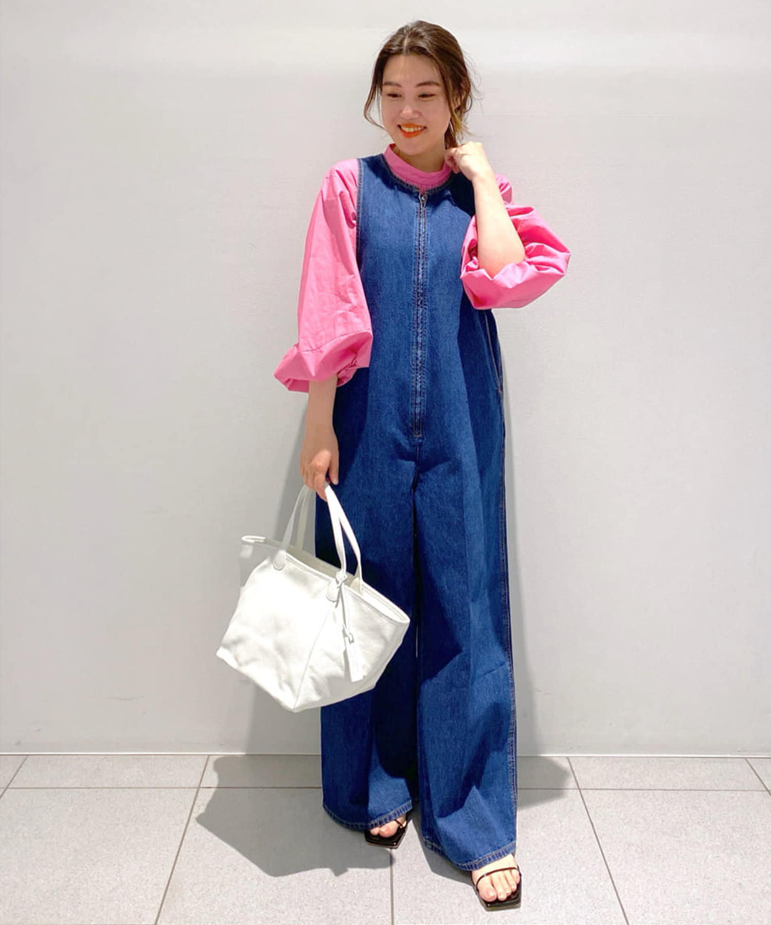 カレンテージのバギーシルエットのオーバーオールをカラーブラウスで大人カジュアルに。