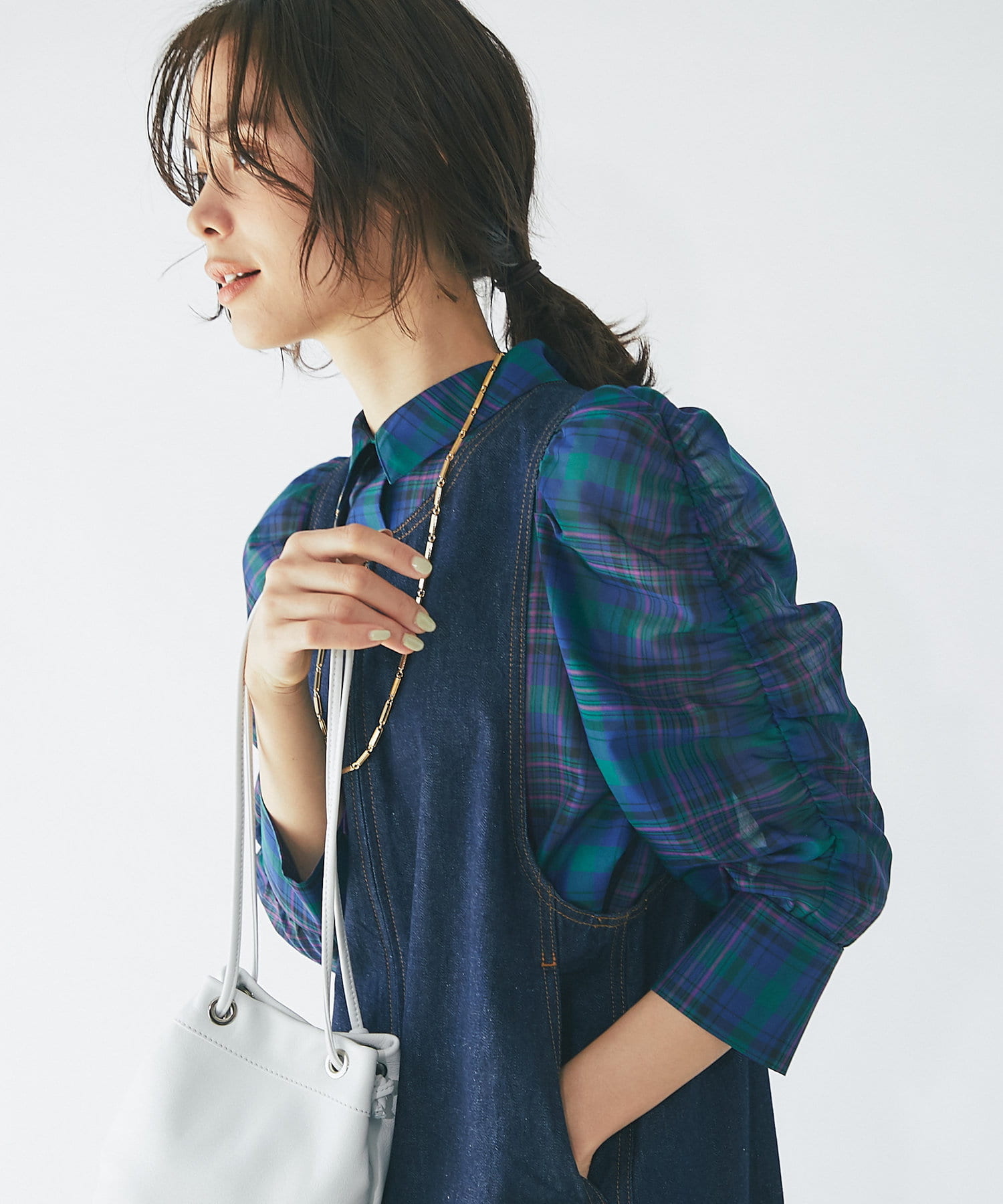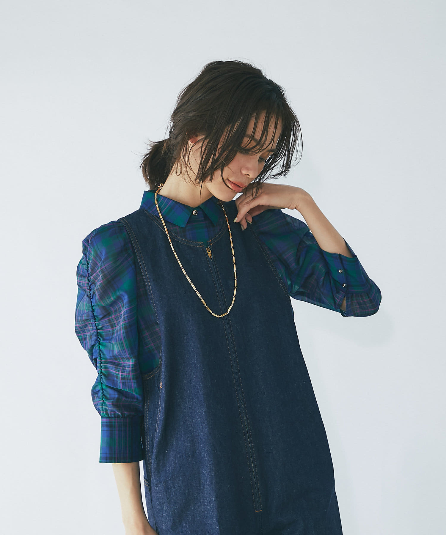 また、一枚で着ることはもちろん、インにはデニムとの相性抜群のチェックブラウスなどもオススメです。
