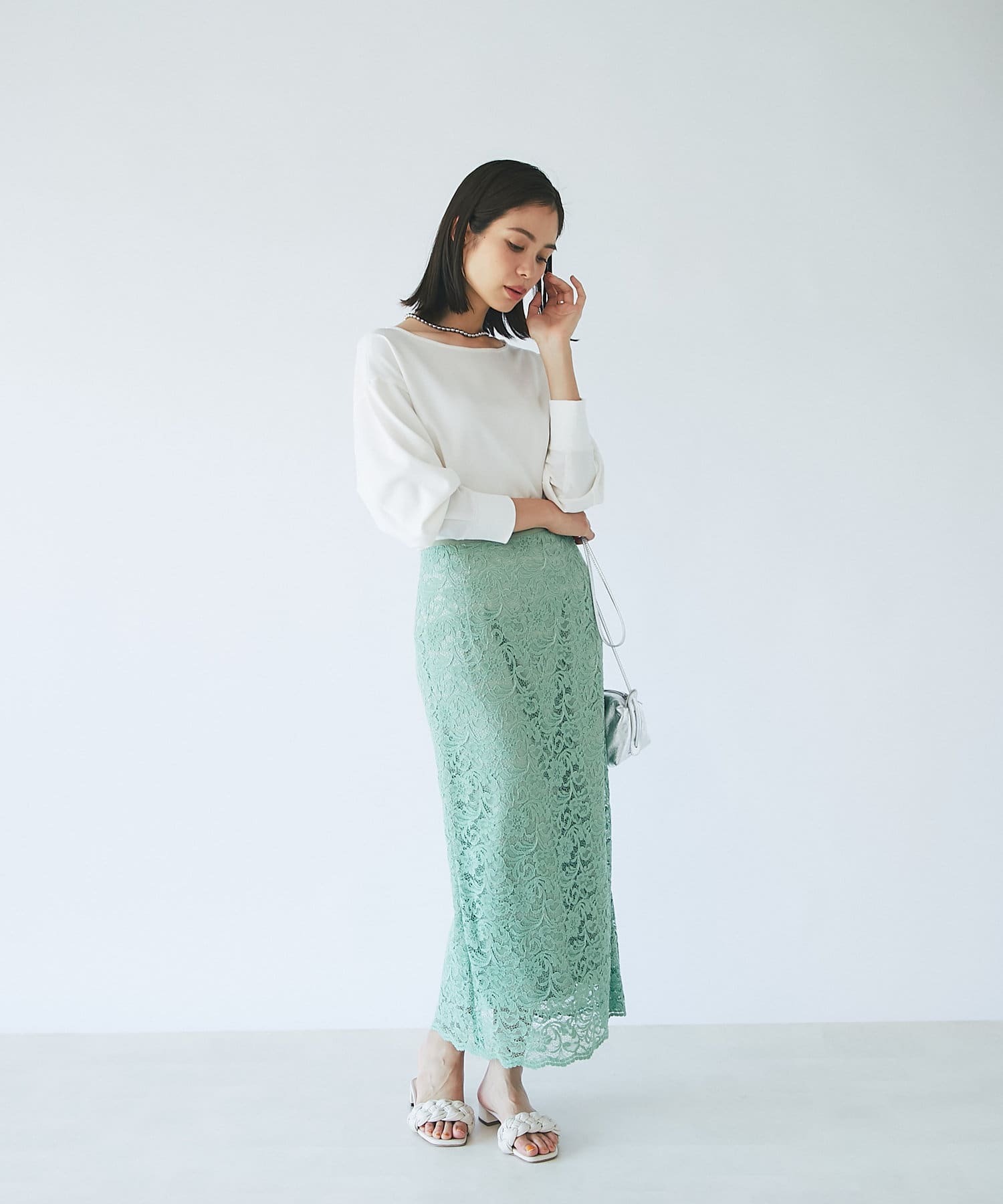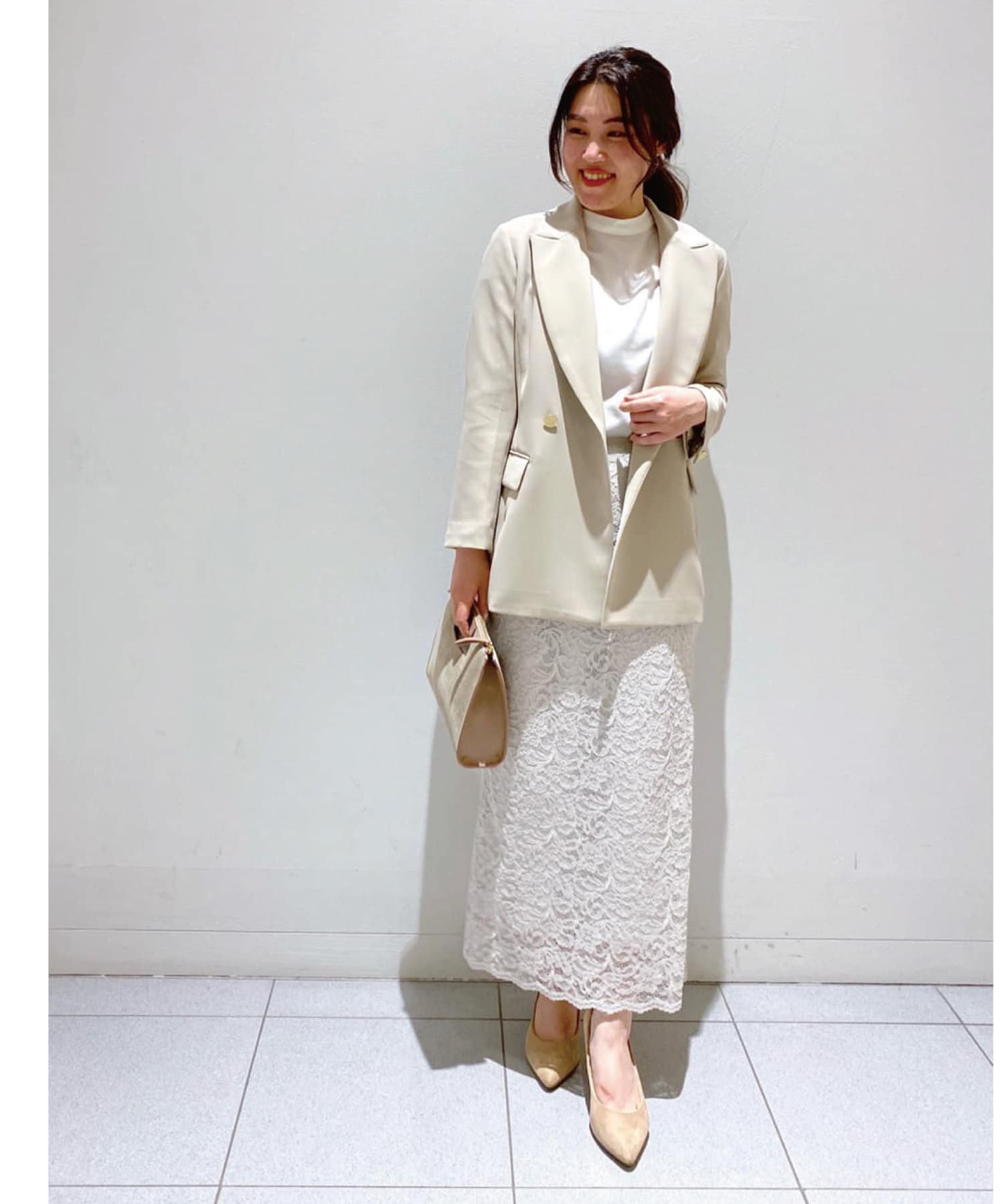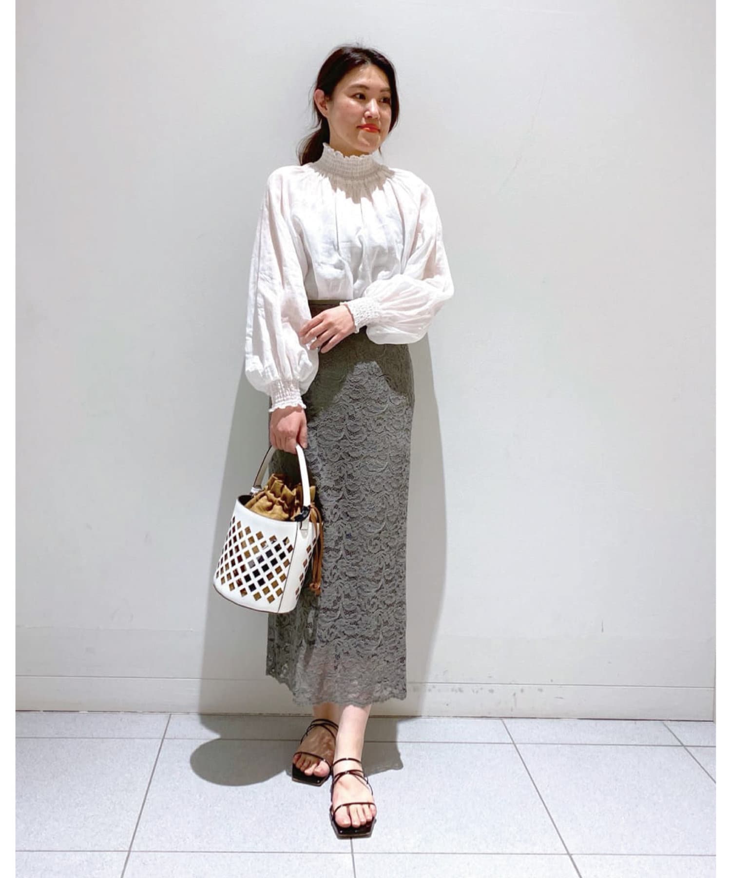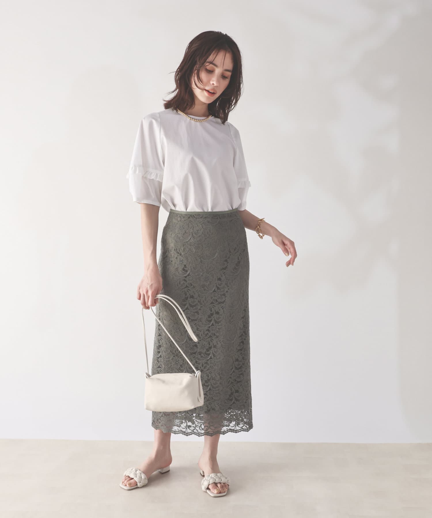 レースのナロースカートと合わせてお仕事にも使えるきれいめコーデに。