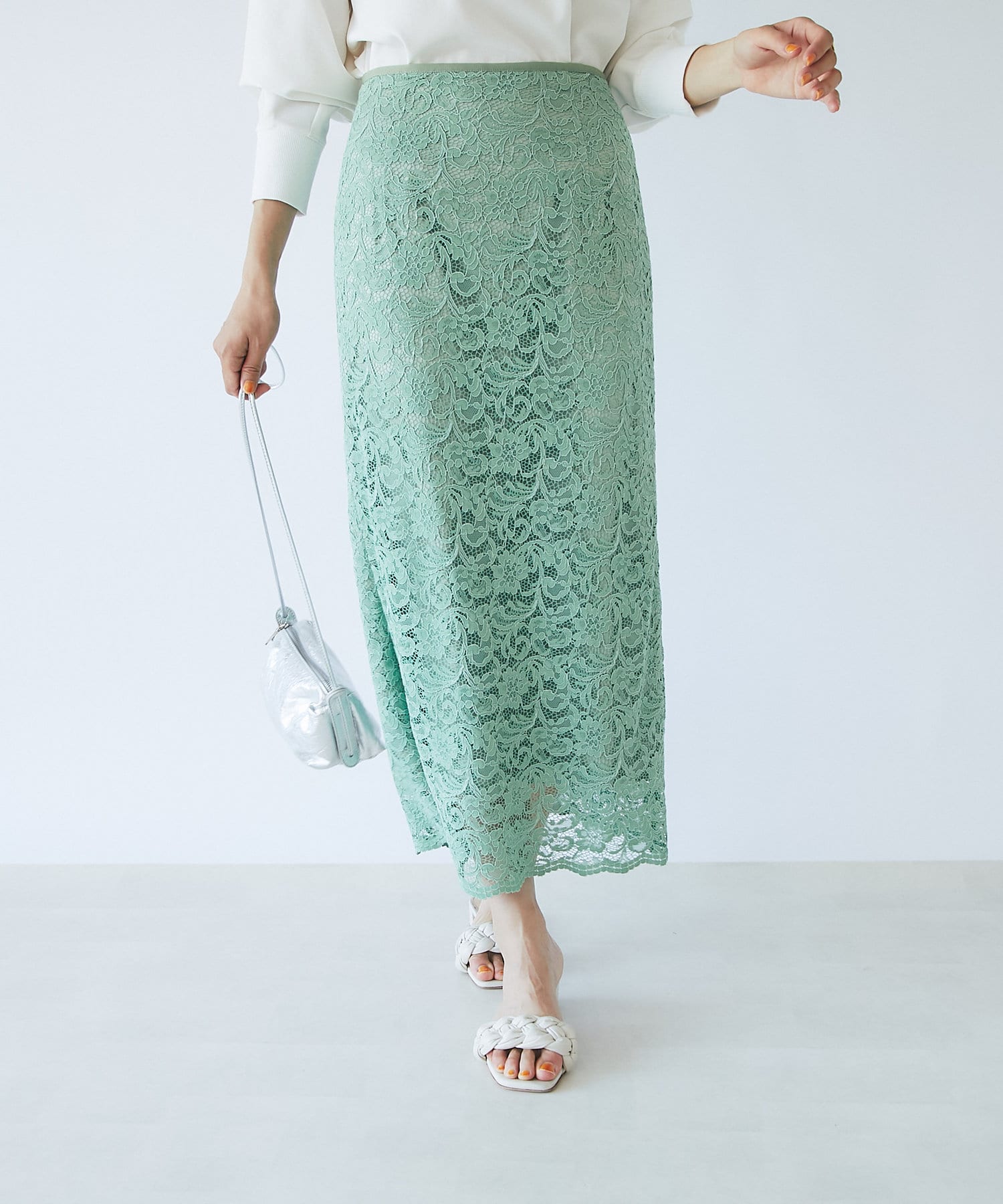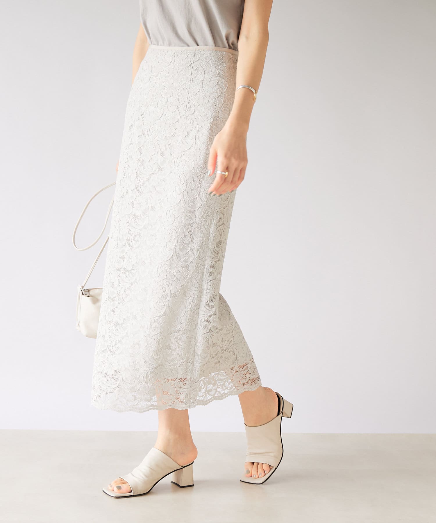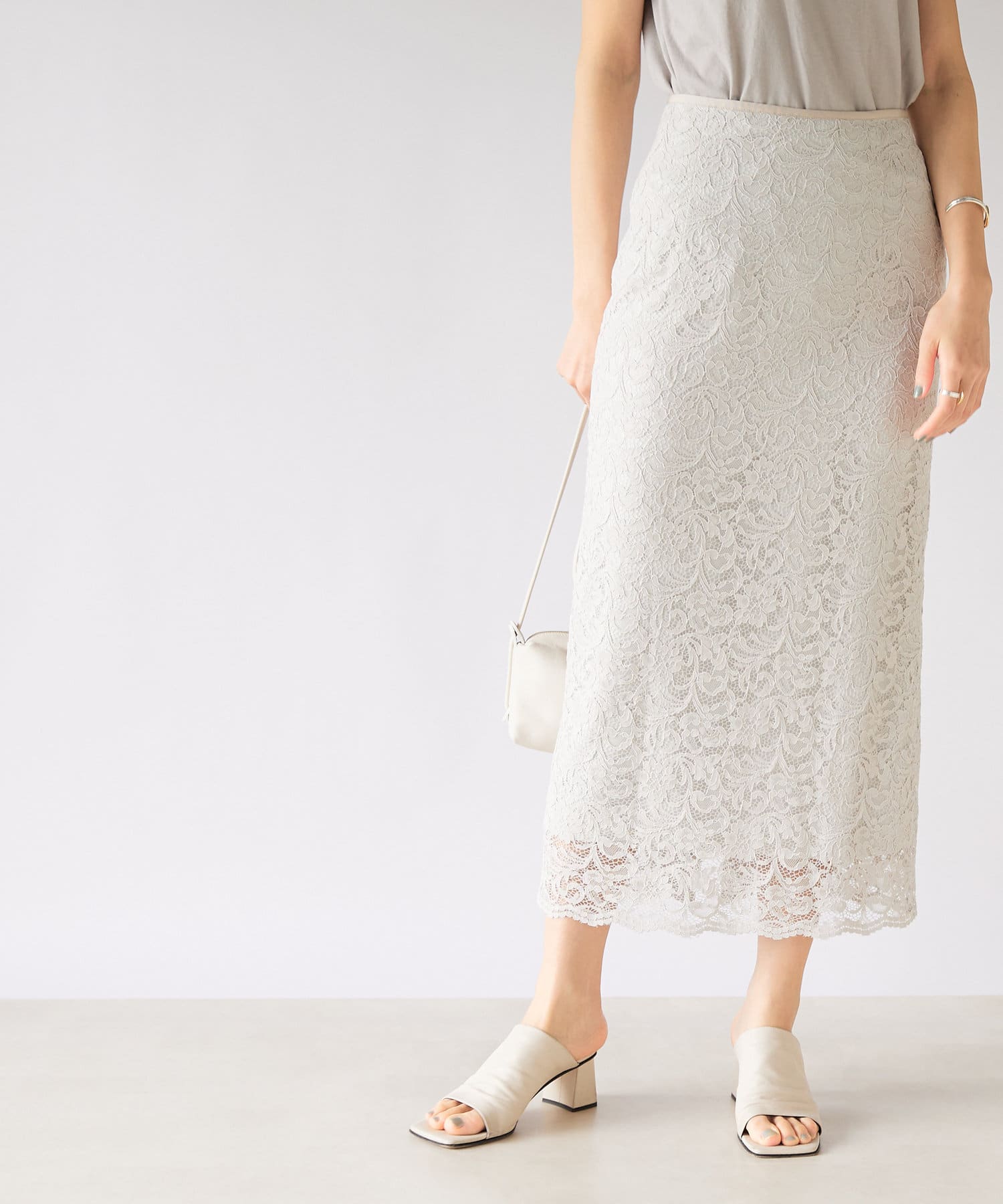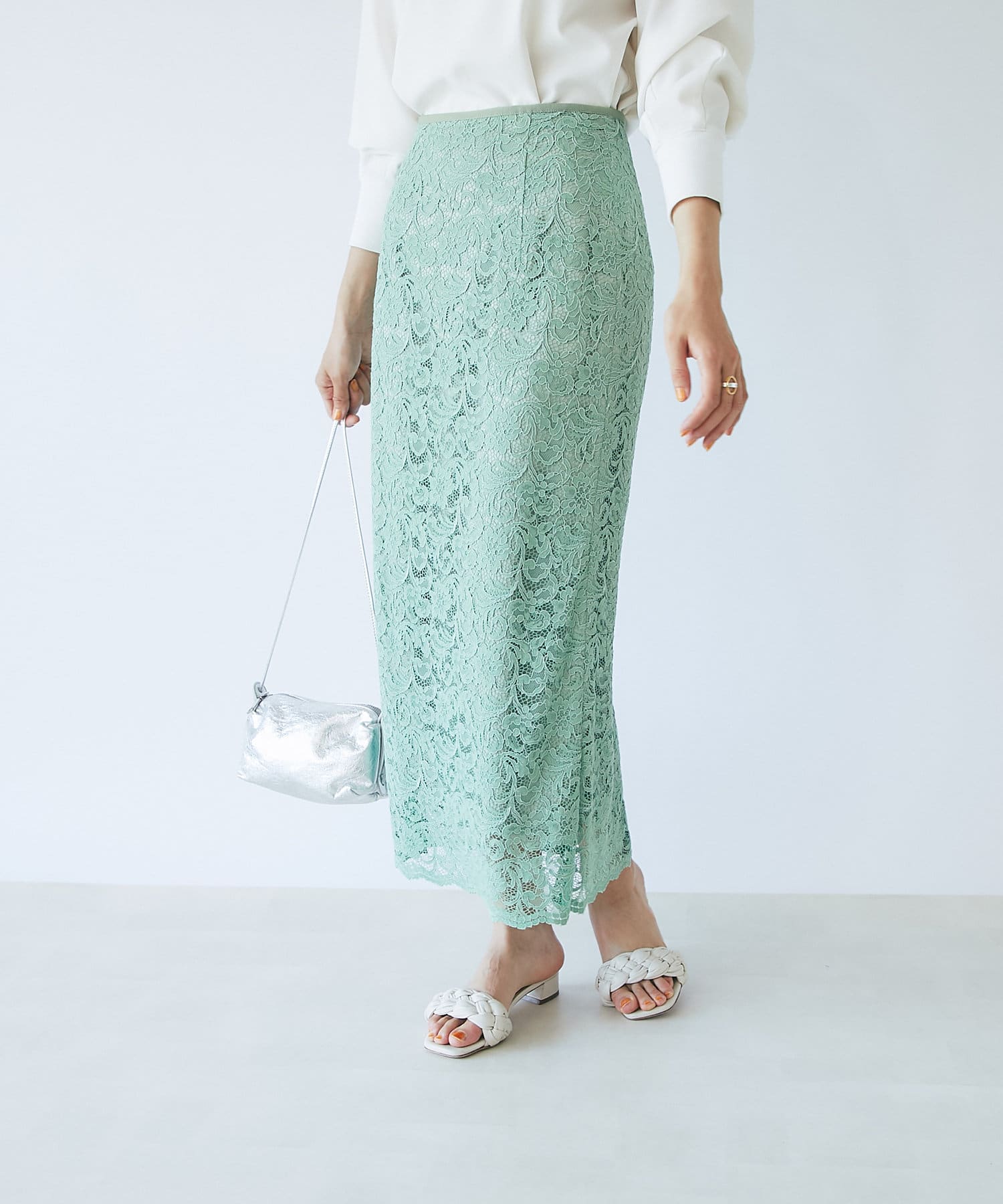 女らしいラインの縦長シルエットがスタイルアップ見えするレーススカートは着回し力抜群な一枚。