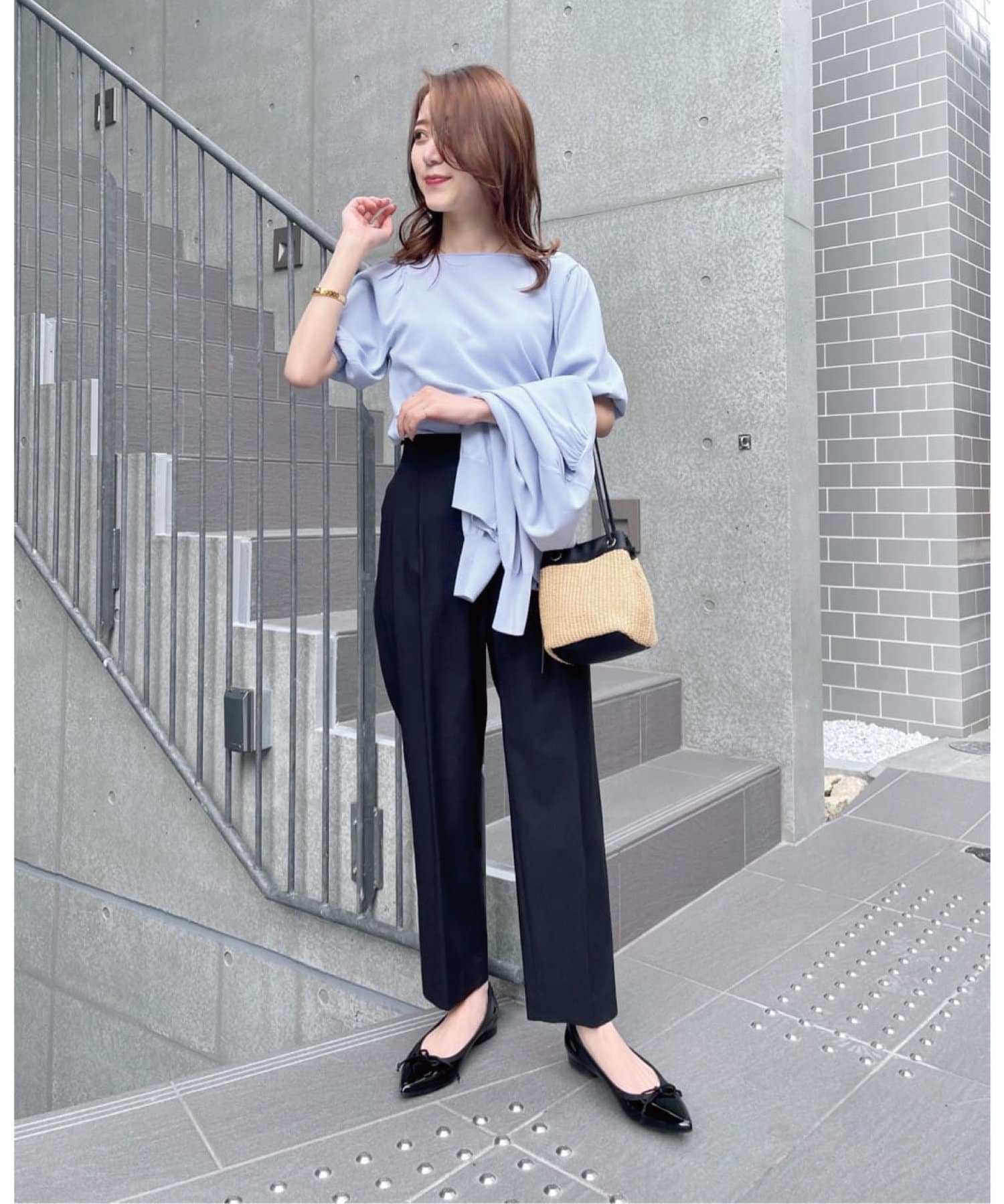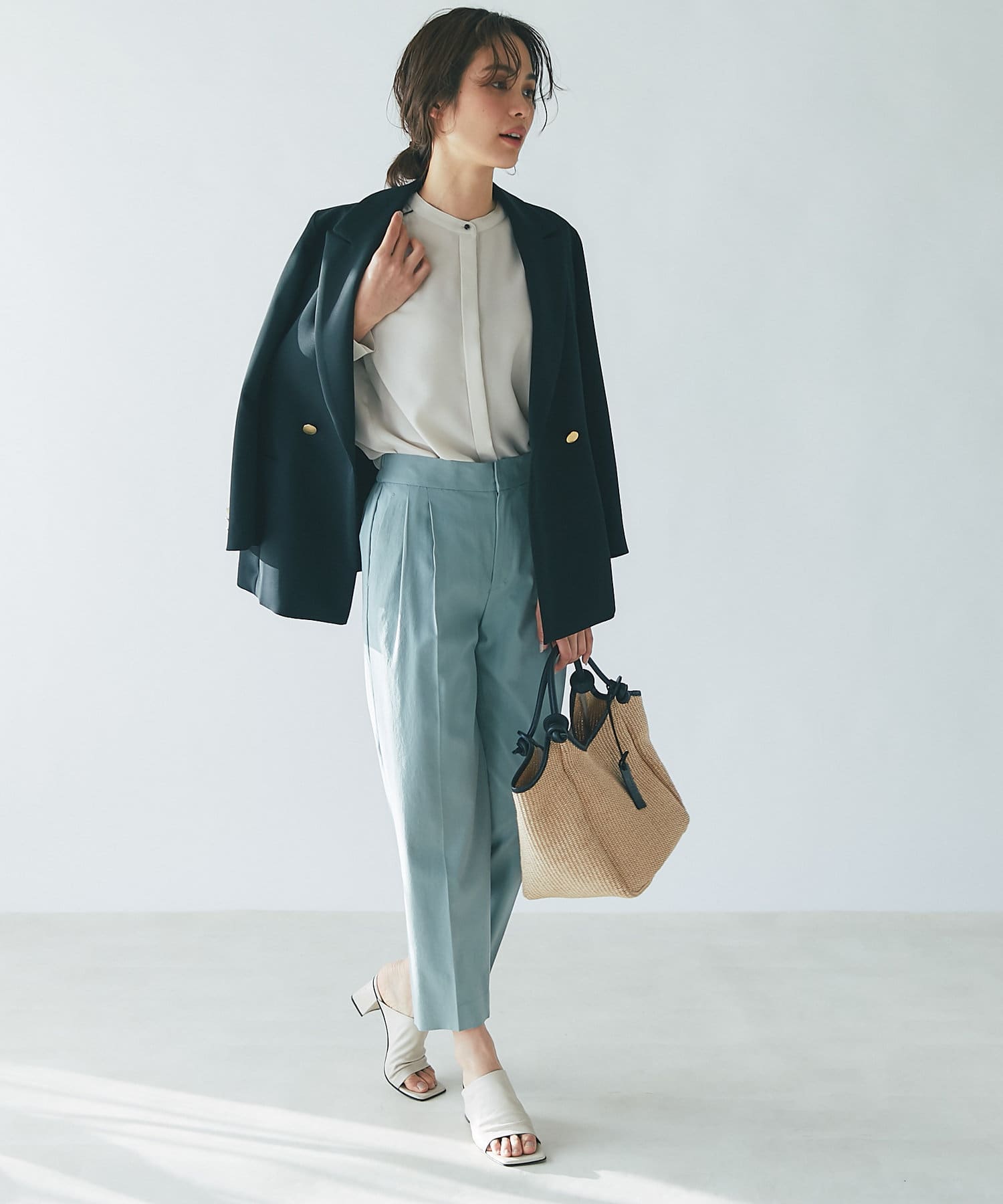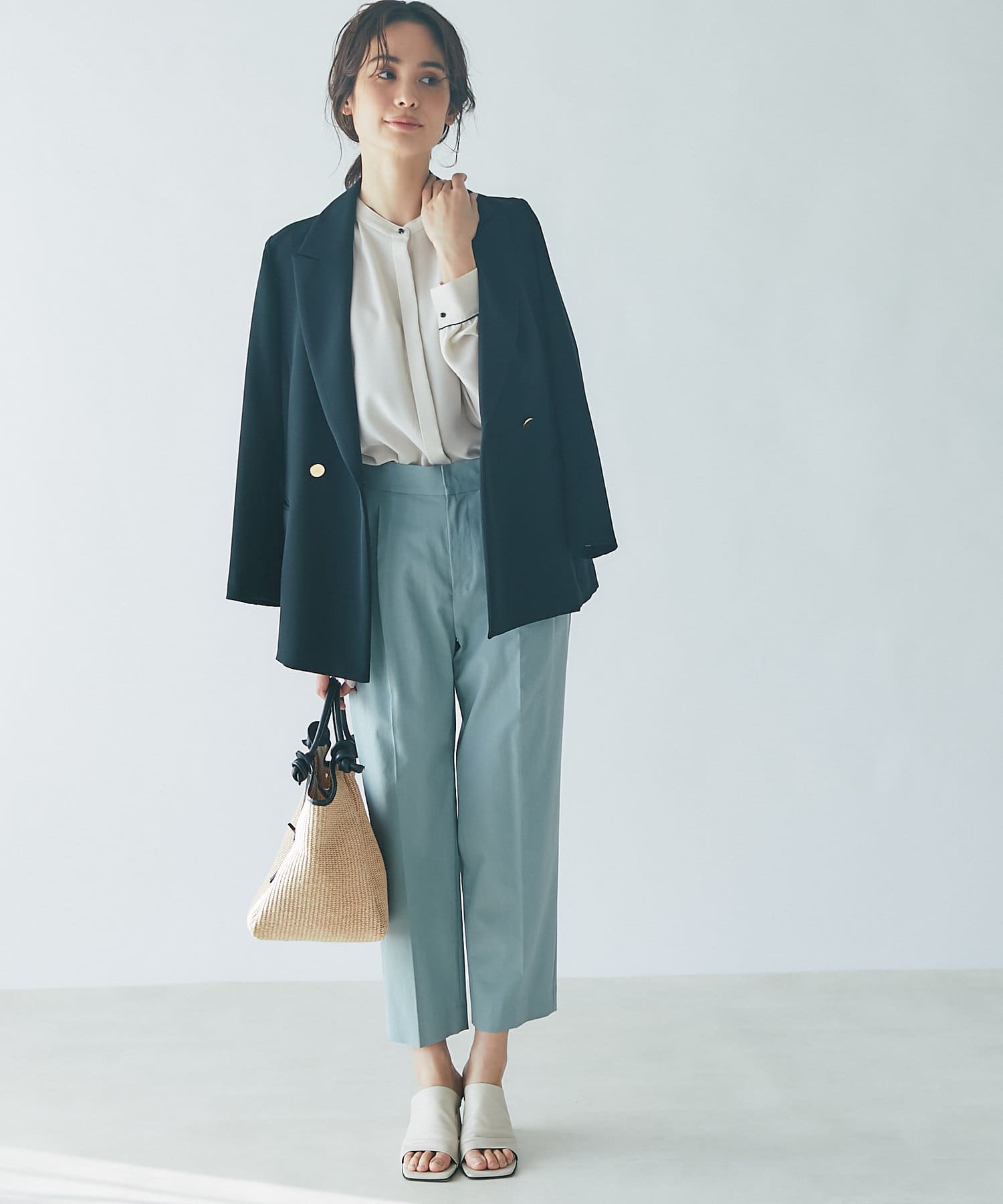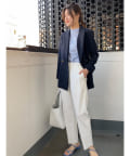 シンプルなデザインなのでトップスは選ばず着ていただけますが、女性らしいデザインブラウスなどと相性抜群で、程よくマニッシュとレディがミックスされるのでおすすめです。