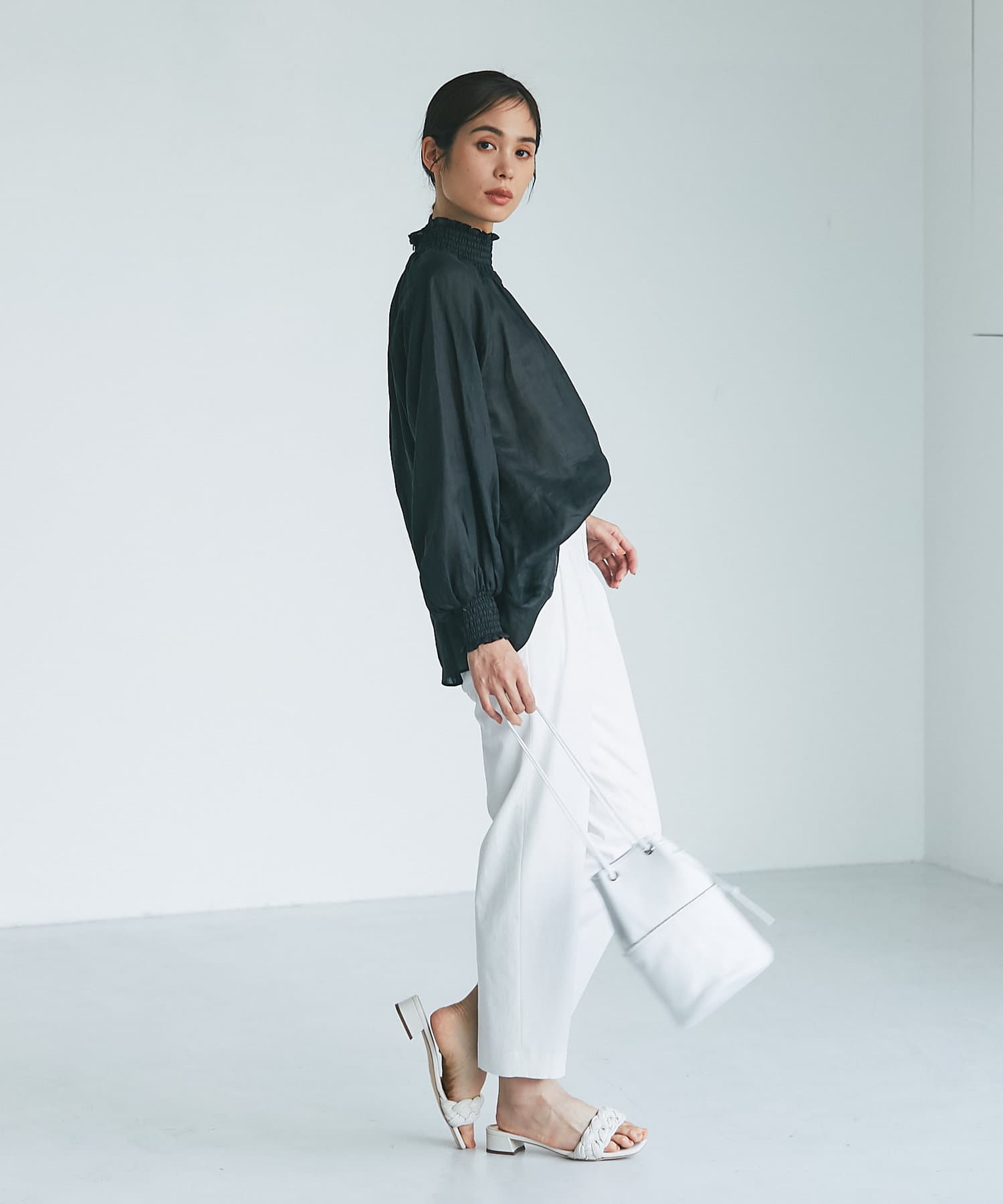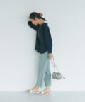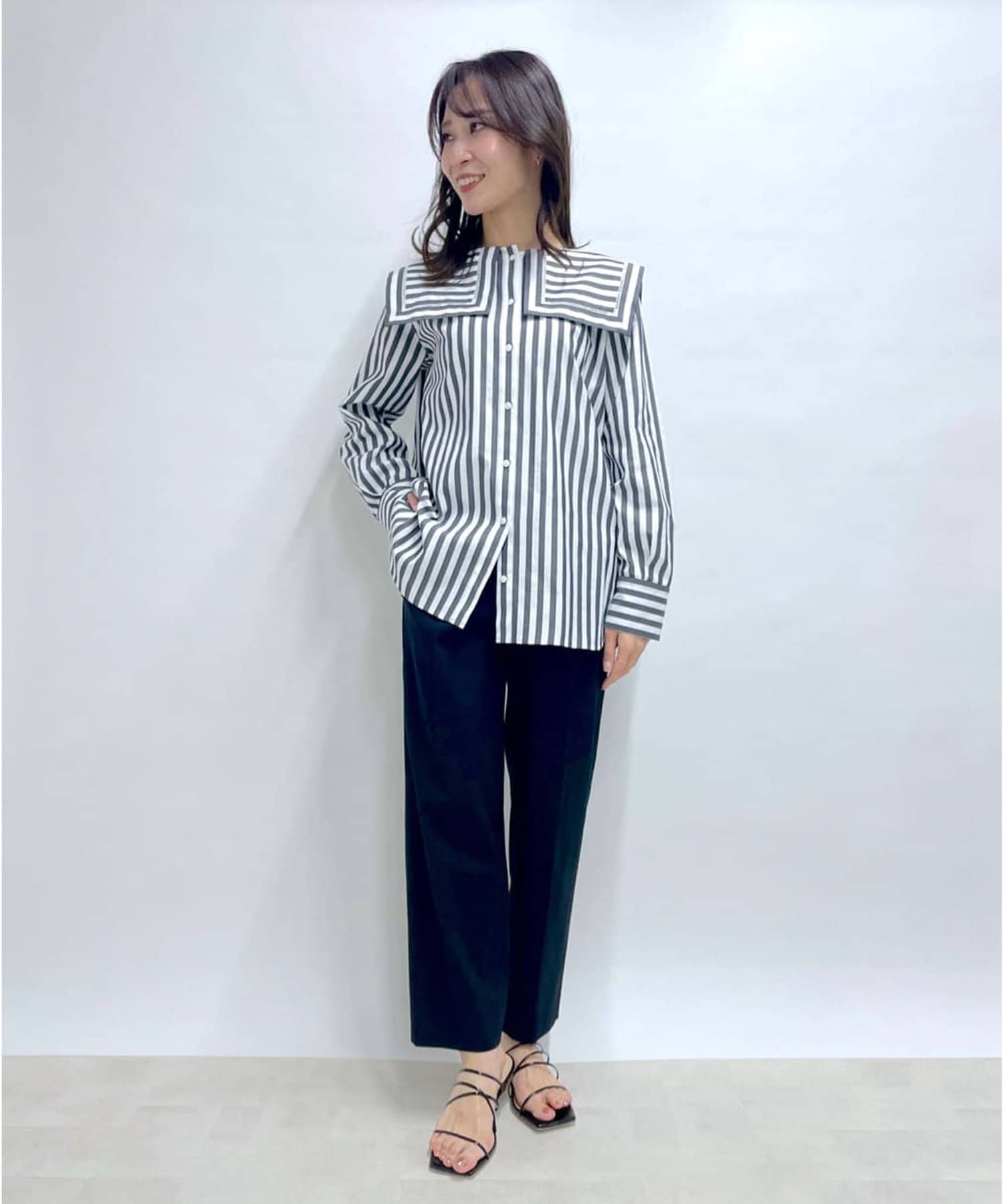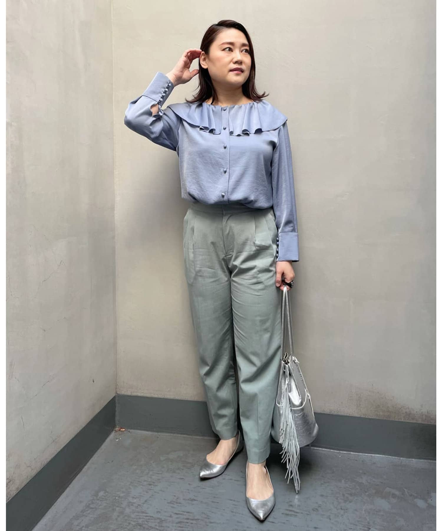 シンプルなデザインなのでトップスは選ばず着ていただけますが、女性らしいデザインブラウスなどと相性抜群で、程よくマニッシュとレディがミックスされるのでおすすめです。