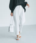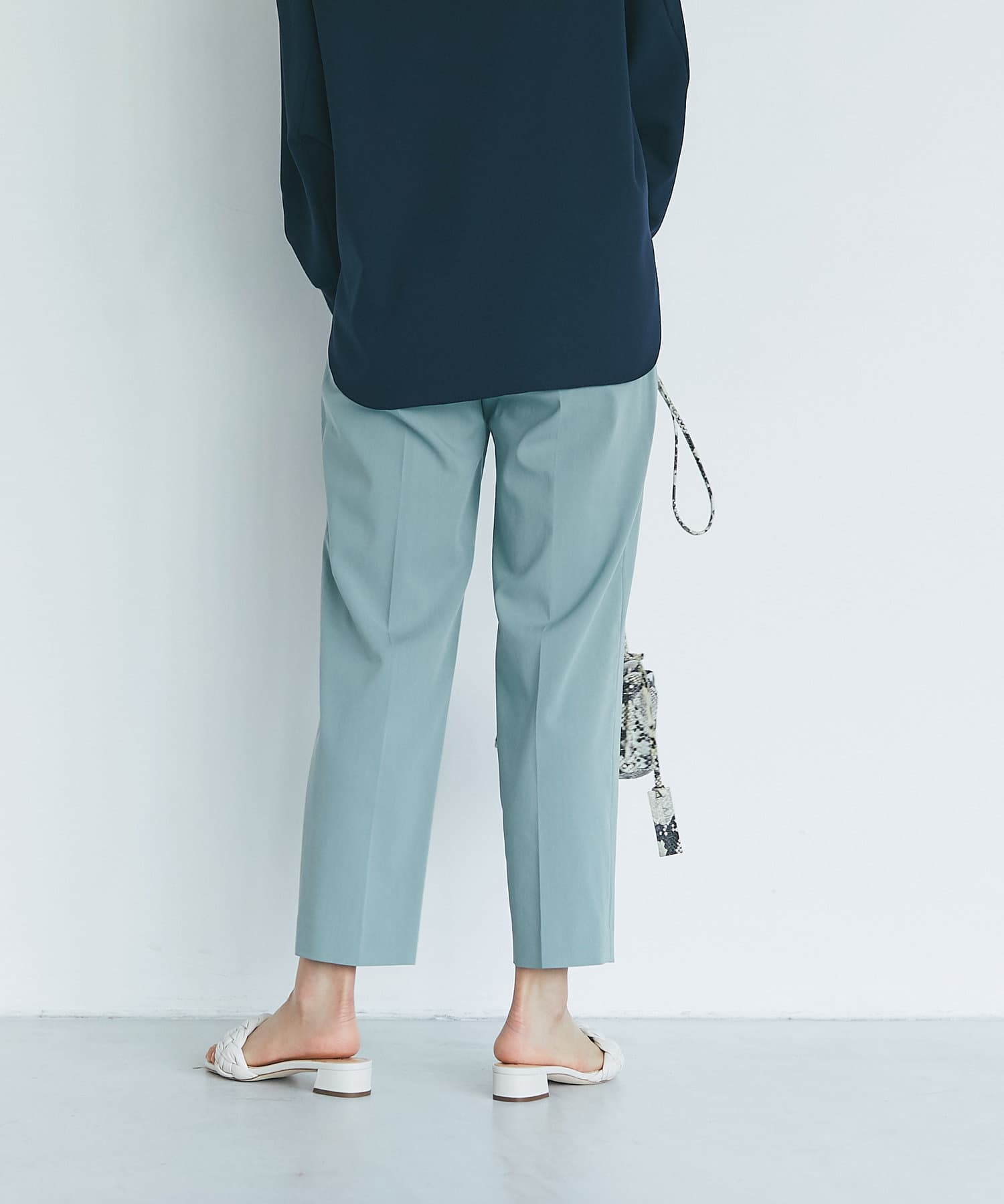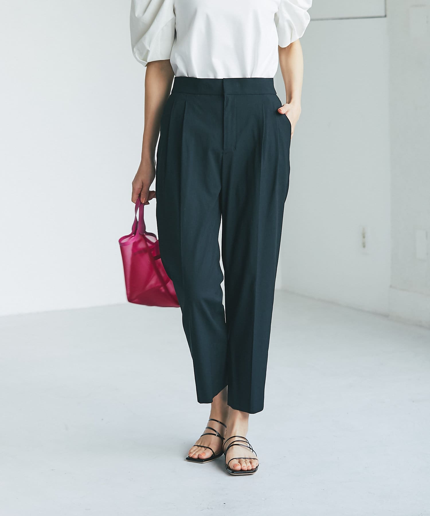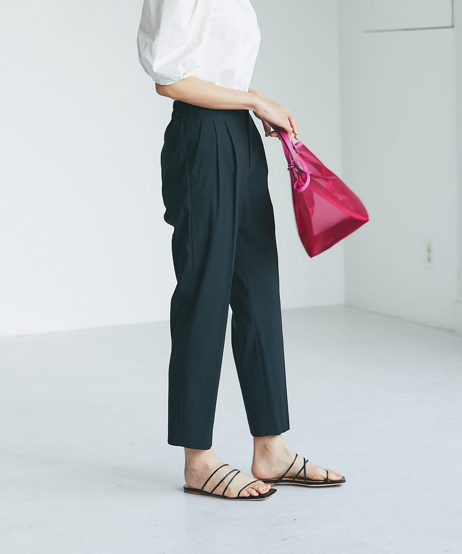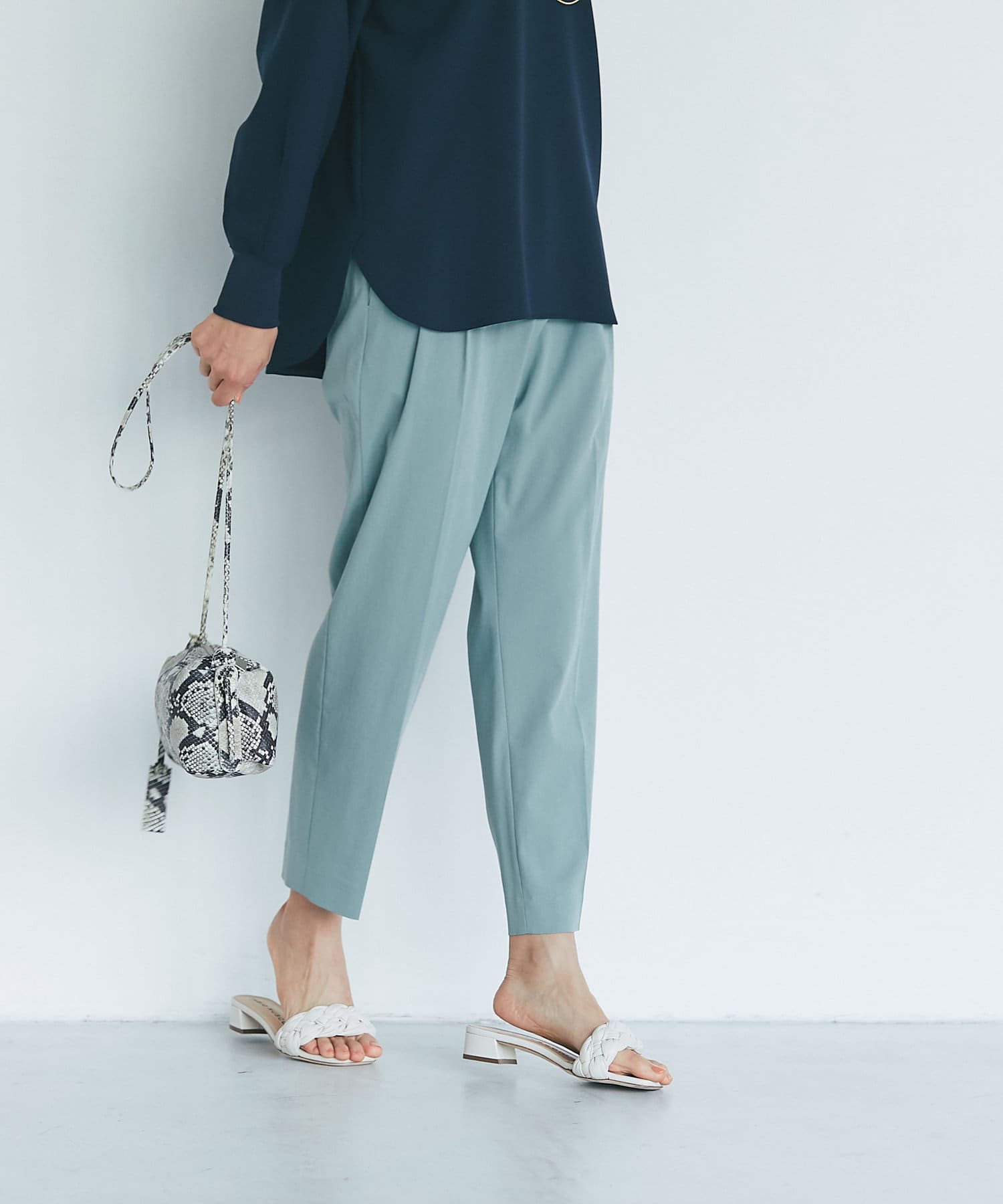 またウエストにはタックが入っており、ヒップまわりはゆったりとした穿き心地ながら、脚首が見える丈と裾に向かって細くなるシルエットなので華奢見え効果にも期待できます。