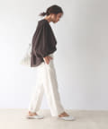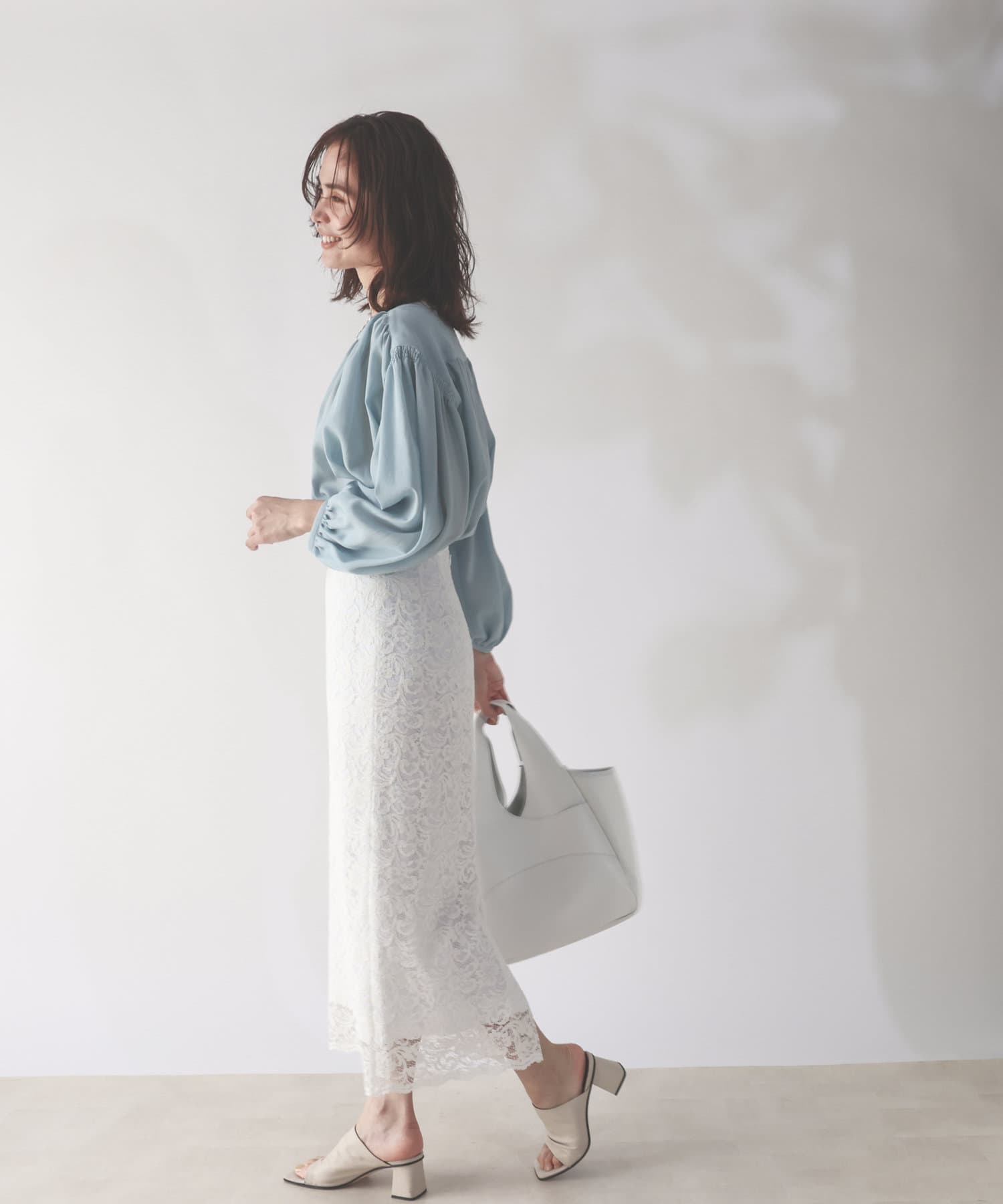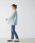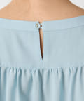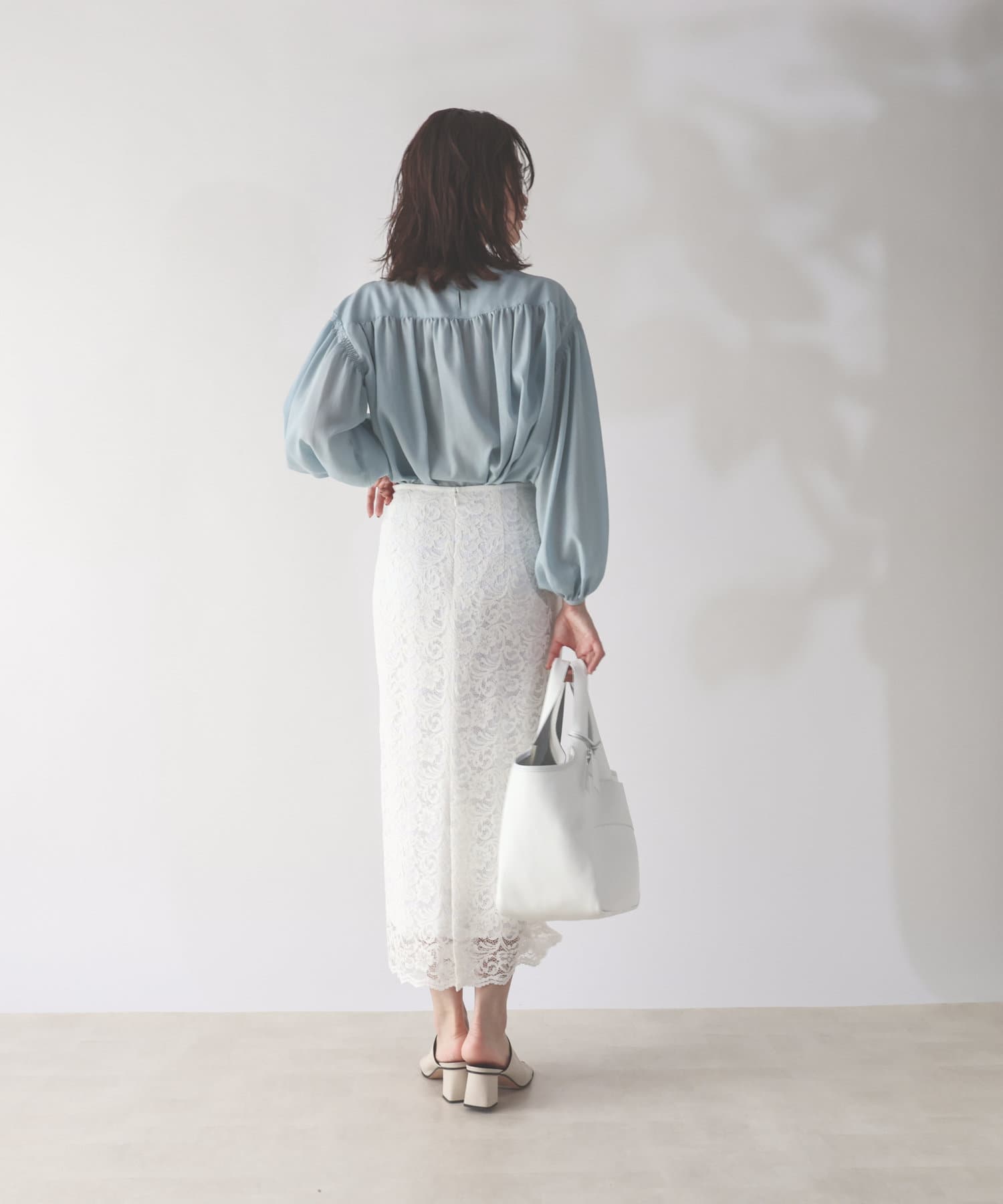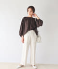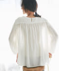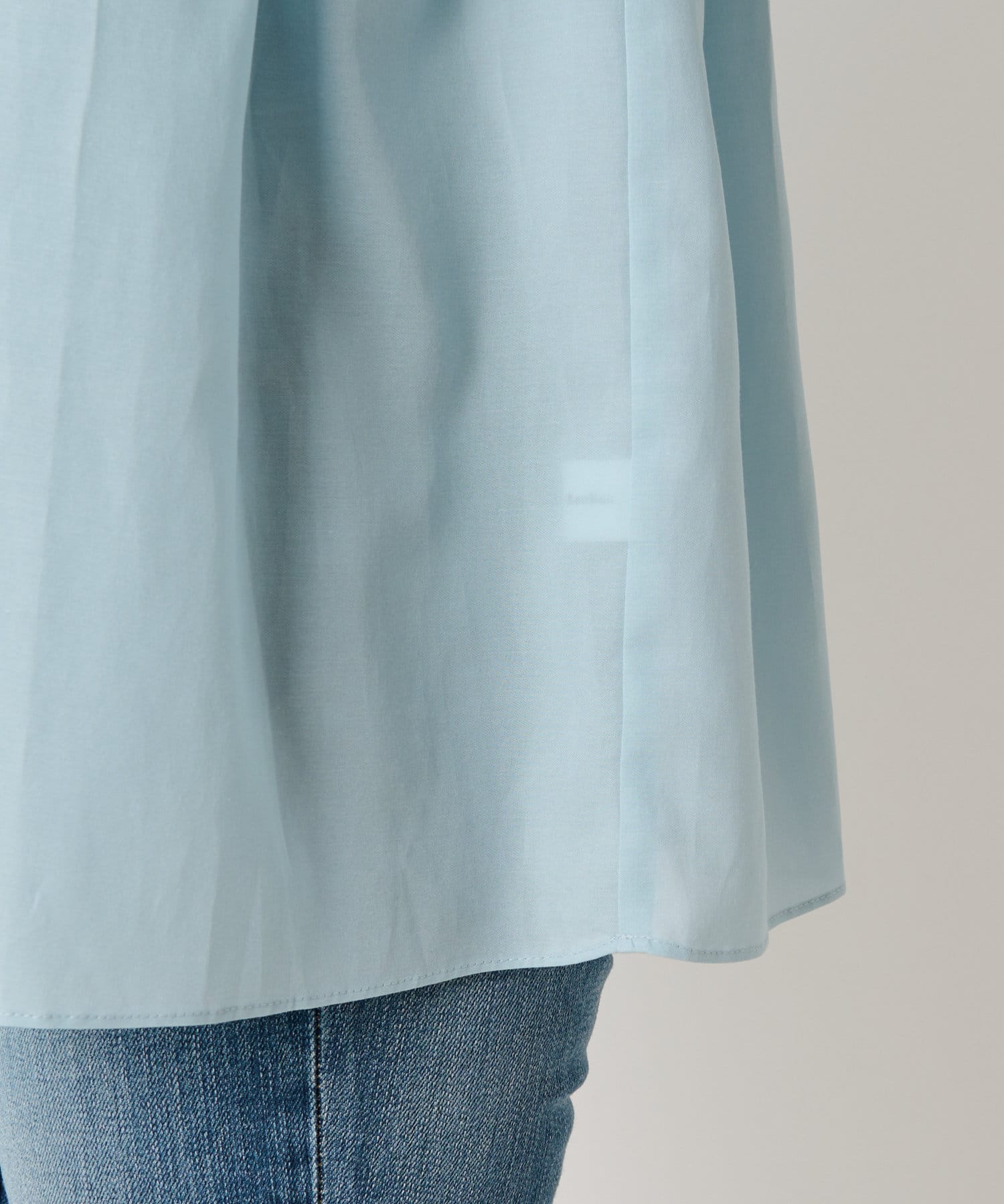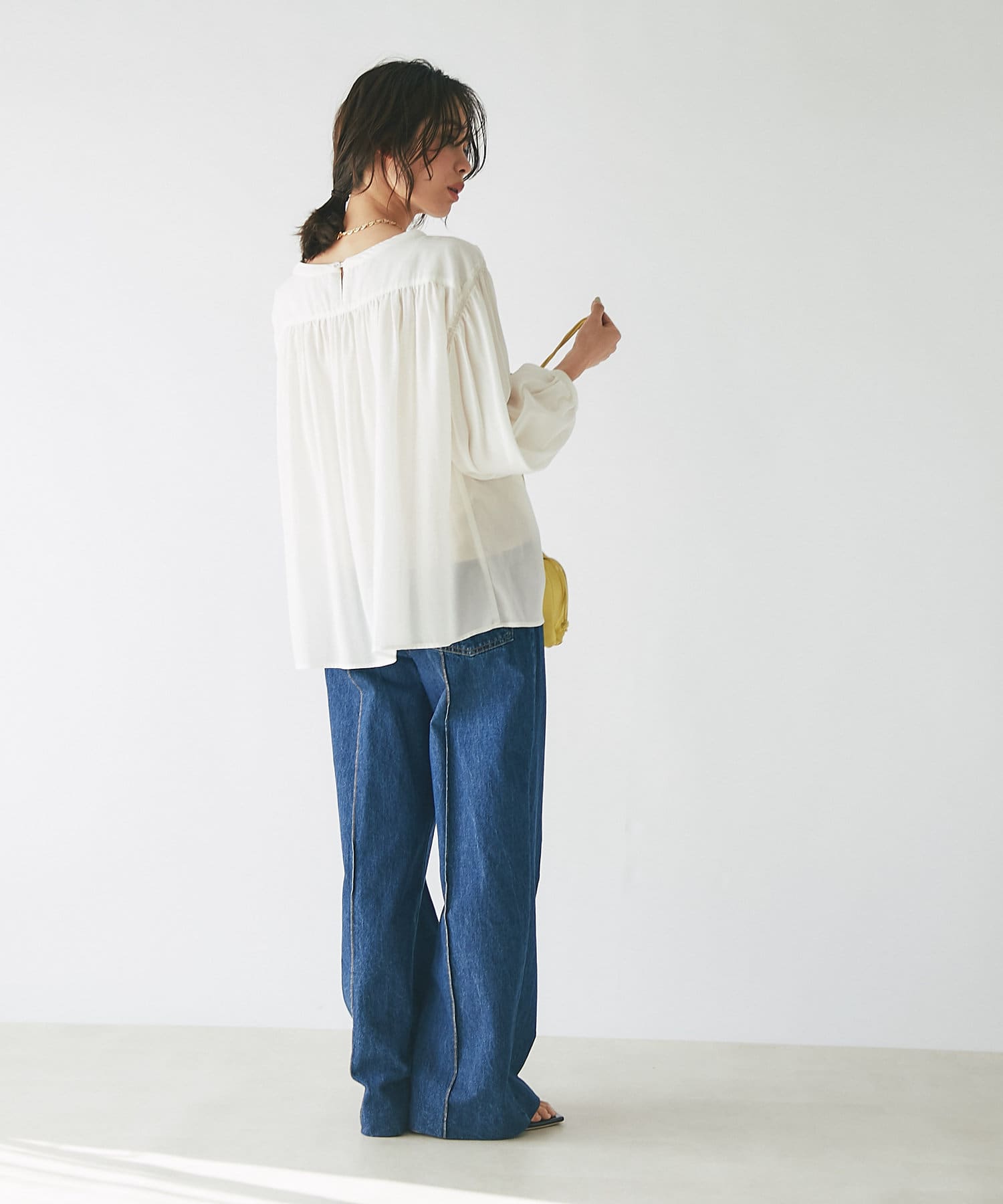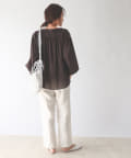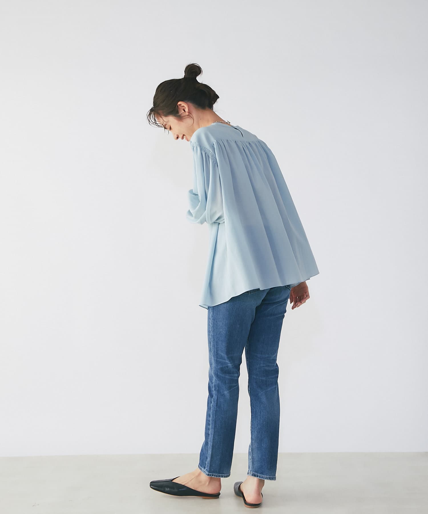 やや開いたクルーネックとバックのクルミ釦もまた、エレガンスさを演出する要素になっており、シアー感があるので大人の雰囲気のブラウスです。