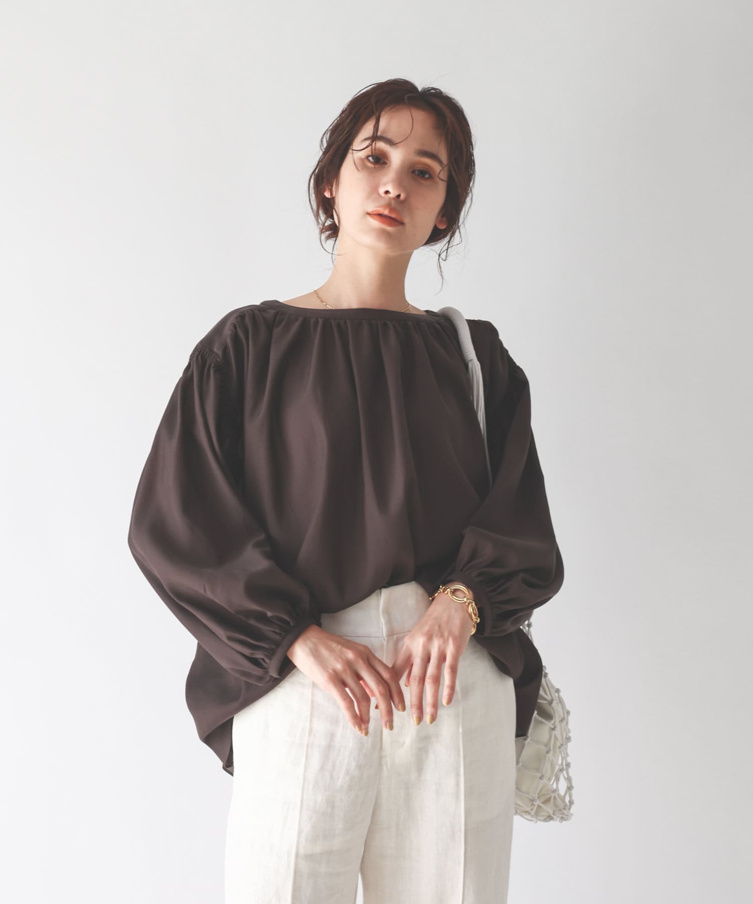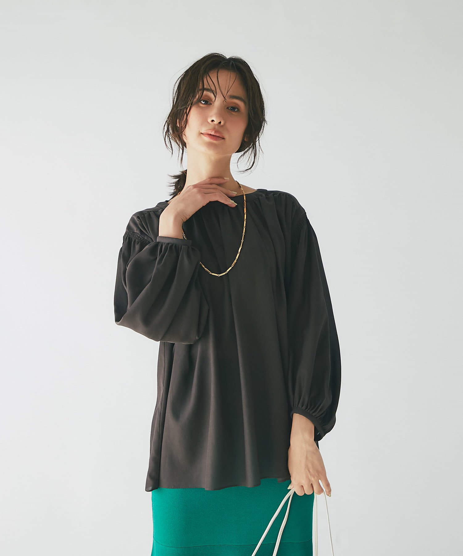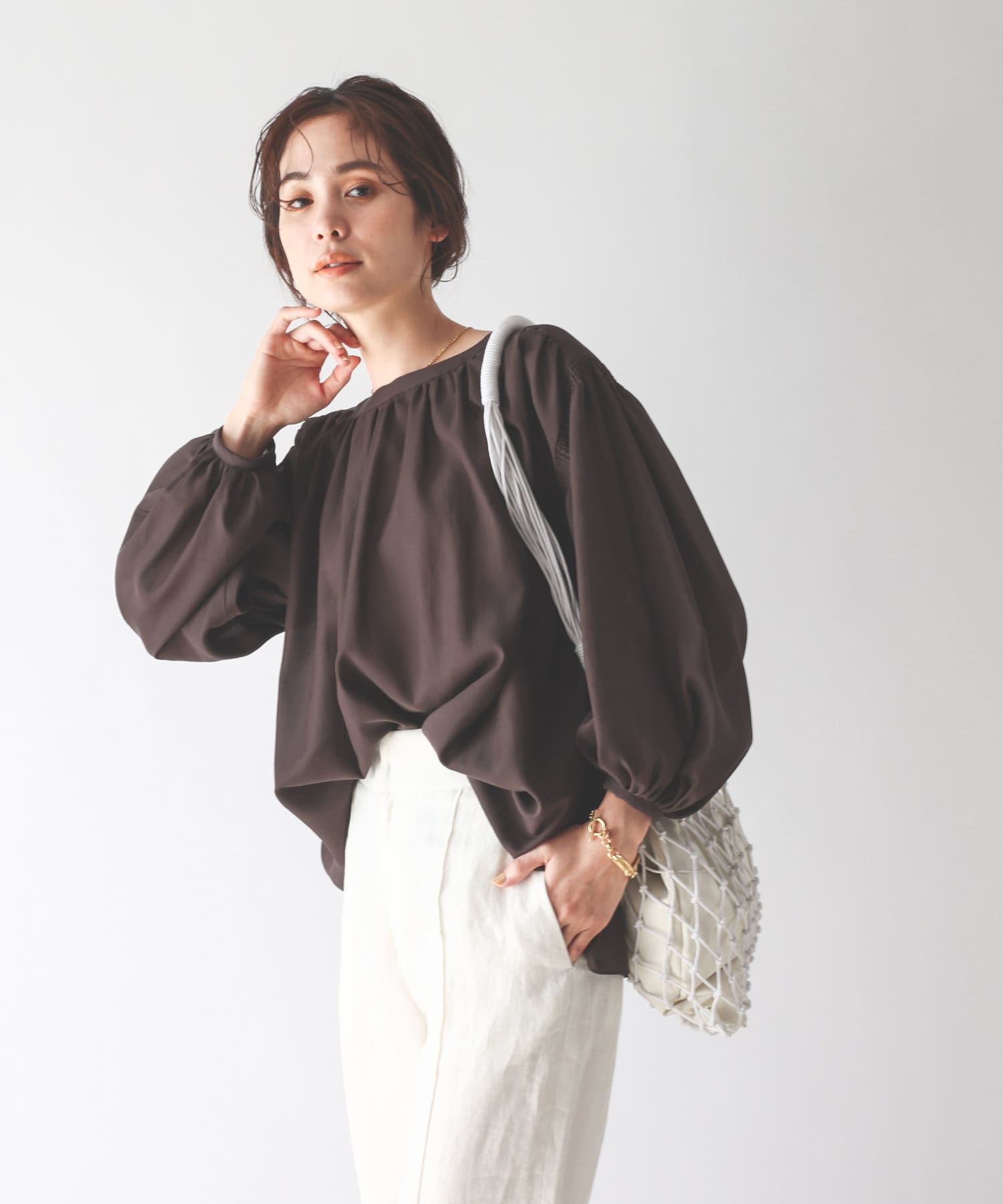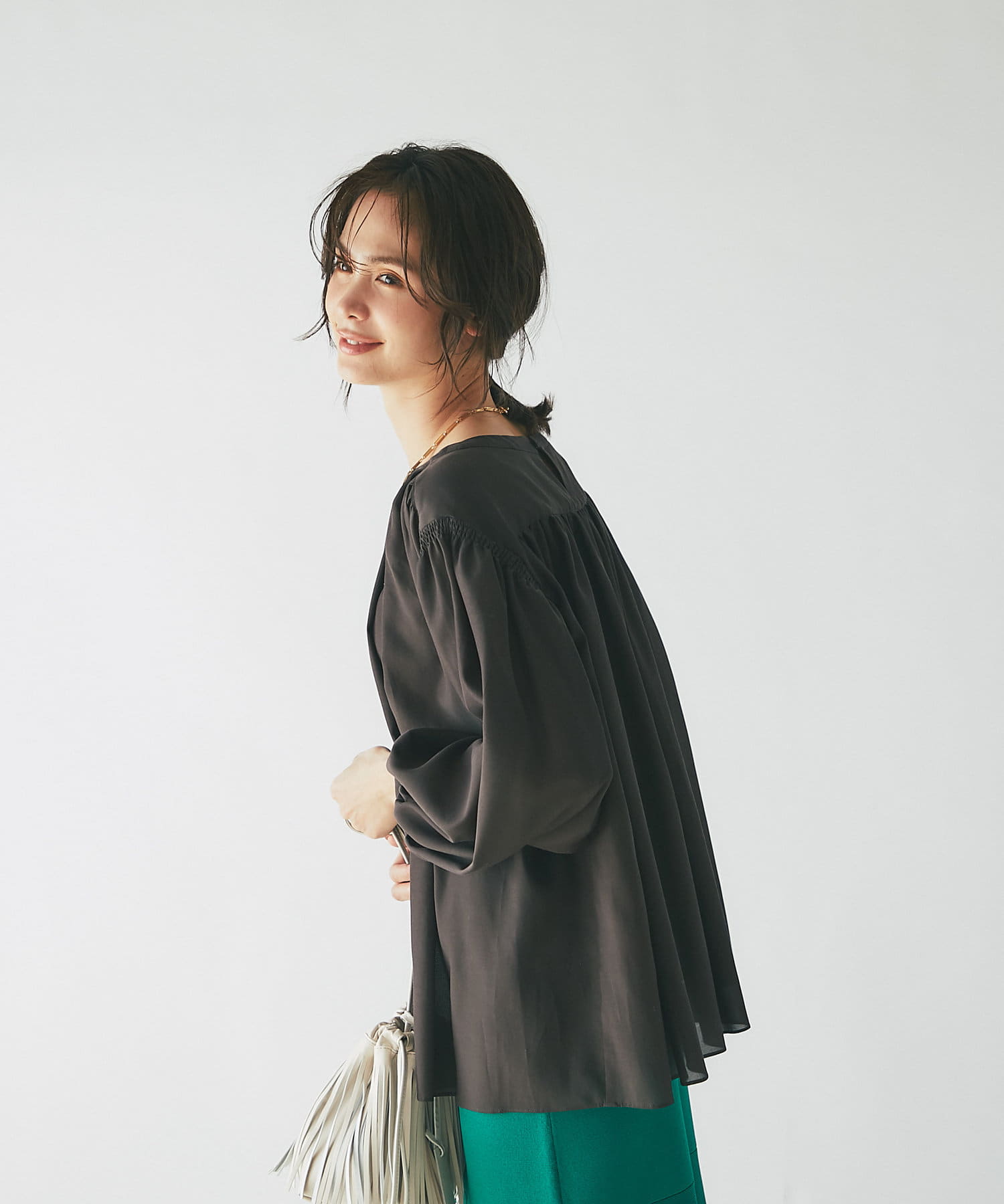 バルーンスリーブとたっぷりと細かく入ったギャザーが華やかなブラウス。