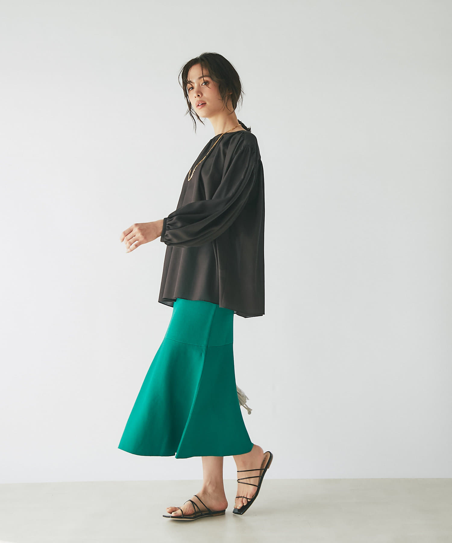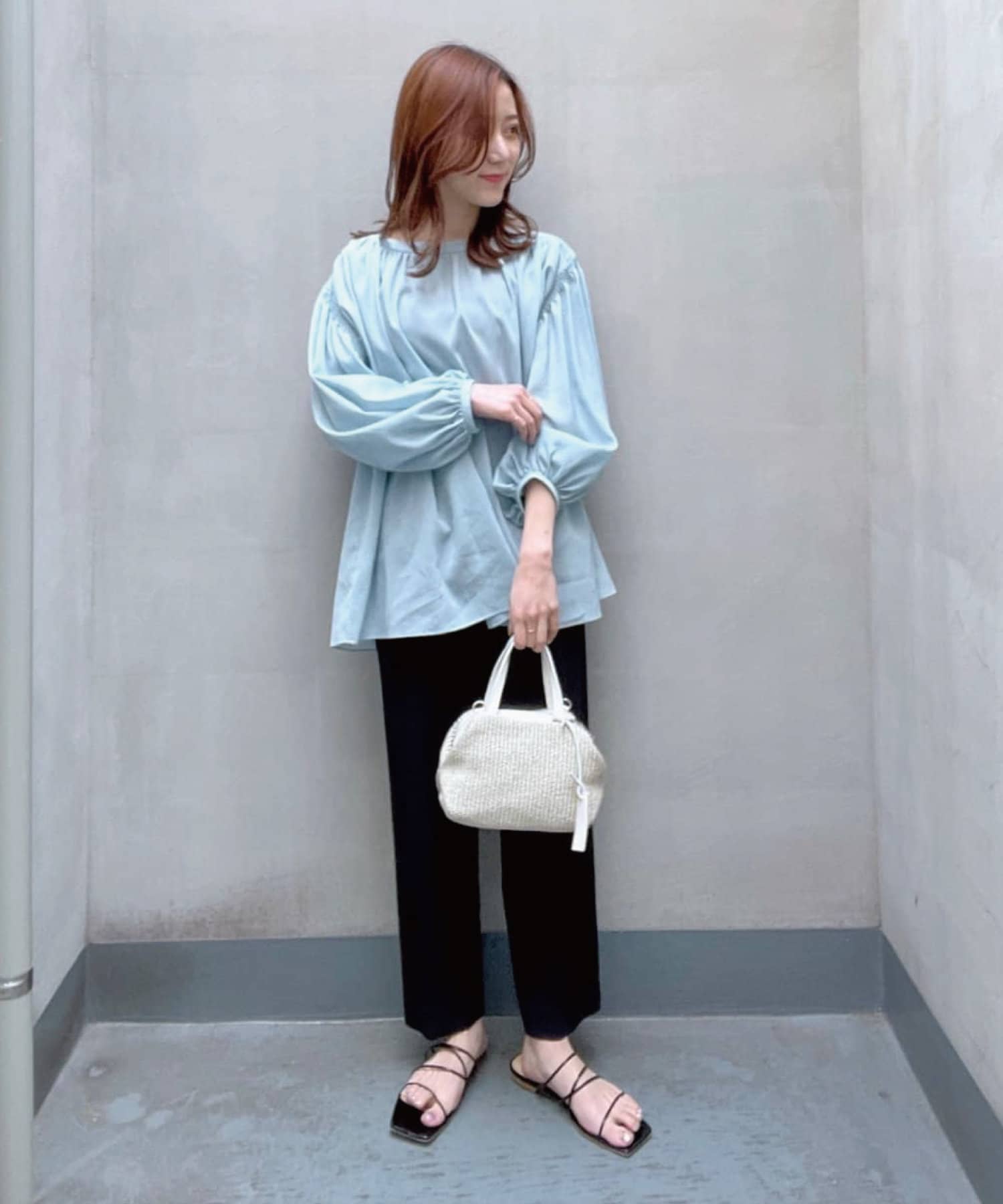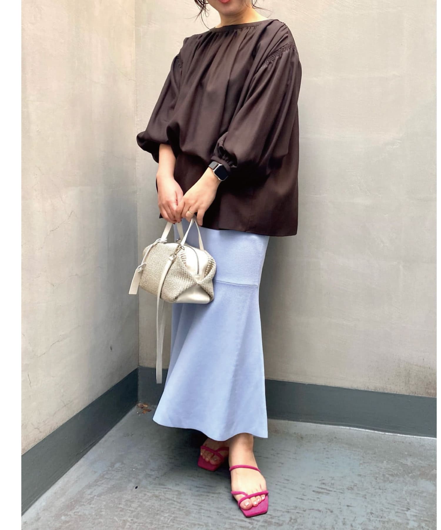 ボリュームのあるバルーンスリーブとゆったりとしたシルエットが女性らしさを引き立てる一枚です。