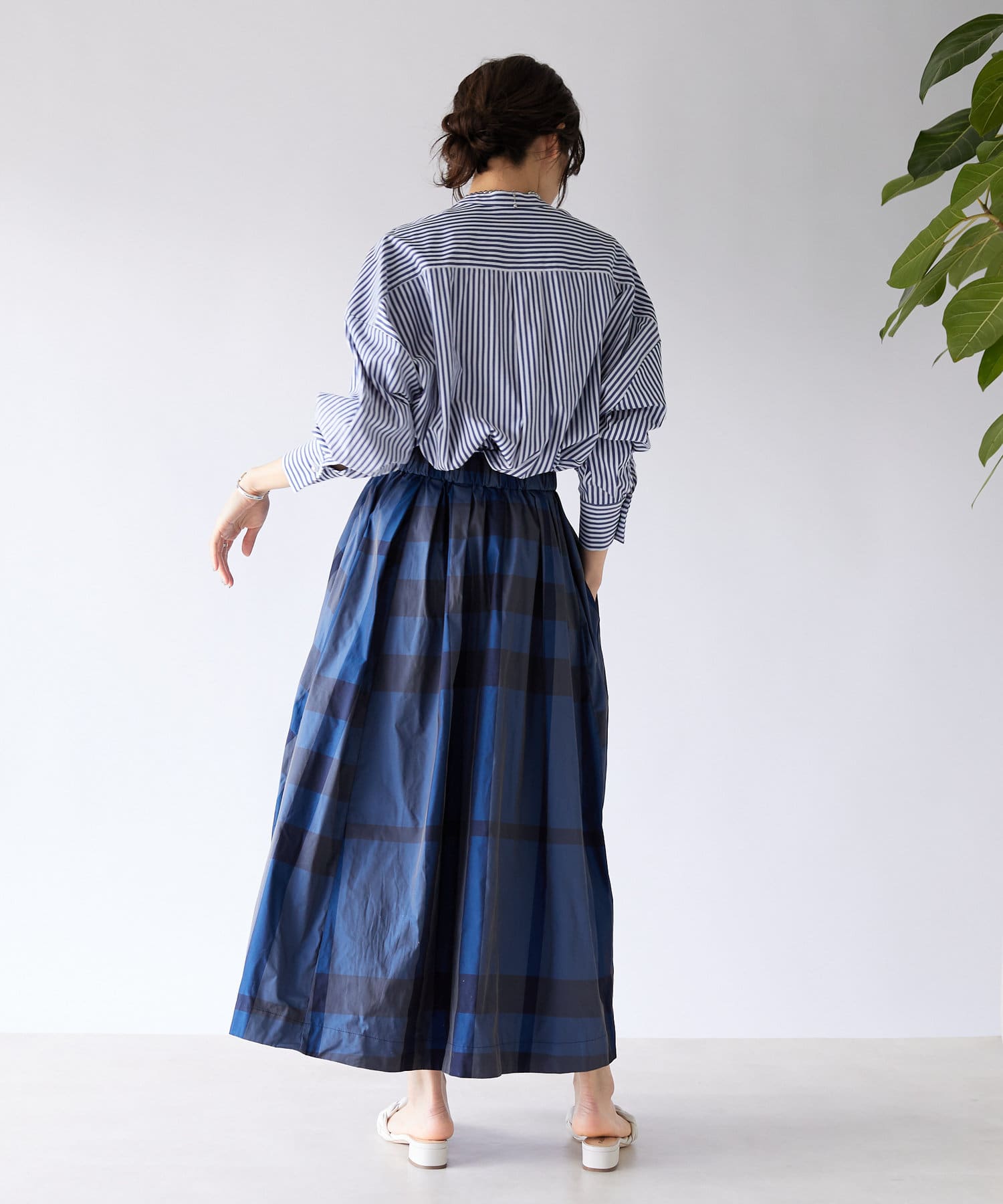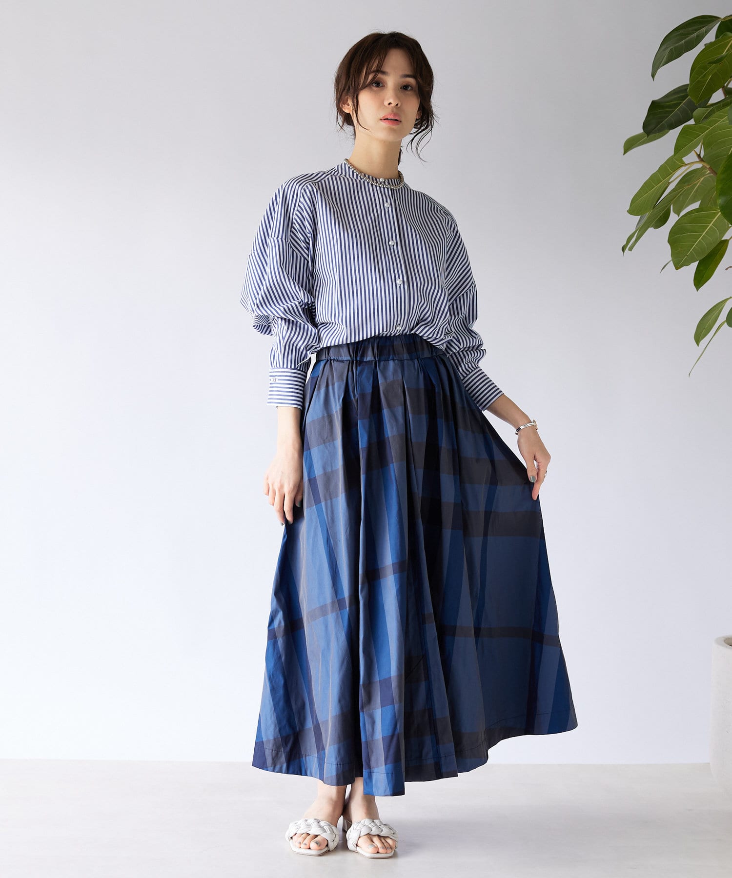 また、大人気のチェックスカートとの柄×柄のコーディネートも新鮮でおすすめです。