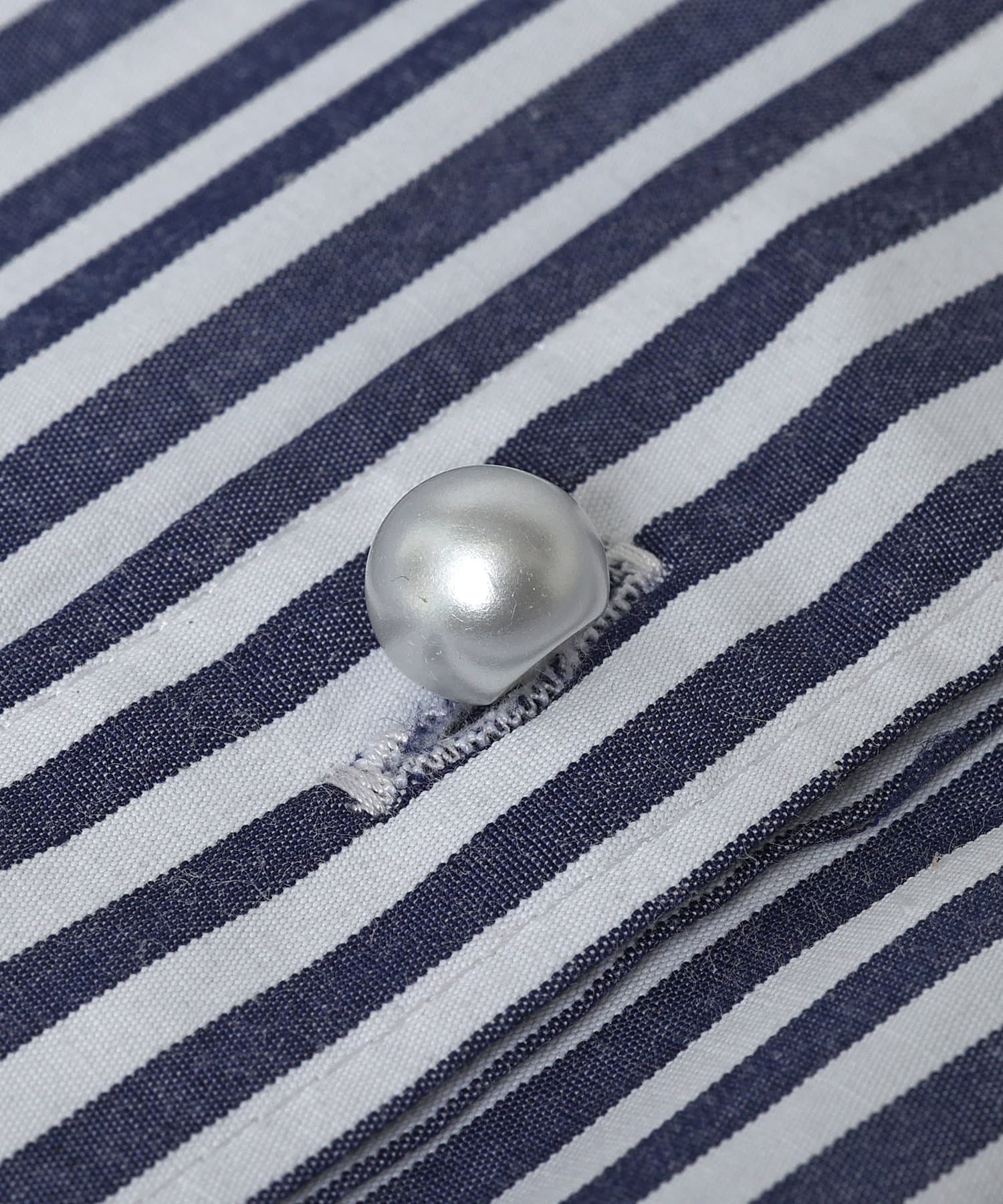 ホワイト×ネイビーのストライプ柄にホワイトのパール釦。