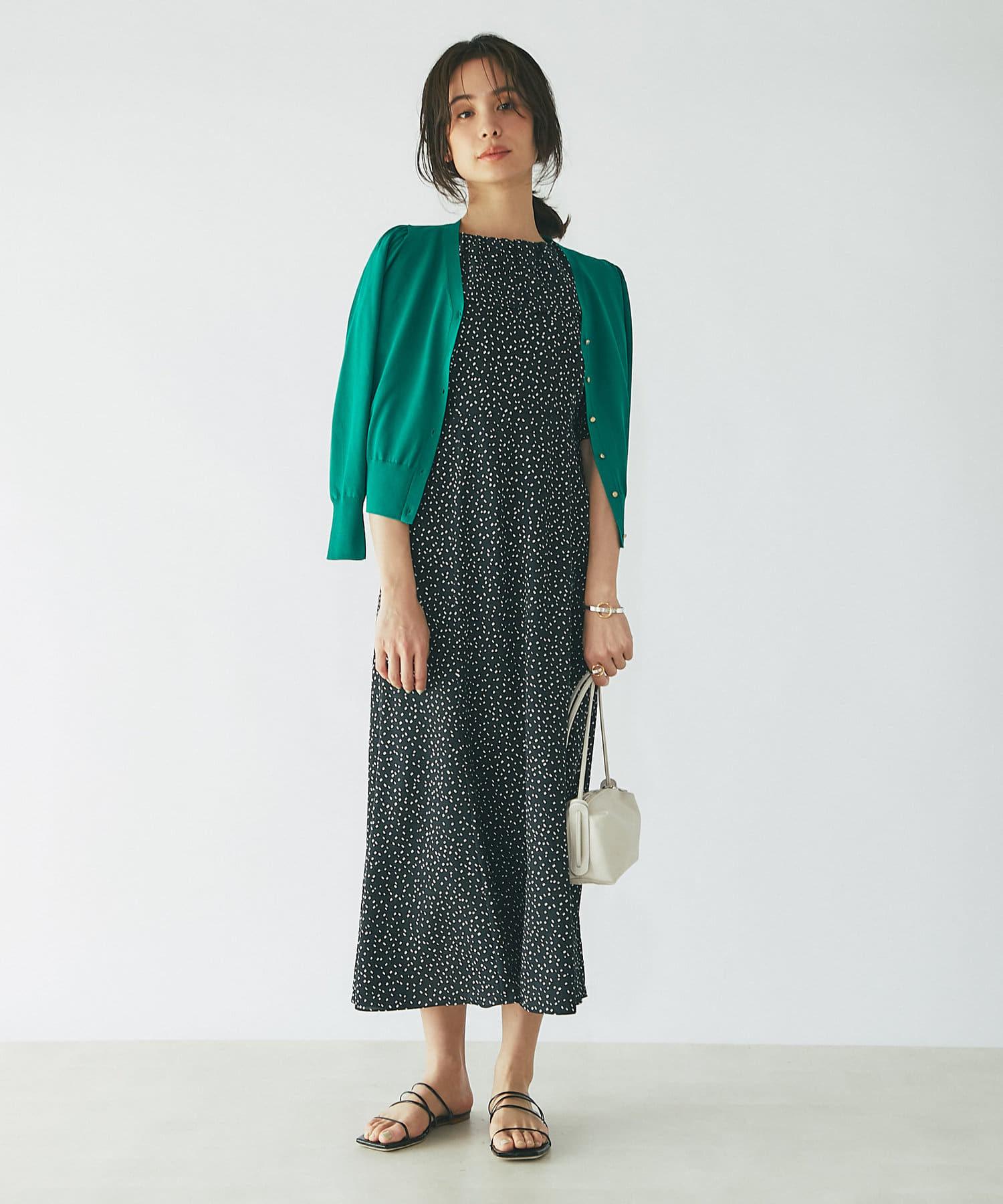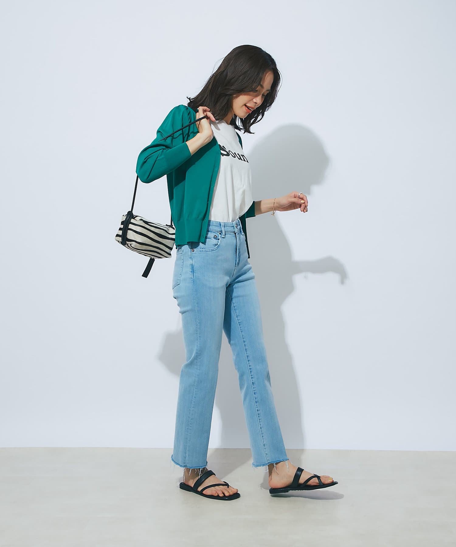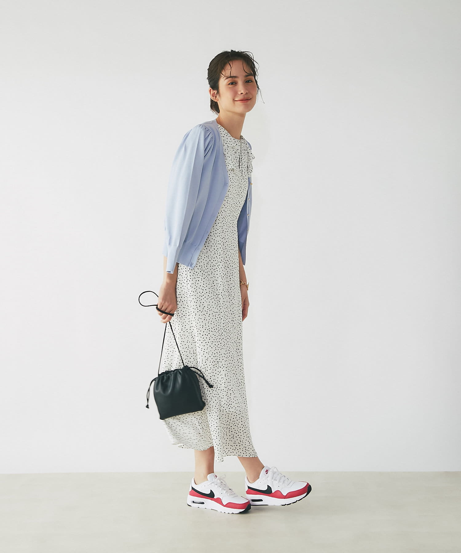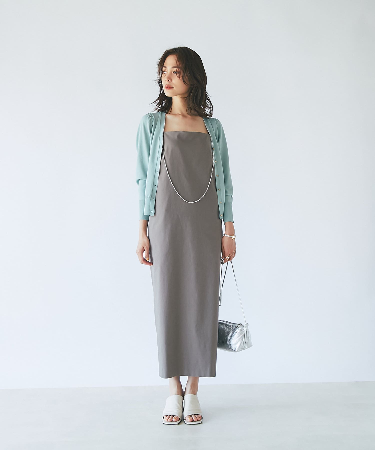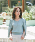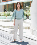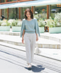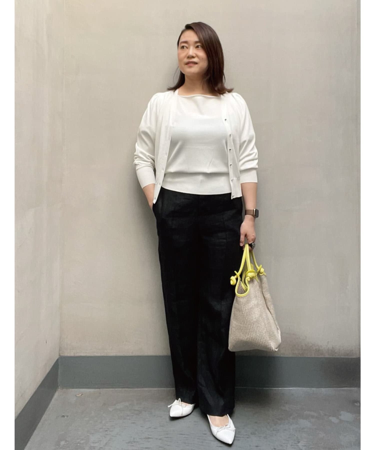 クールタッチシリーズのカーディガンを肩にかけリラックス感を。