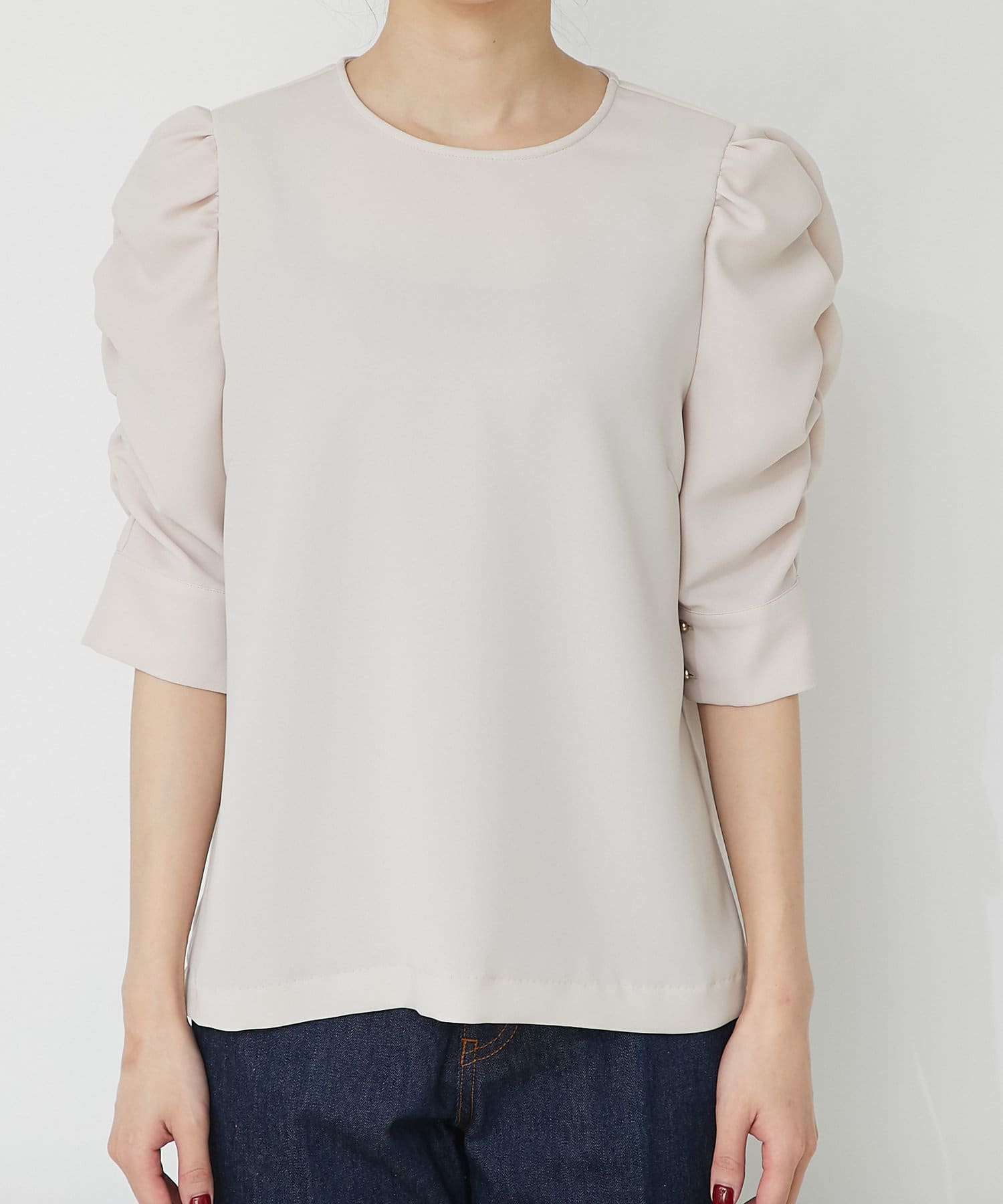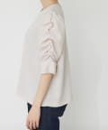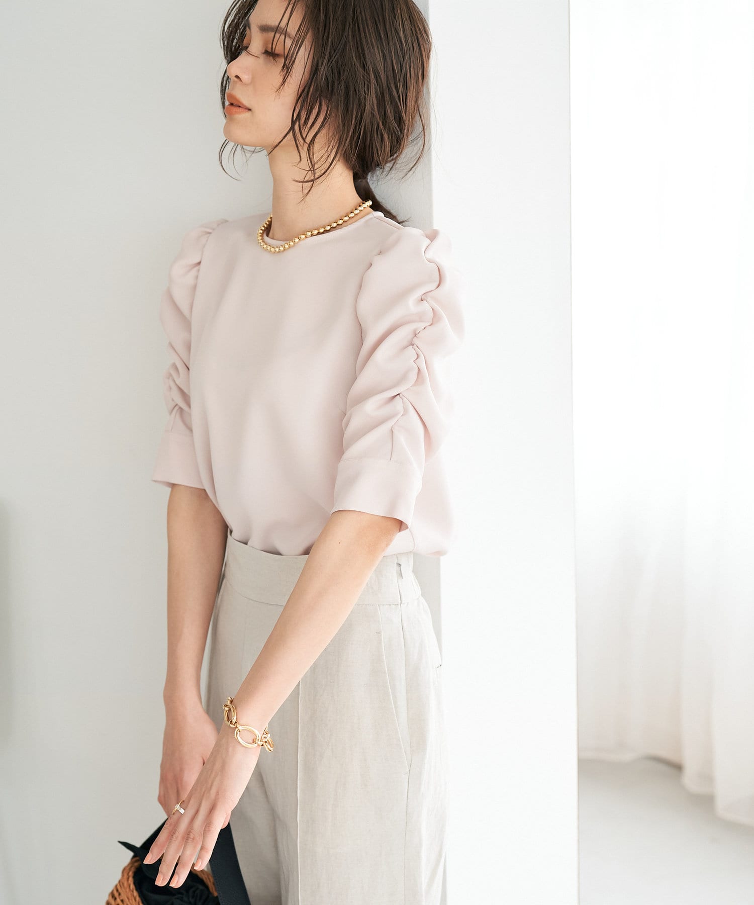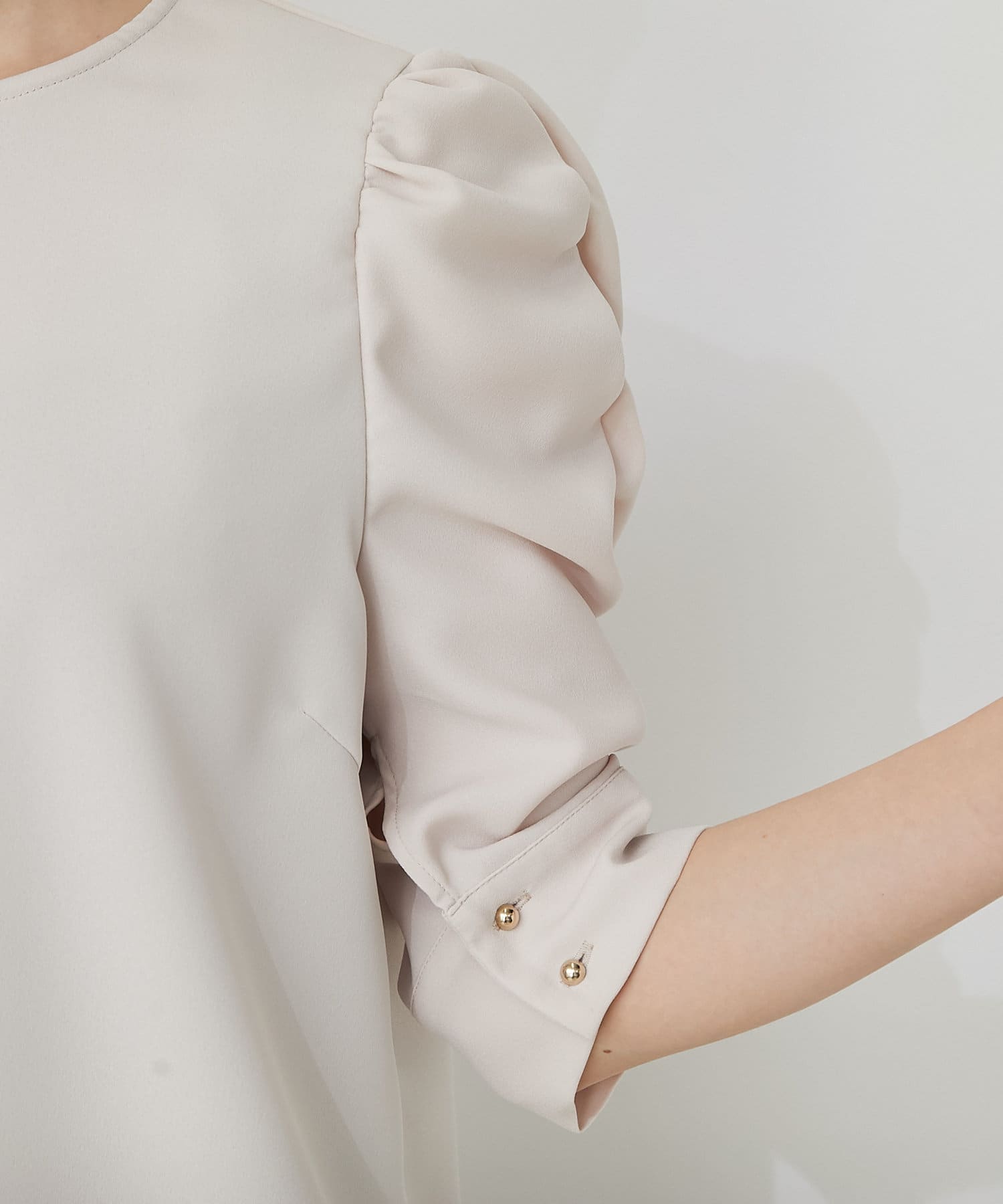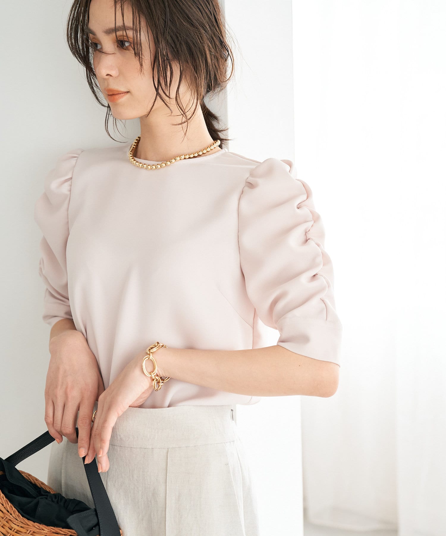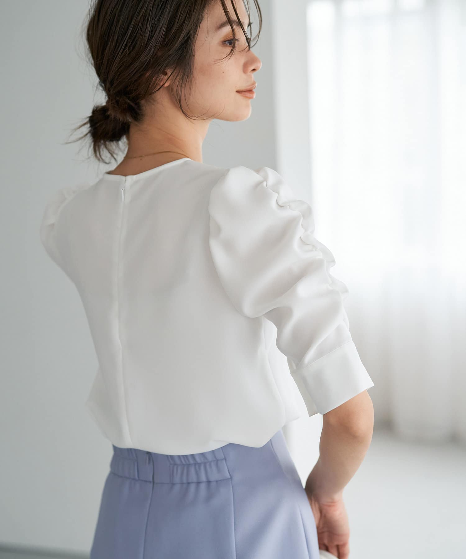 袖中心のギャザーとタックでふんわりとした立体感を表現したパワーショルダーが魅力の一枚。