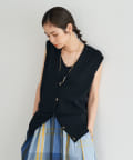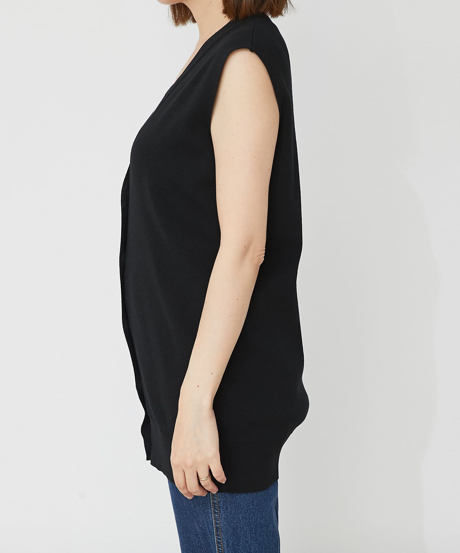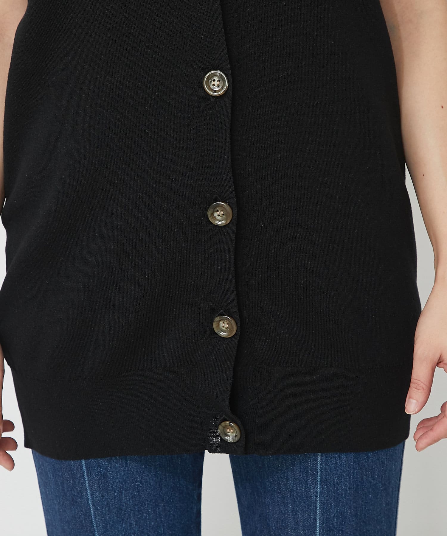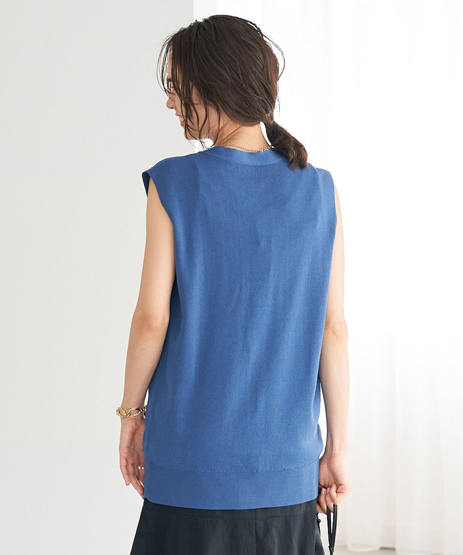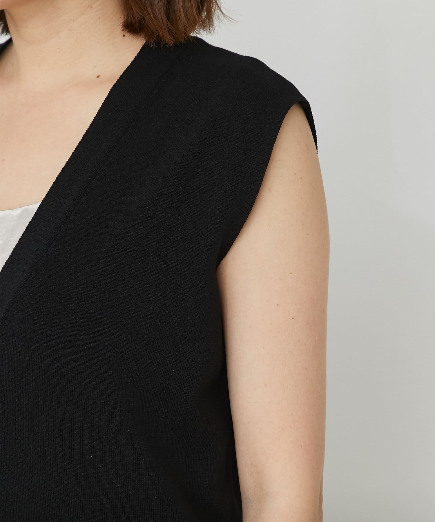 コットン・ナイロンの素材を使用した、季節感のあるさらりとした肌触りのスリーブレスのカーディガン。