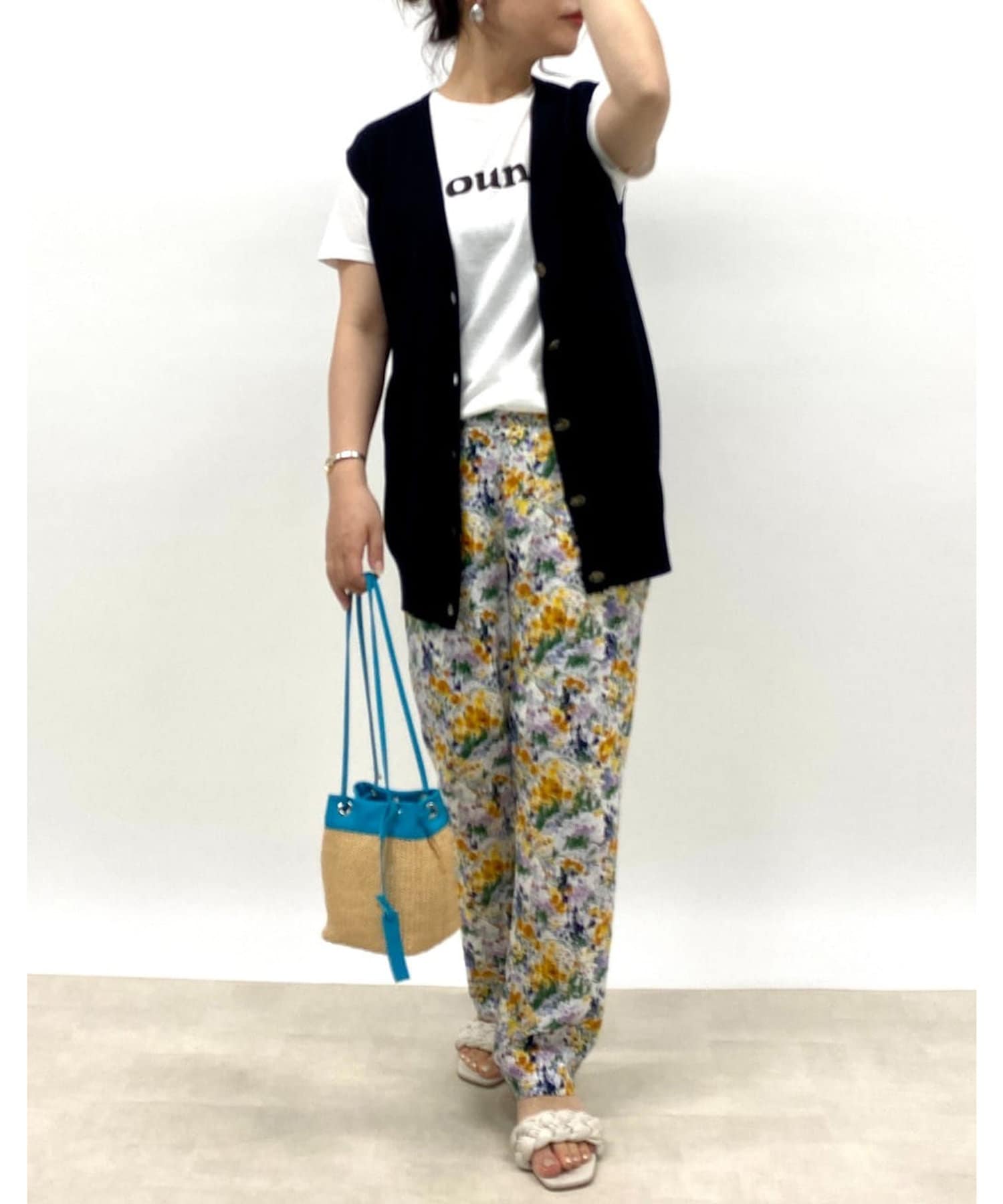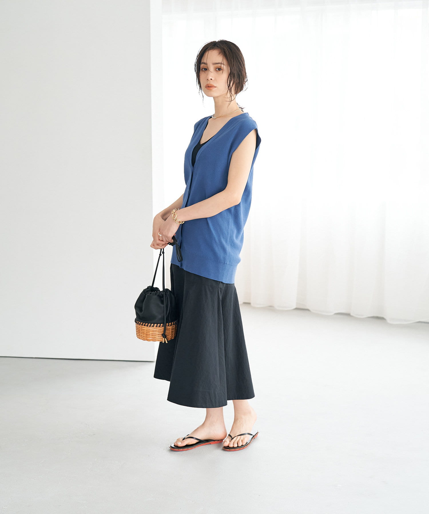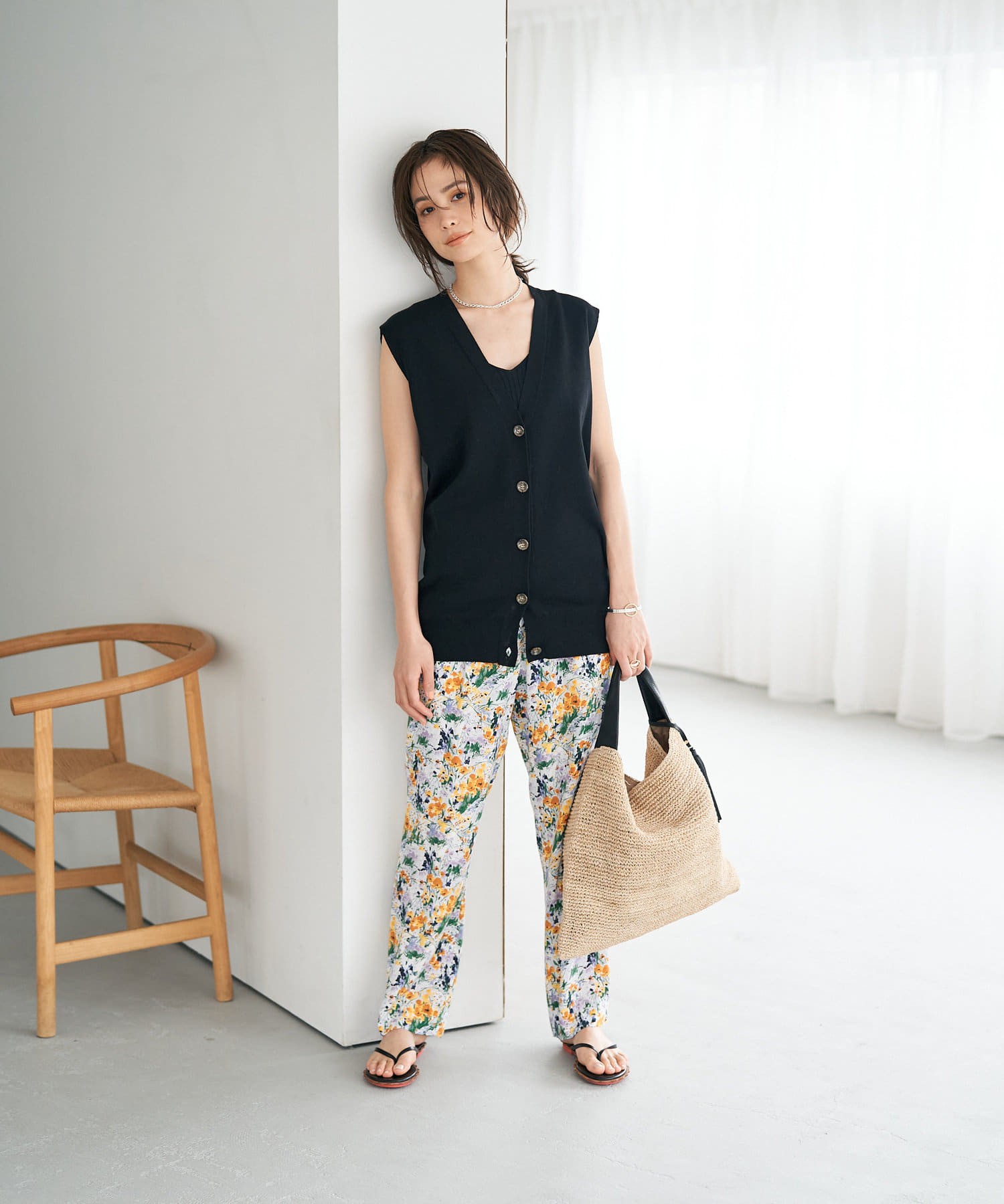 シンプルで使いやすいブラックとブルーなので、華やかなプリント柄のボトム合わせが特におすすめです。