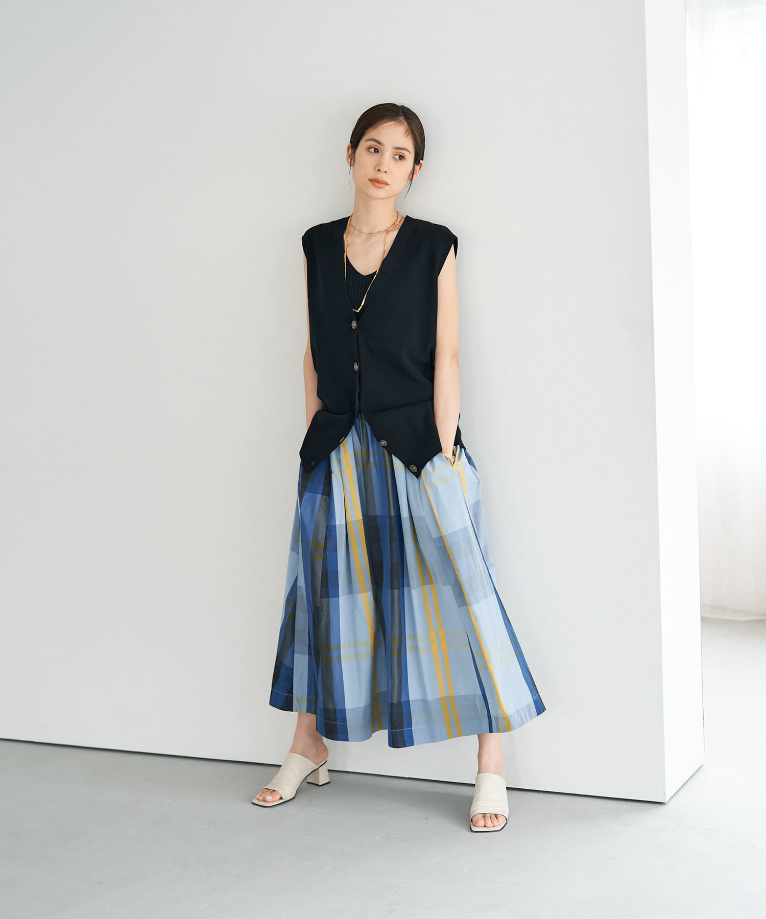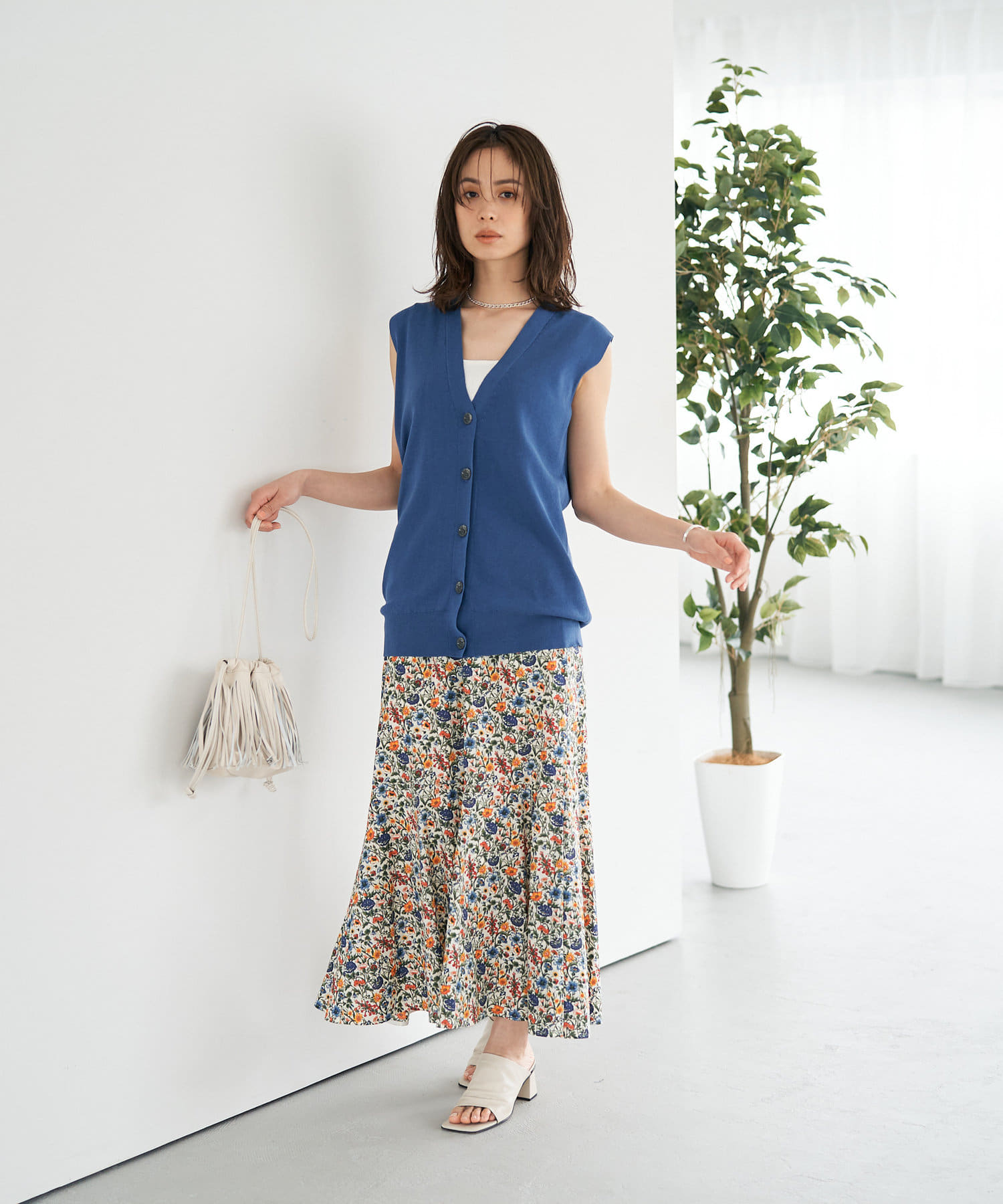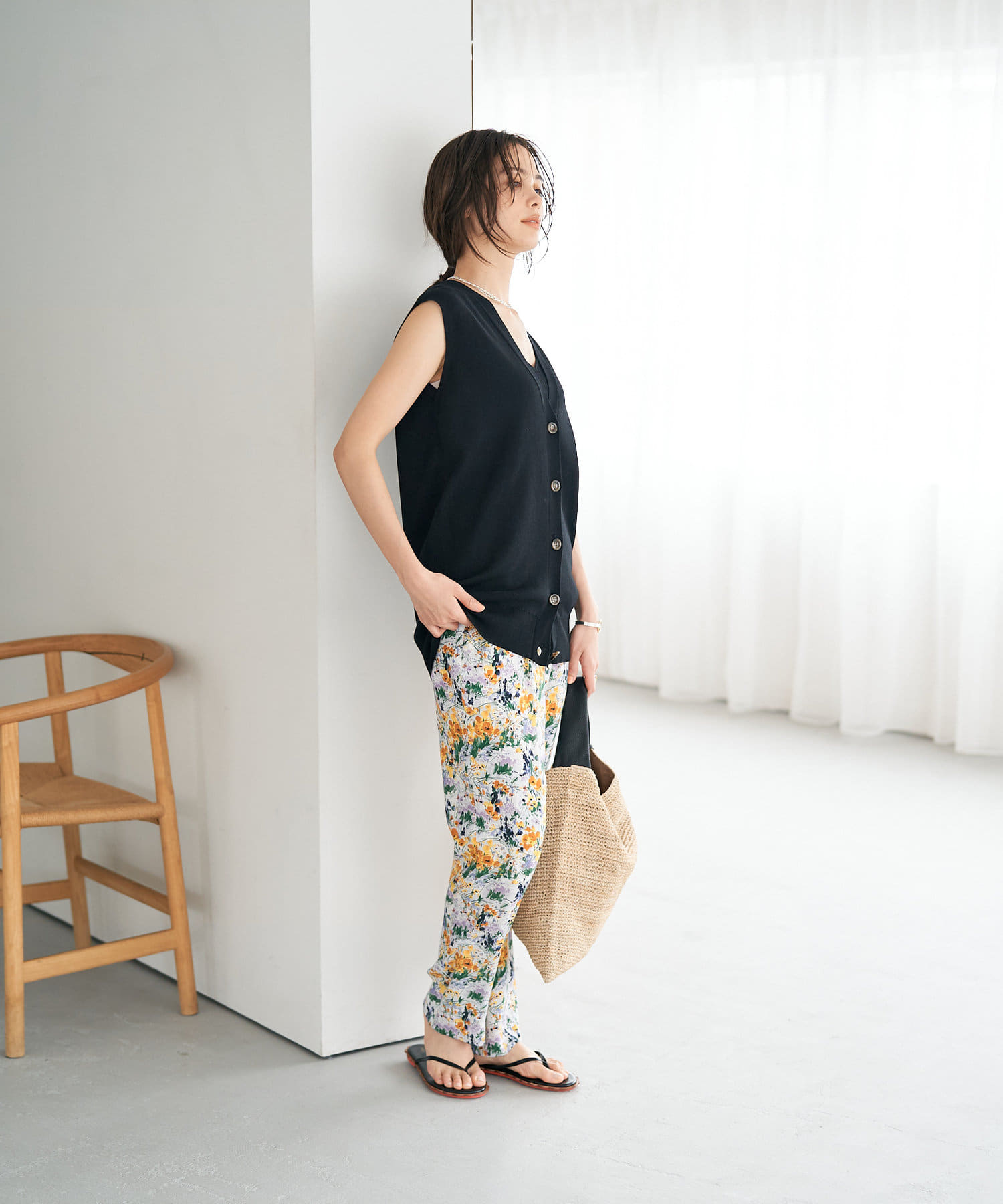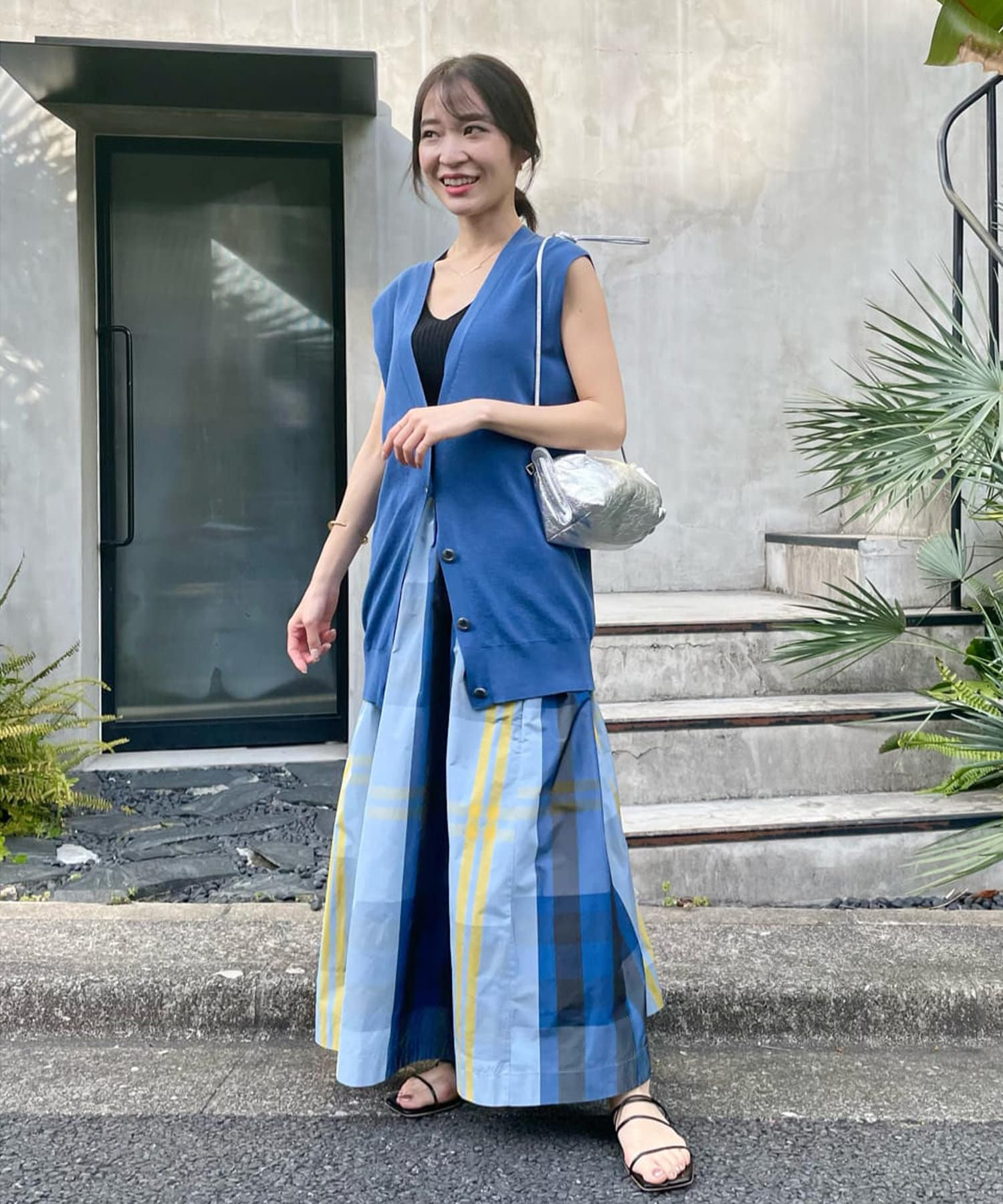 シンプルで使いやすいブラックとブルーなので、華やかなプリント柄のボトム合わせが特におすすめです。