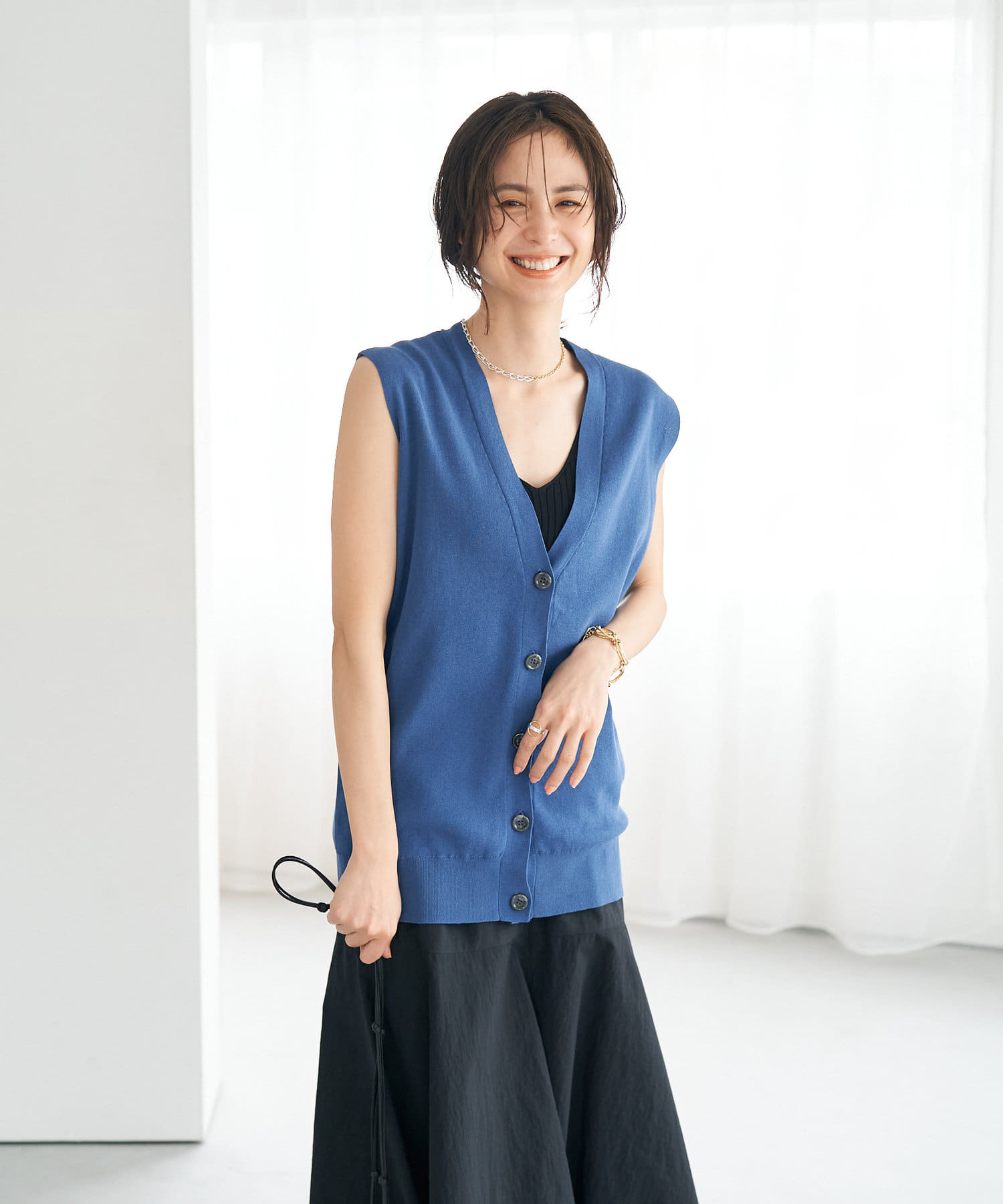 スリーブレスがいまどきな綿ナイロンのジレ風カーデ