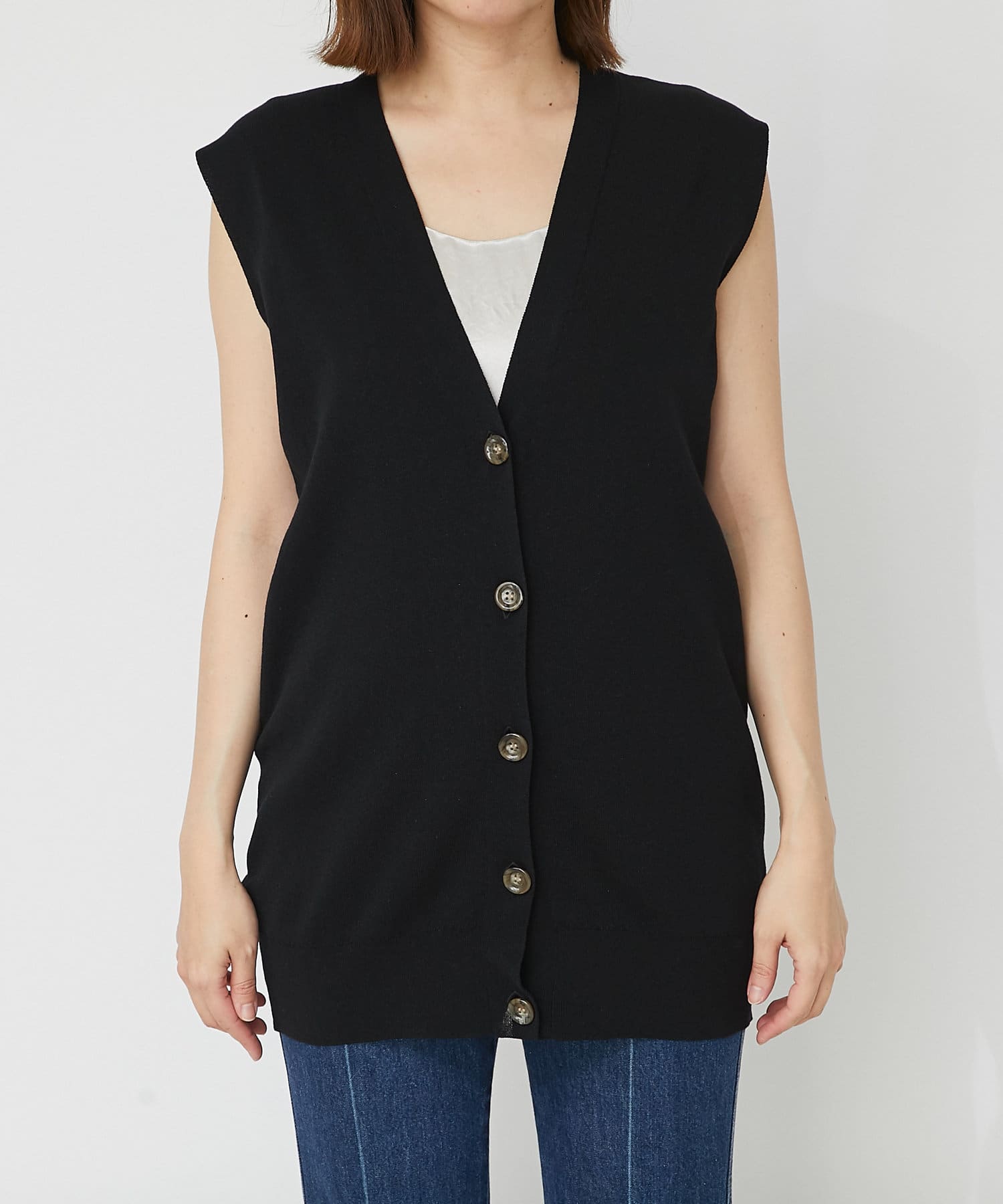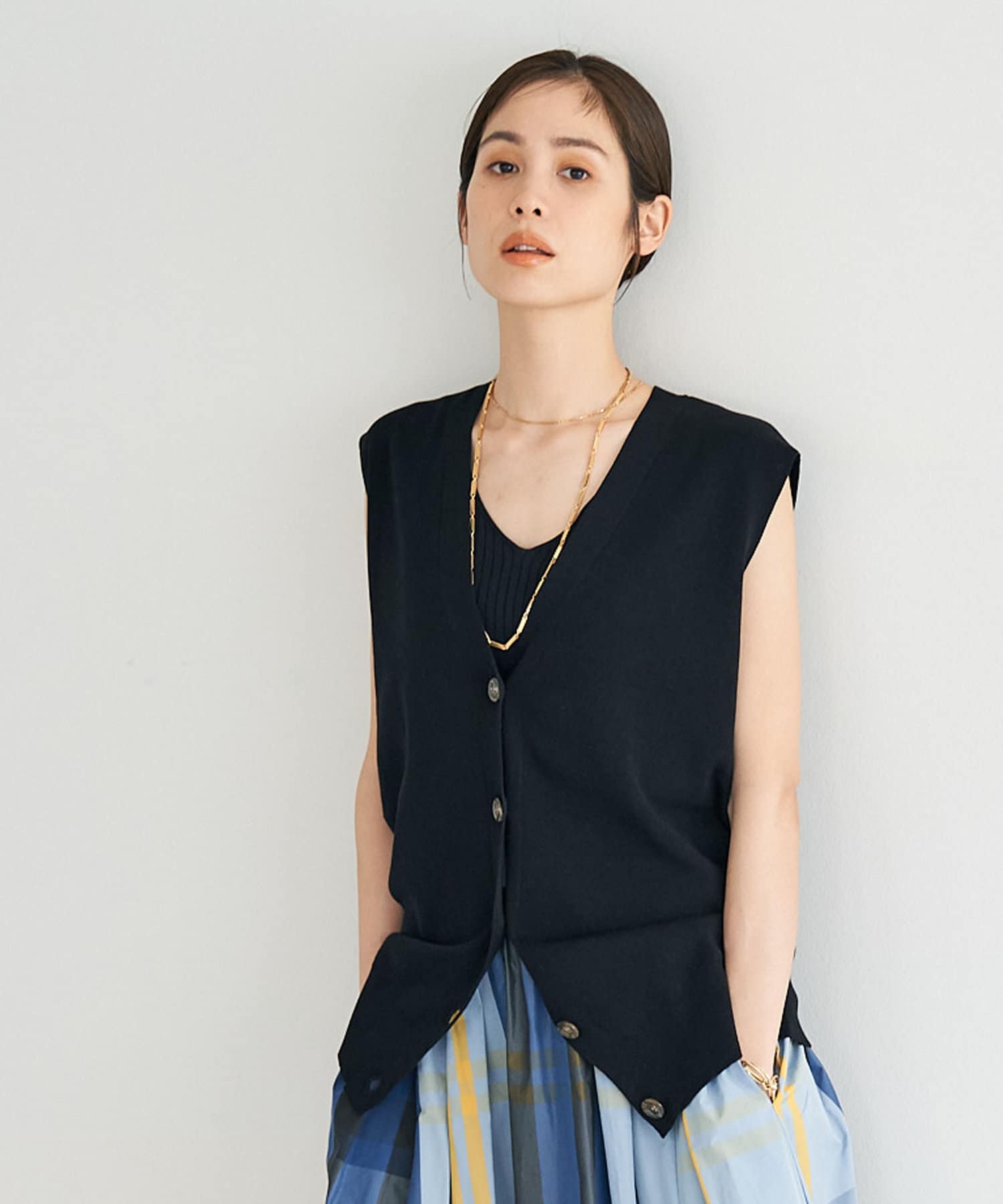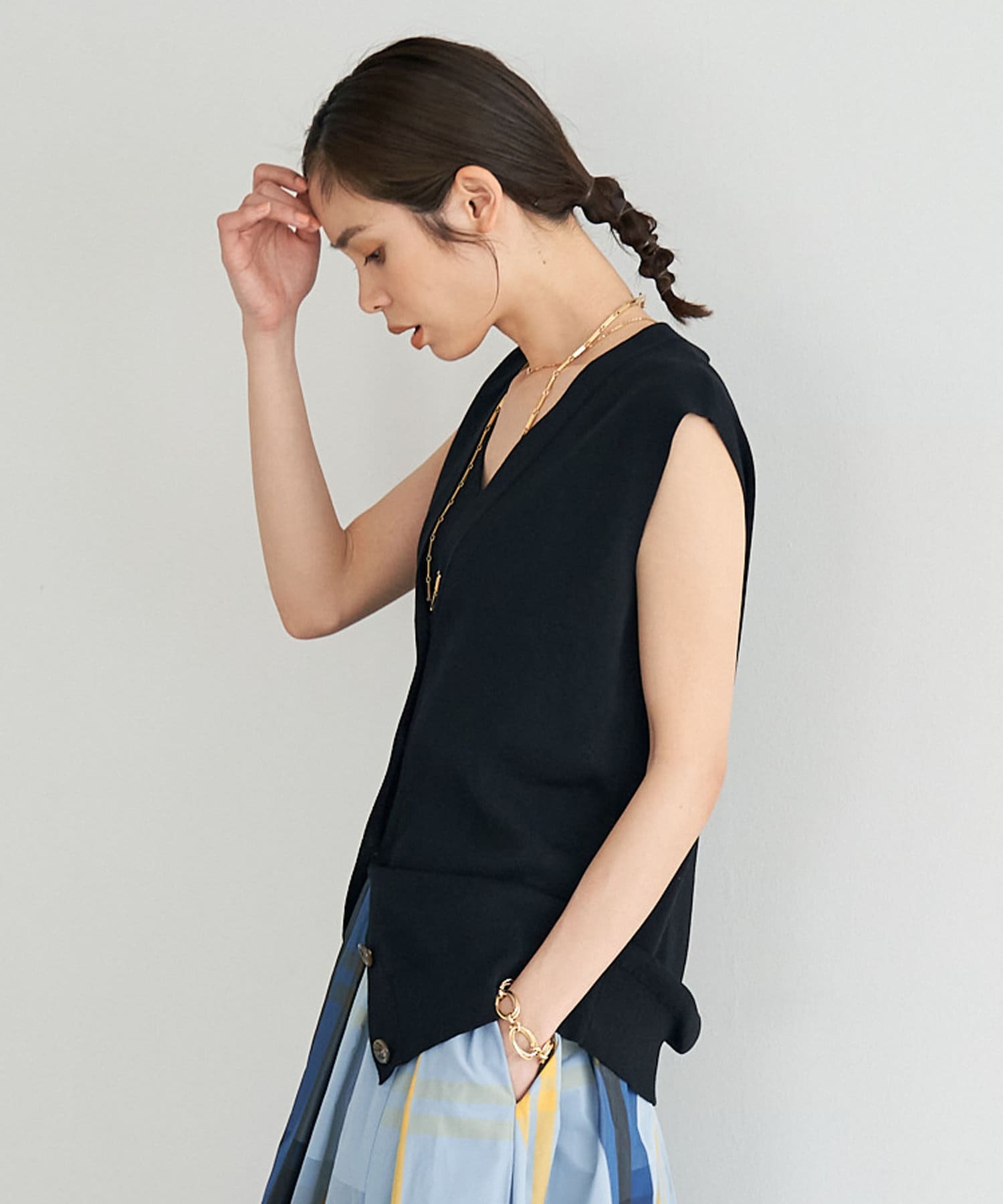 ジレのような印象でもあり、カーディガンのような使い方もできてしまう、これからのシーズンに大活躍するスリーブレスニットです^^
