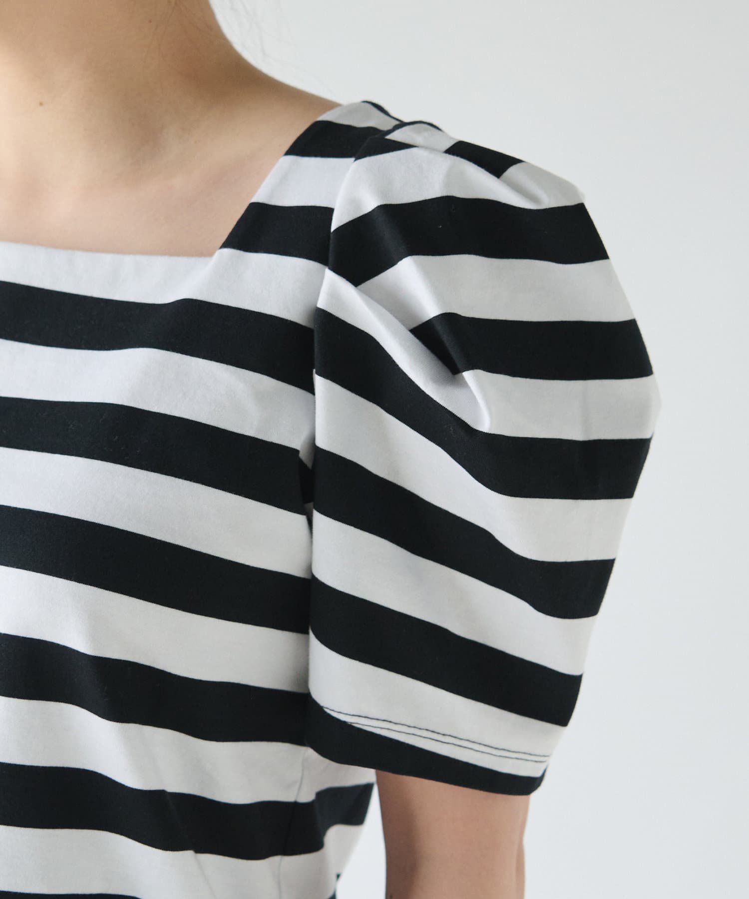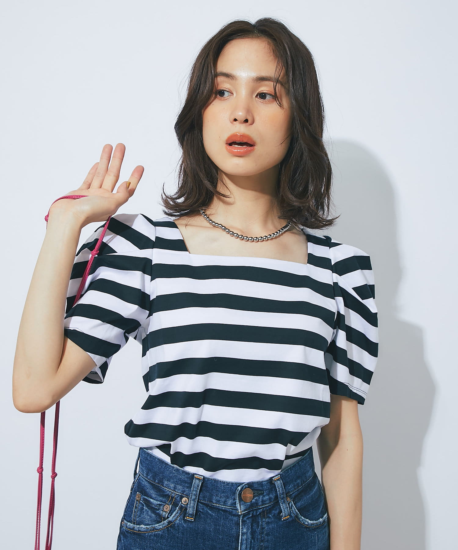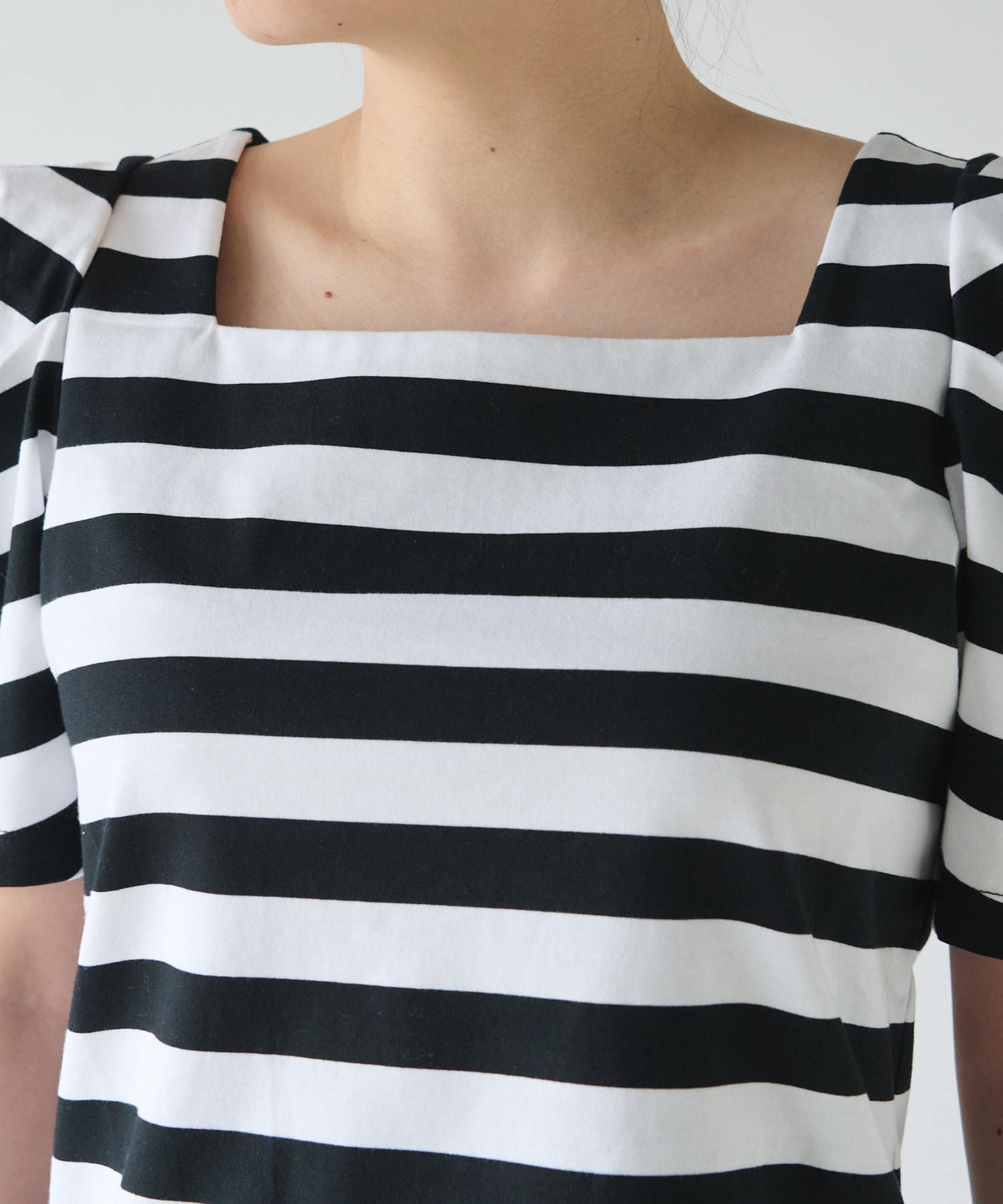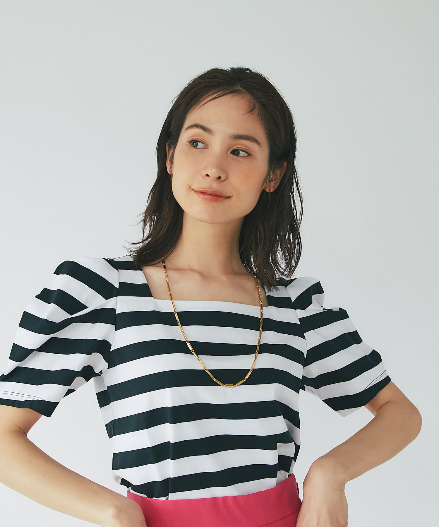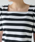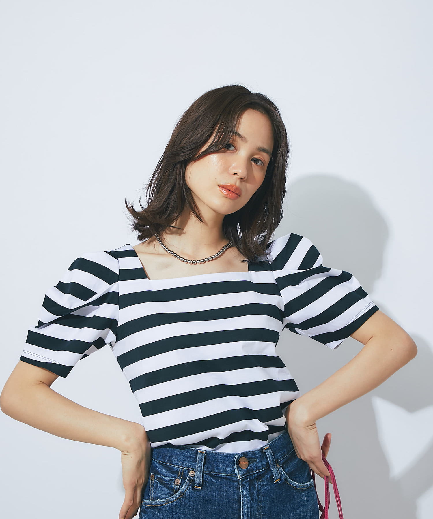 スクエアネックが女らしいボーダーのトップスはコンパクトなシルエットでボトムを選ばず万能に着回せます◎