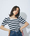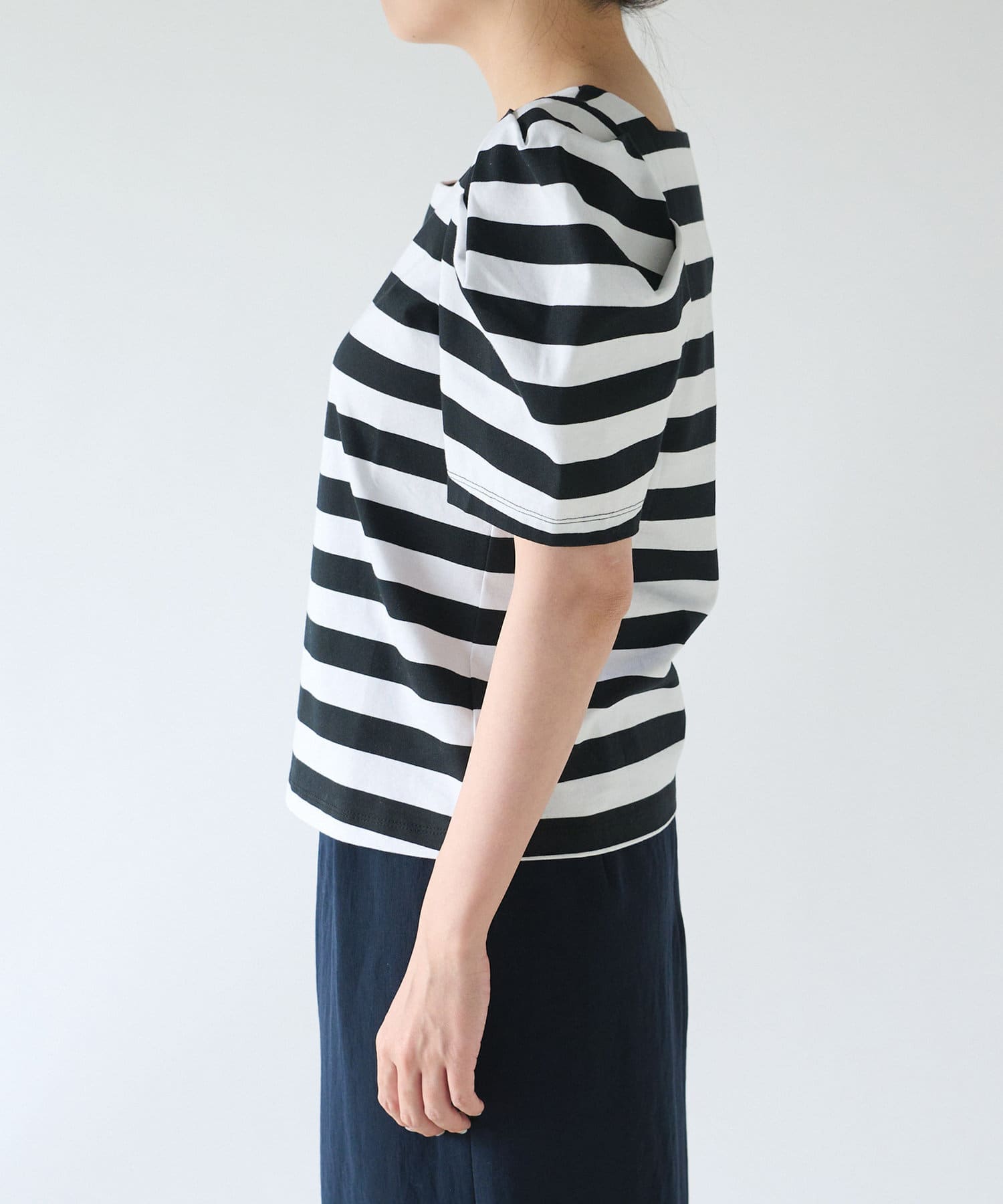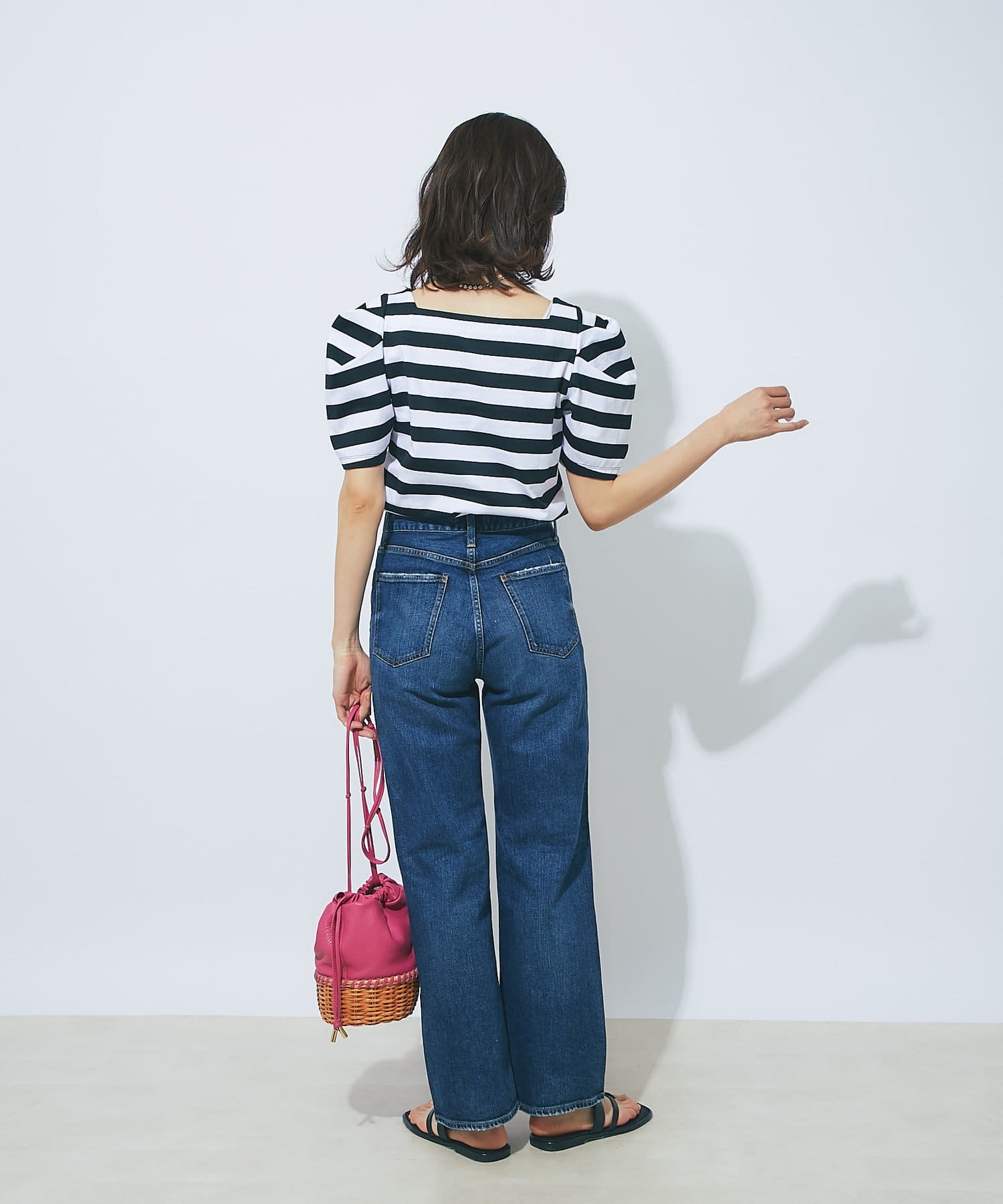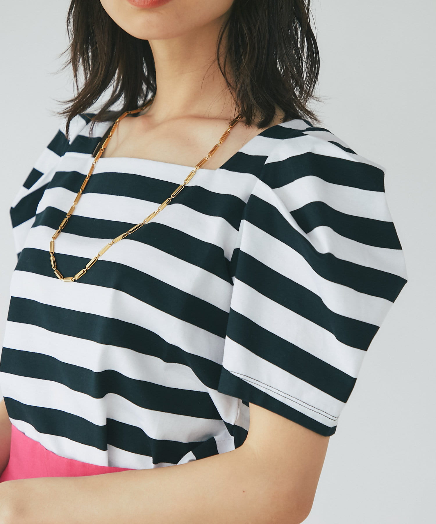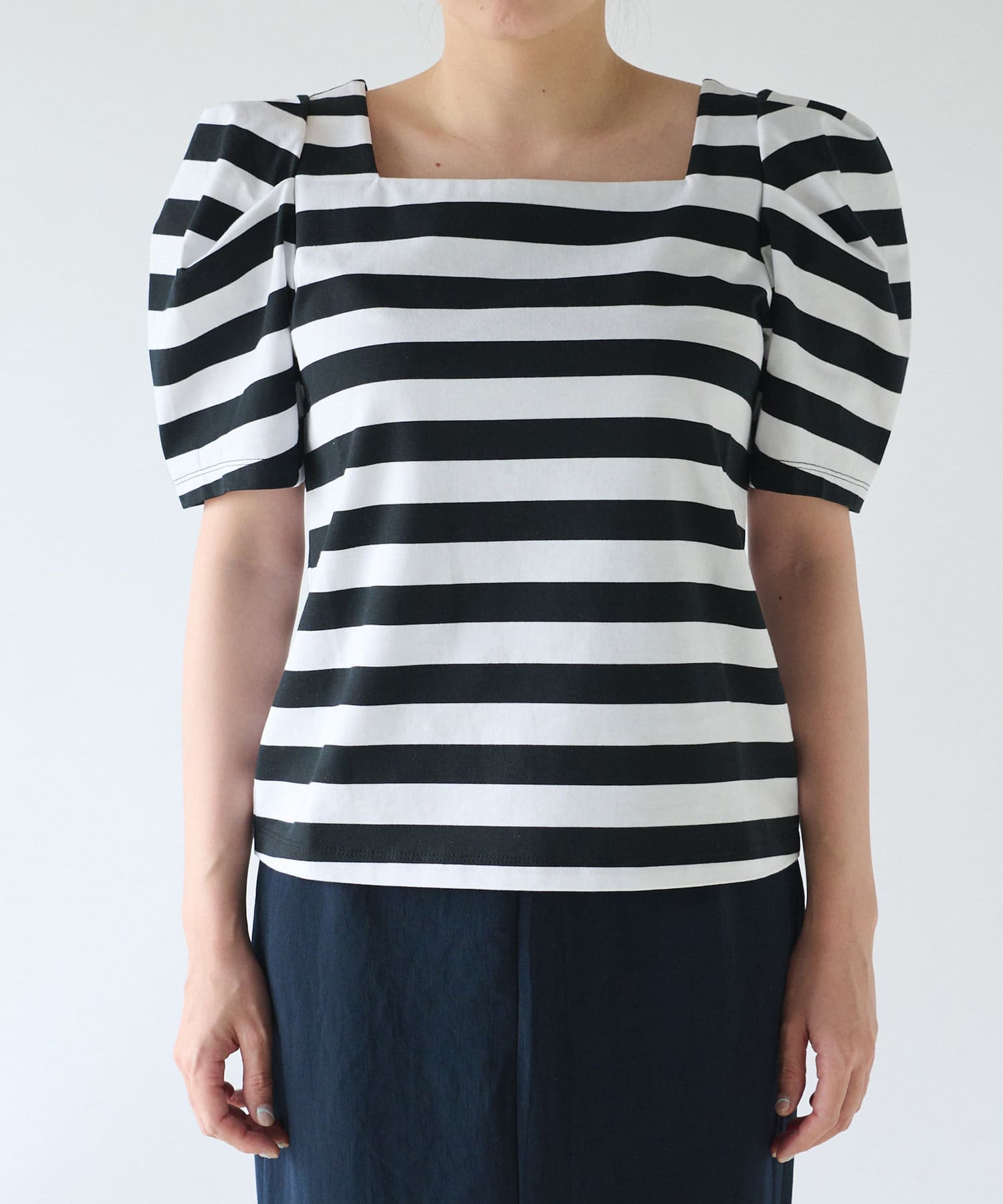 スクエアネックが女らしいボーダーのトップスはコンパクトなシルエットでボトムを選ばず万能に着回せます◎