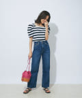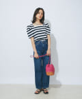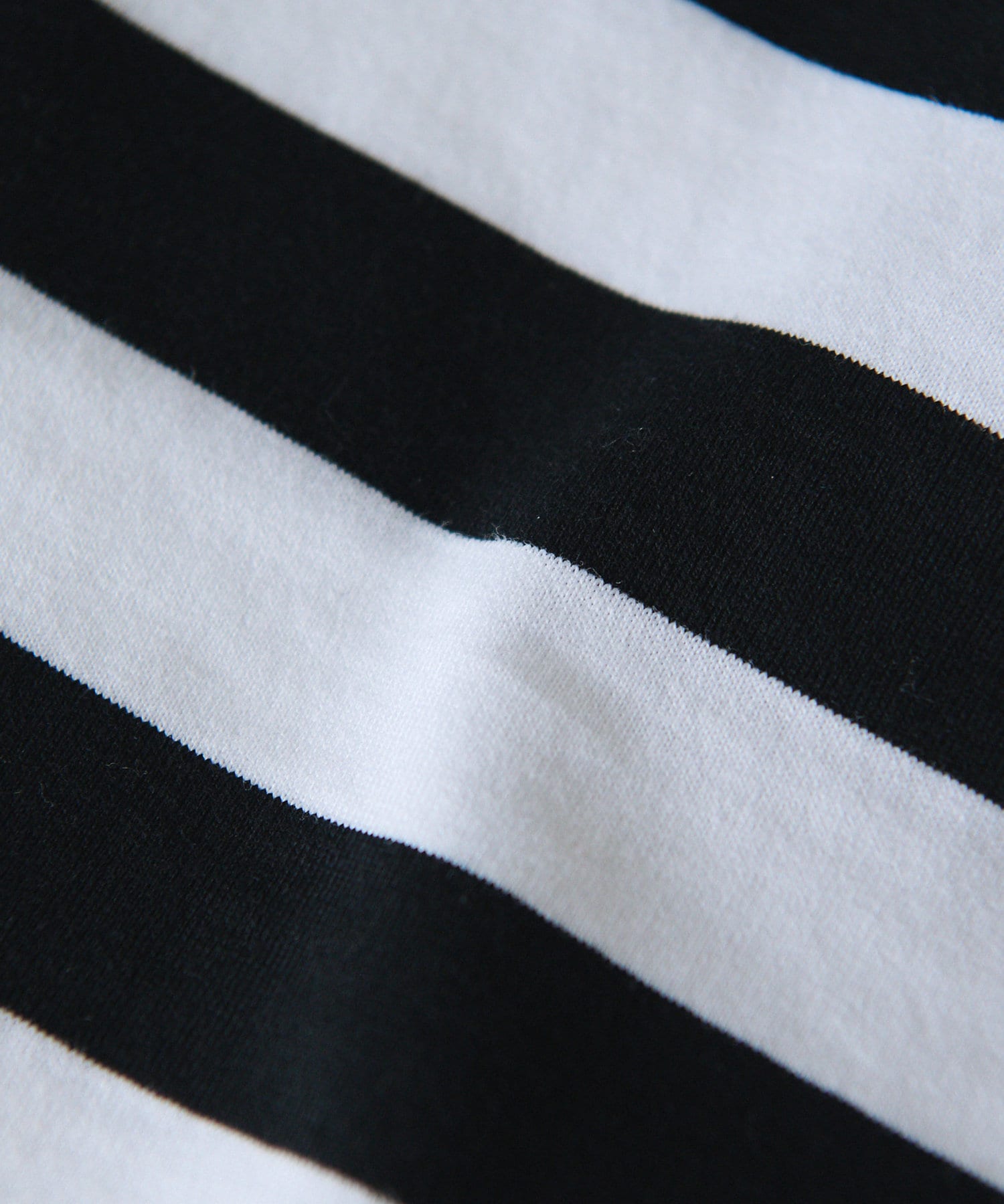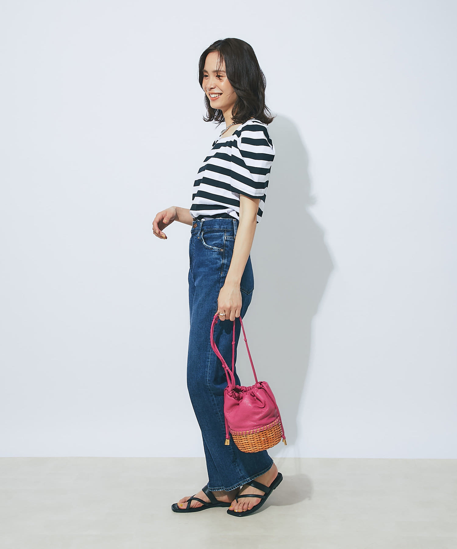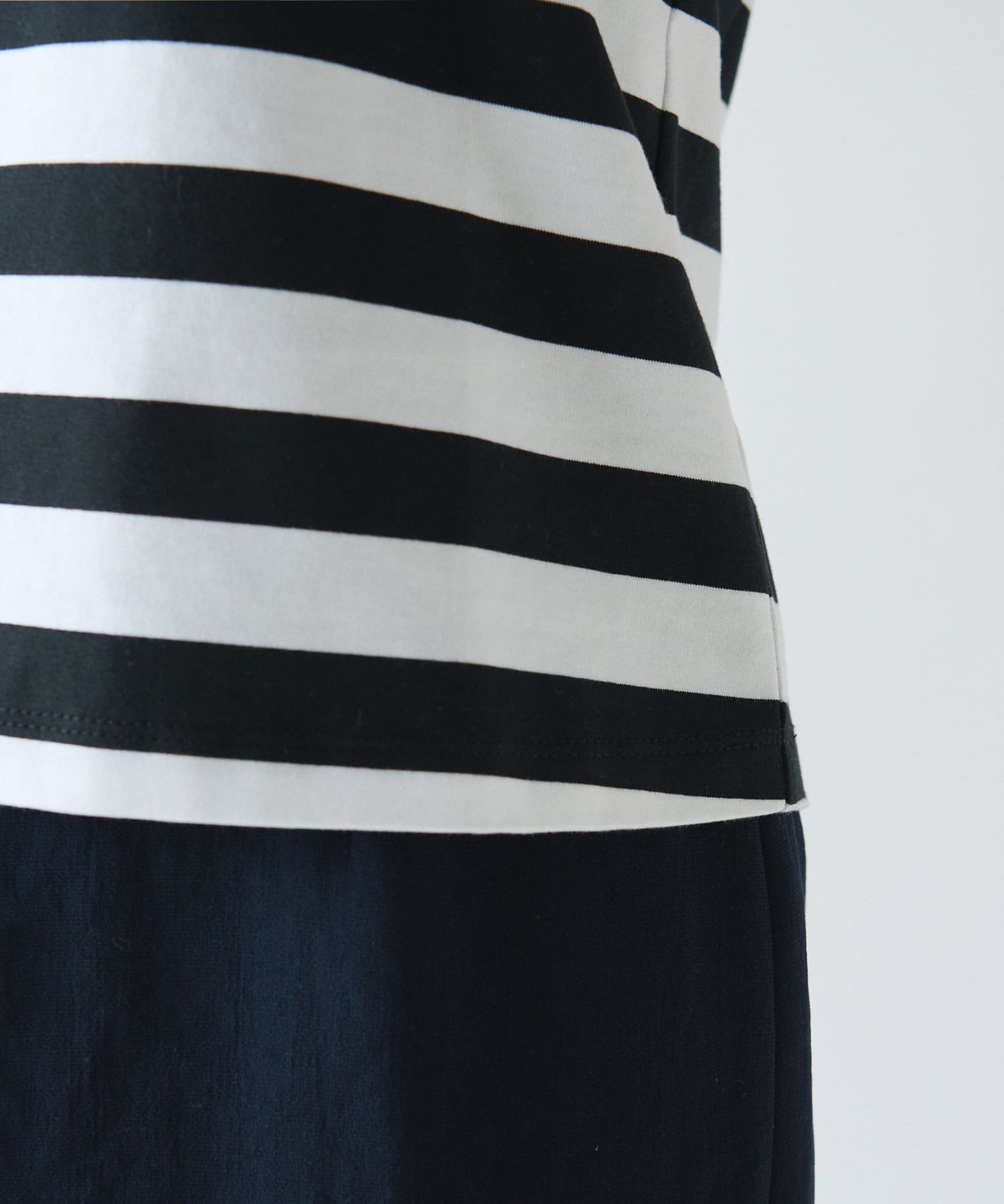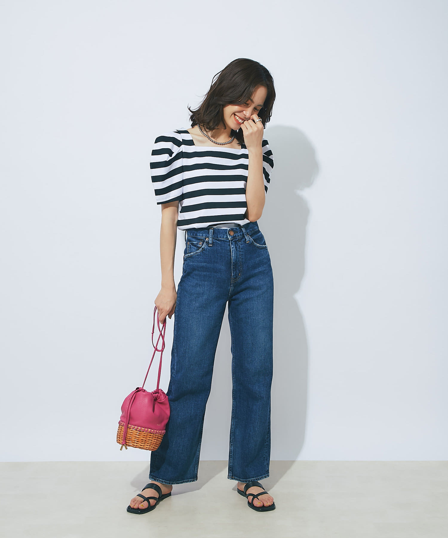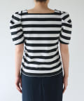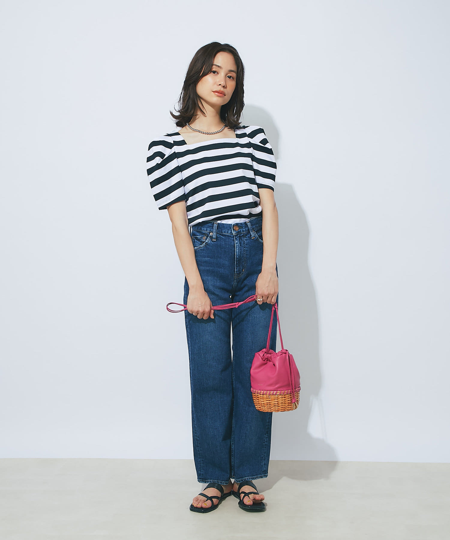 スクエアネックが女らしいボーダーのトップスはコンパクトなシルエットでボトムを選ばず万能に着回せます◎