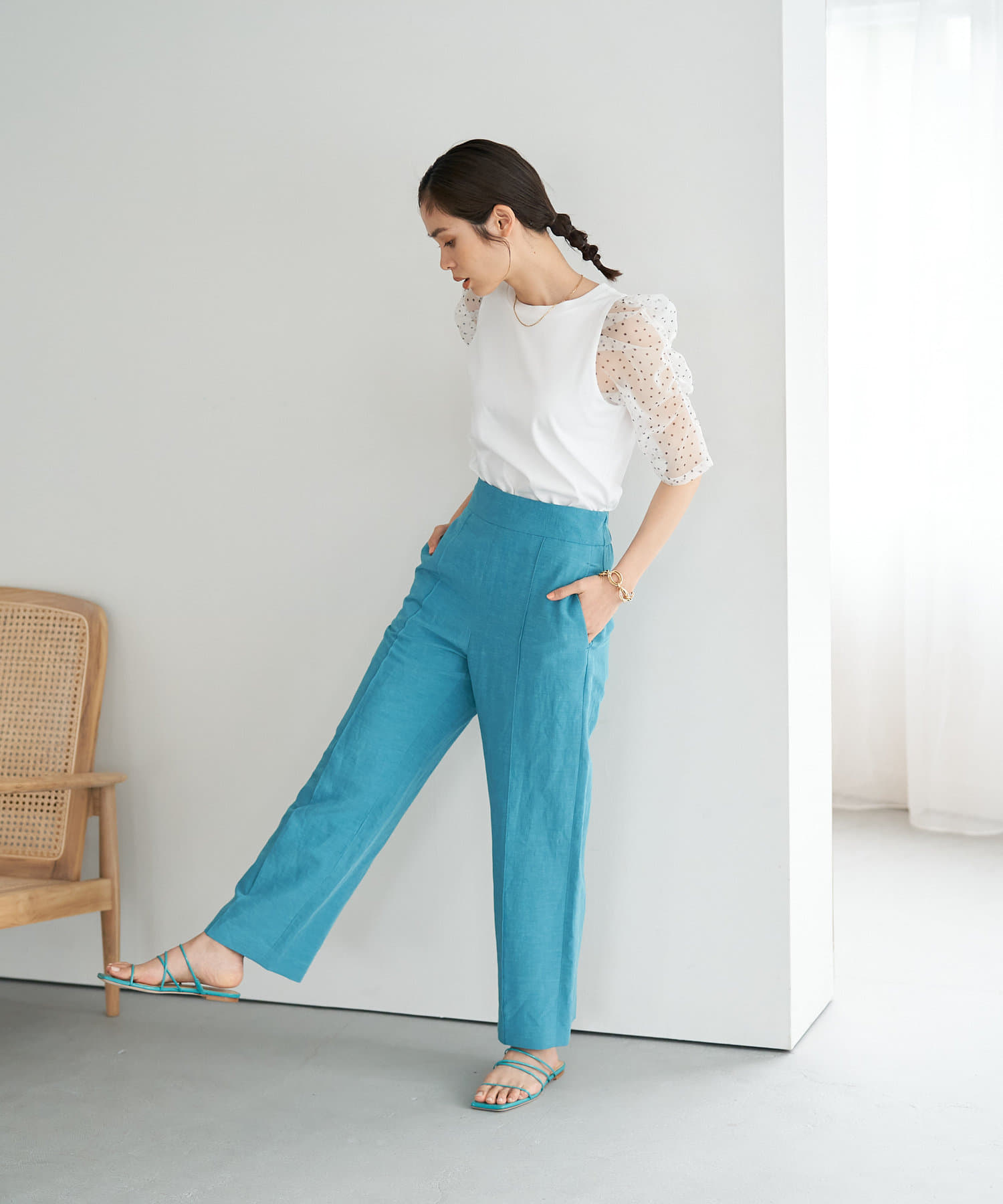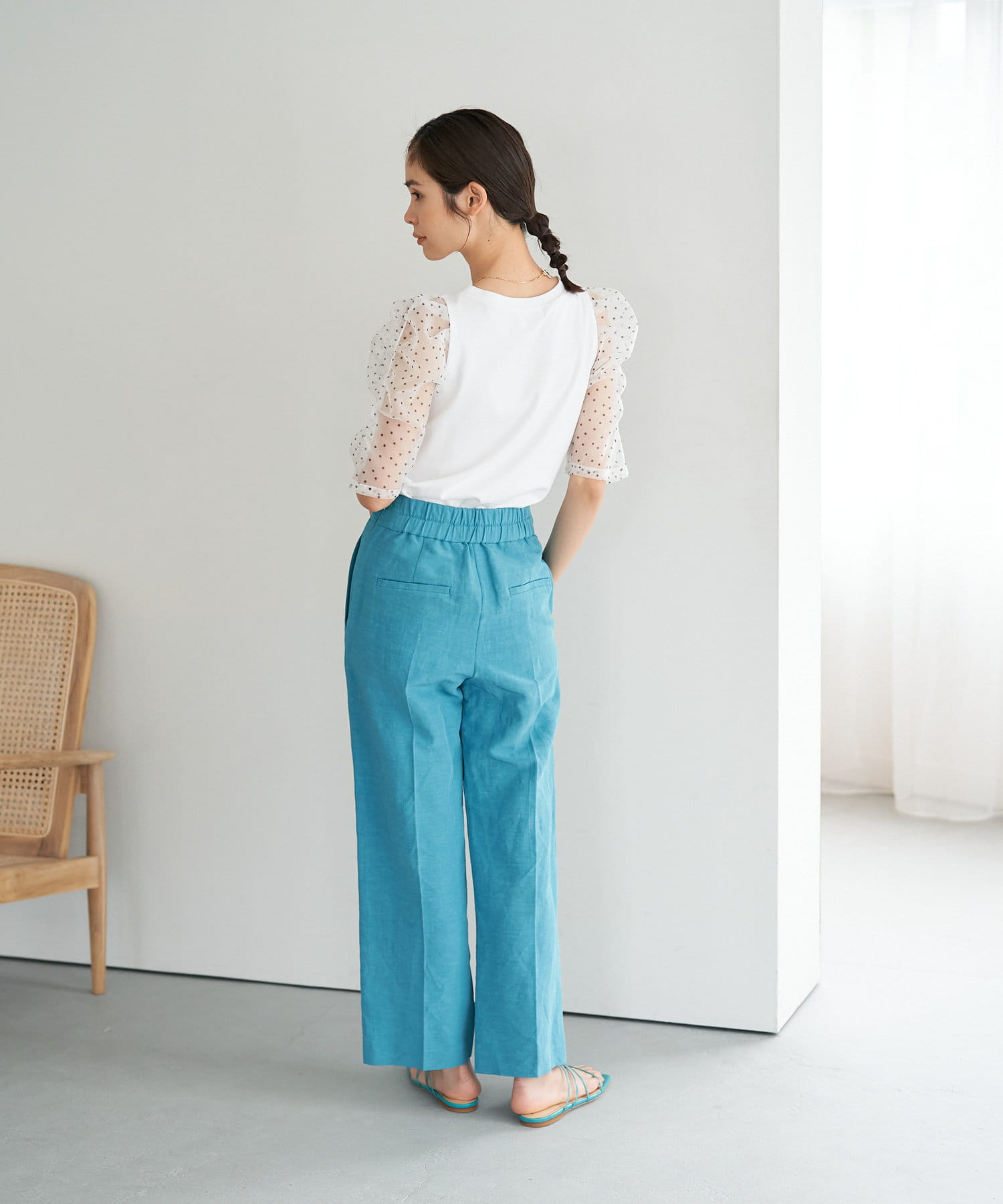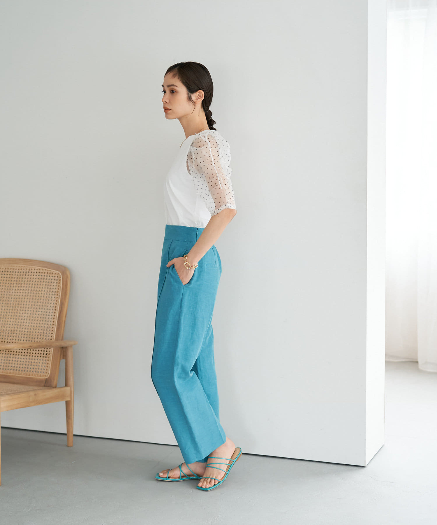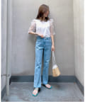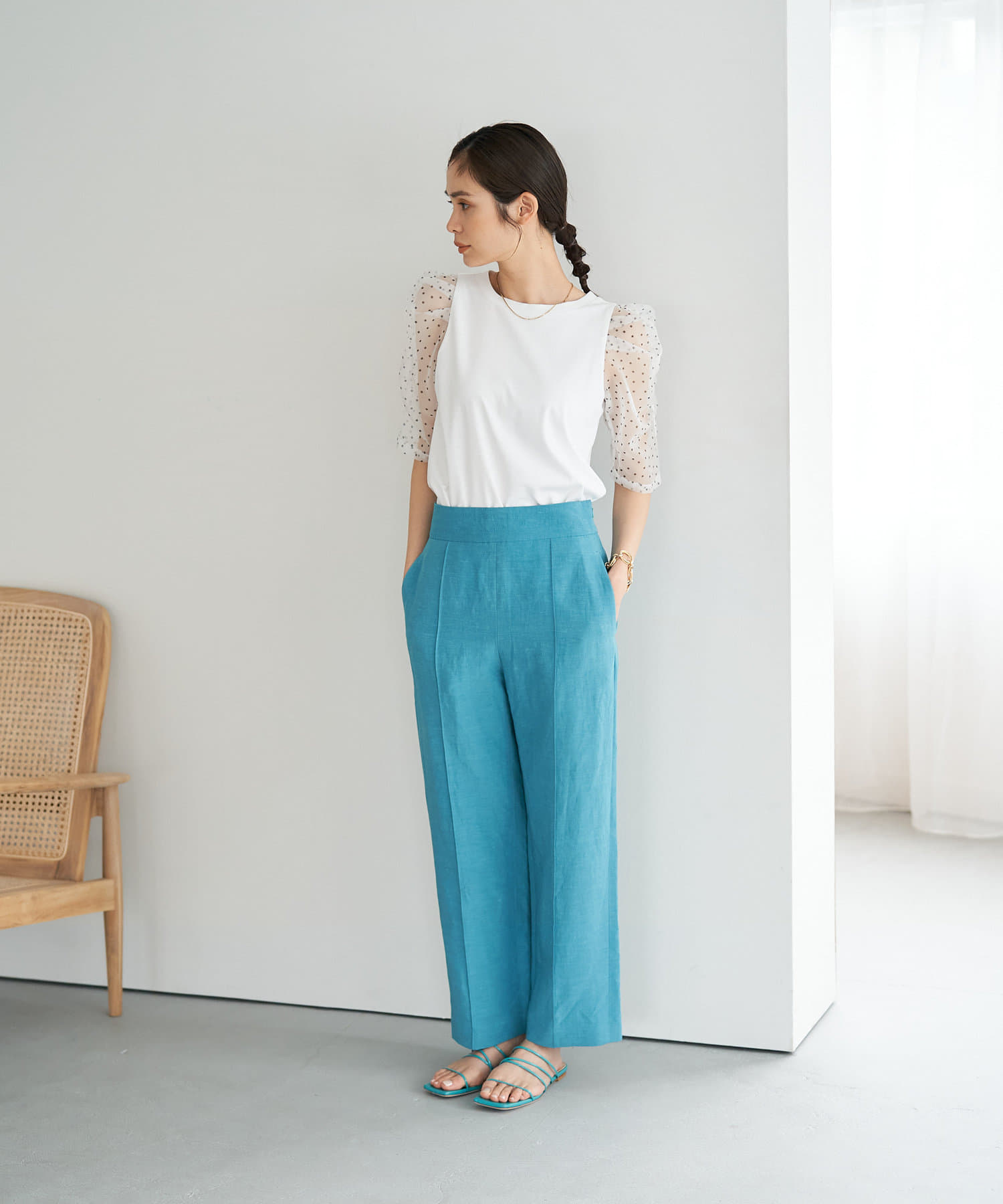 パンツと合わせて着ていただければ、甘さを抑えて着用いただけます。