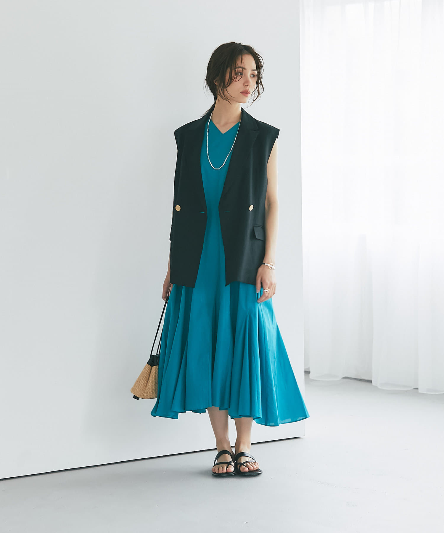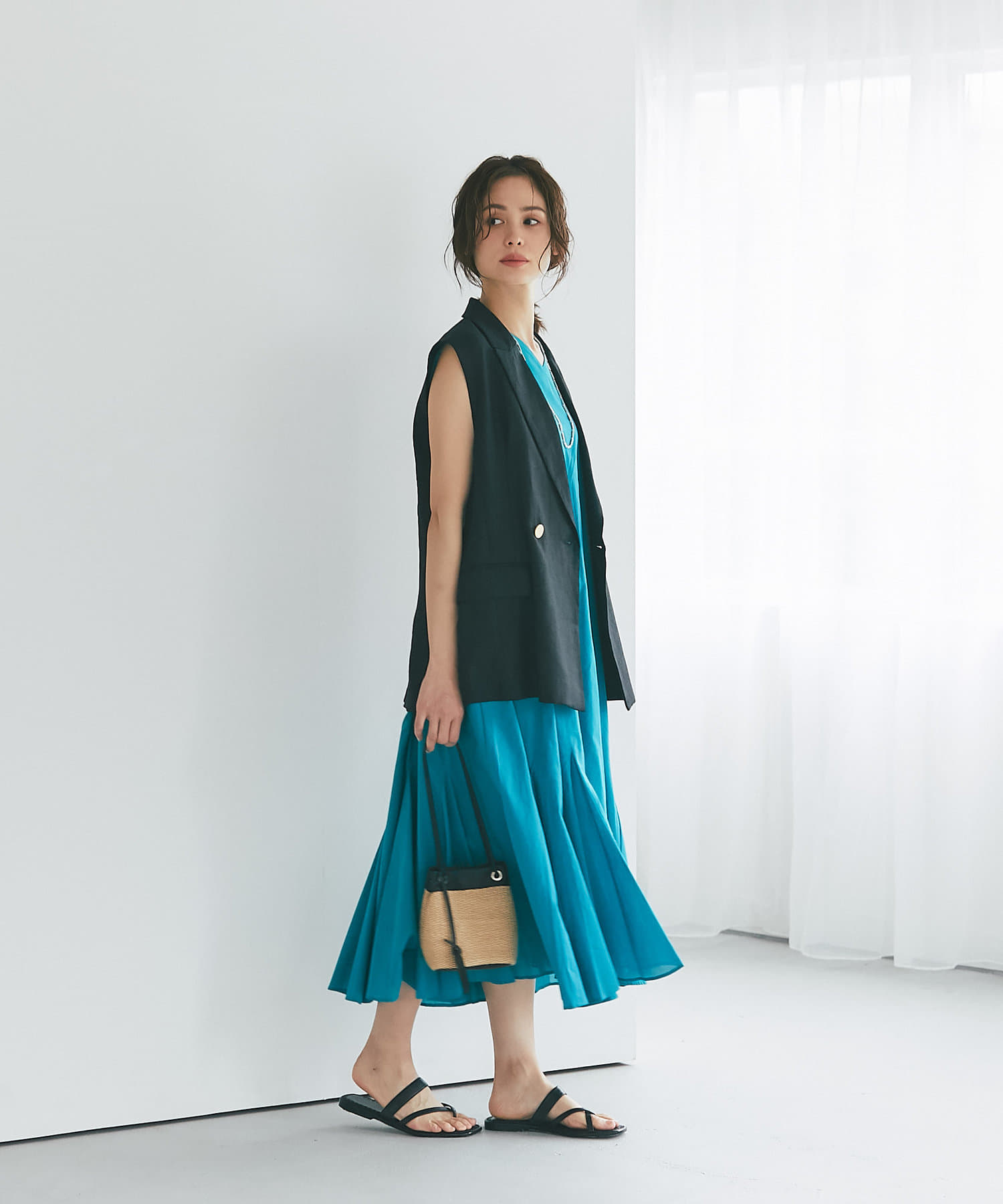 • ノースリーブジャケットできちんと感のあるスタイルにもマッチ。