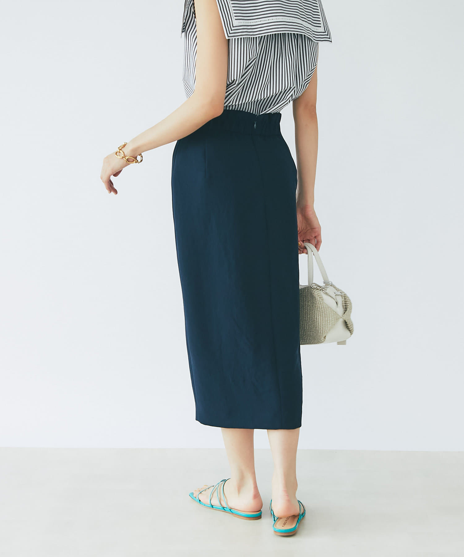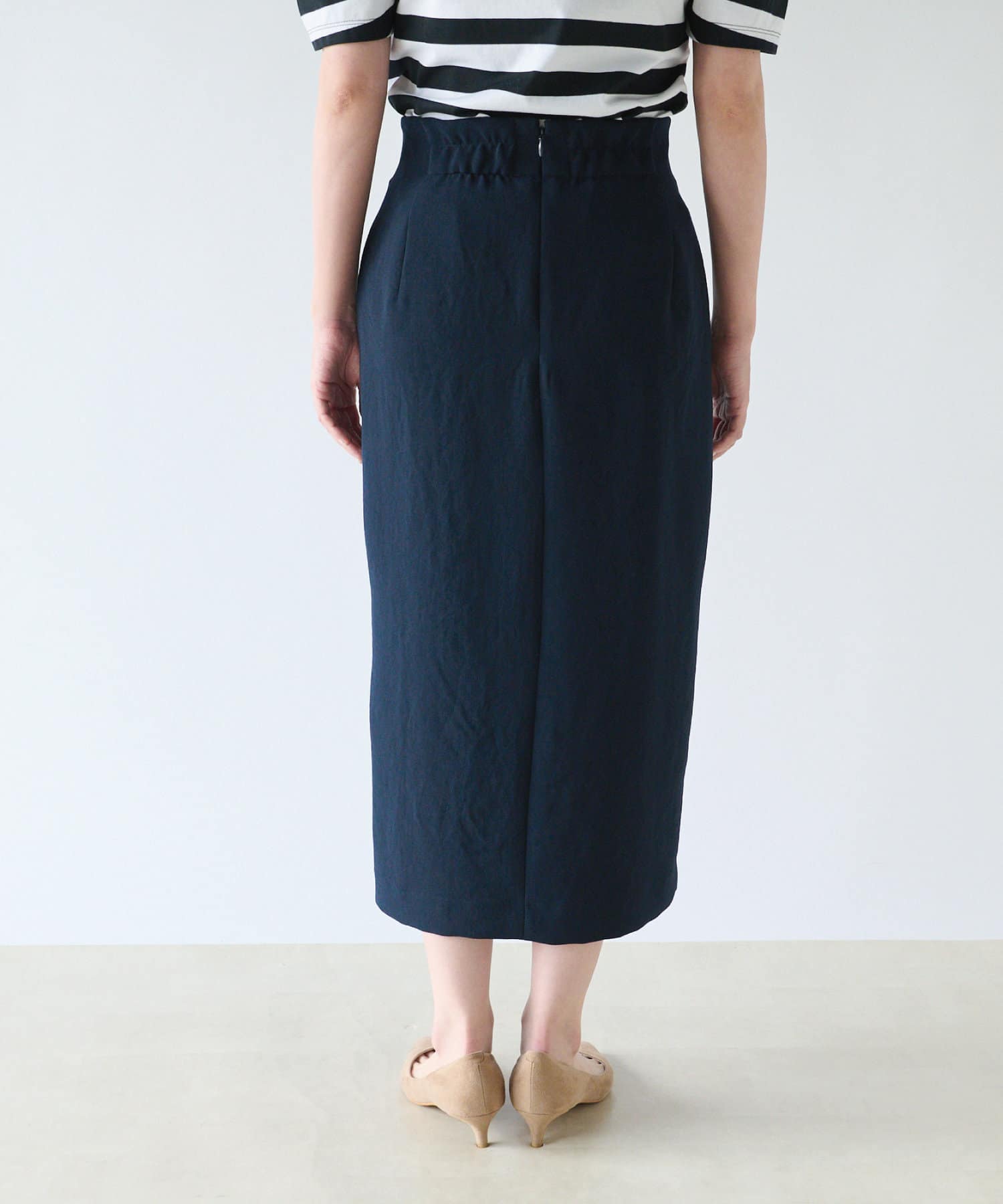 フロントのスリットがアクセントになるナロースカート。程よくゆとりのあるシルエットとストレッチ素材で着心地も抜群。ウエストはバックゴムでストレスなく着用いただけます。シンプルで合わせるものを選ばないのでデイリーユースに活躍間違いなし。