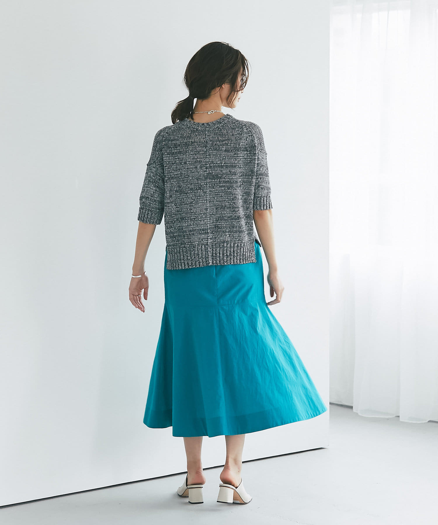 また、フェミニンなマーメイドスカートやデニムなどを合わせるのも印象が変わっておすすめのコーディネートです。