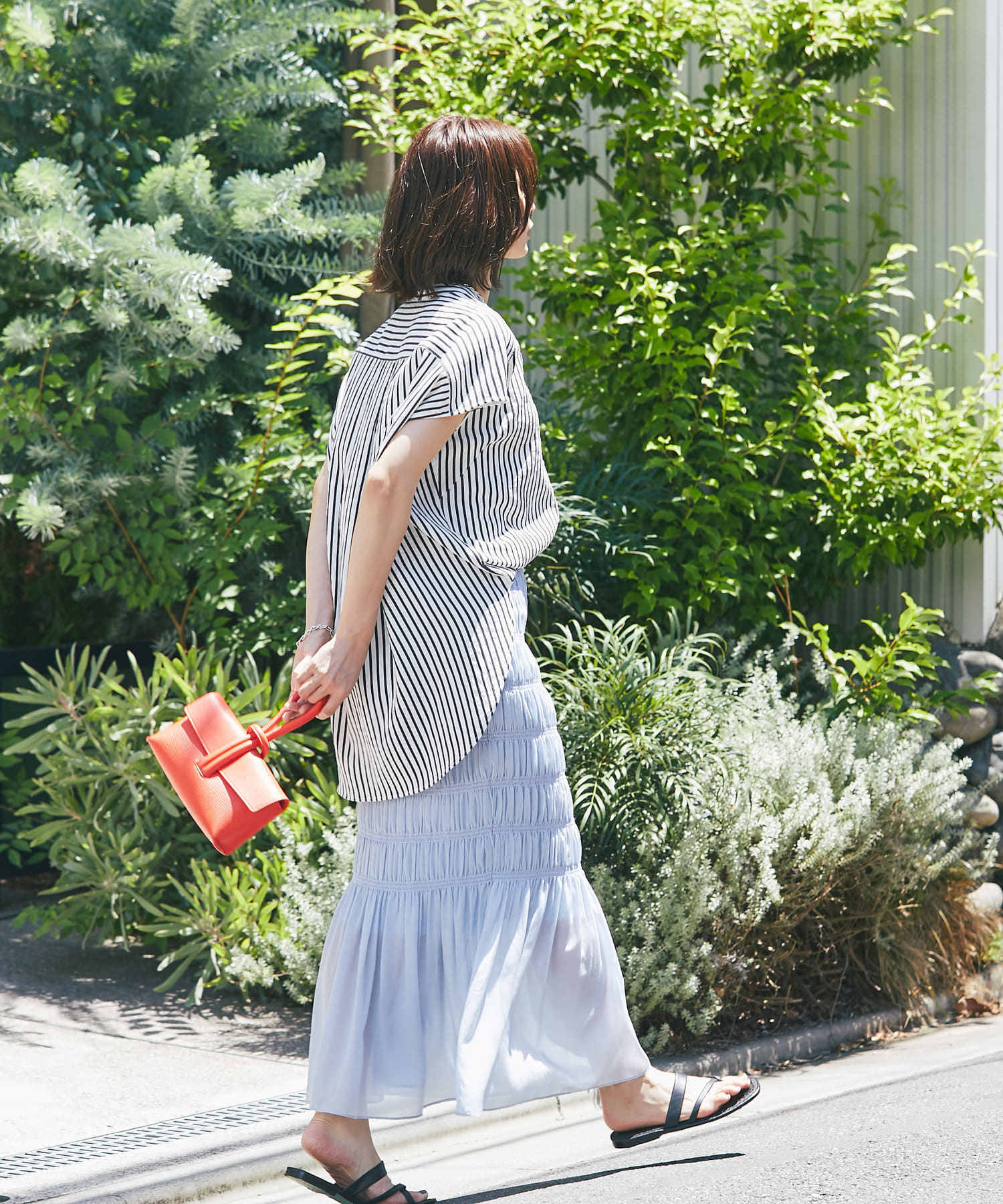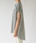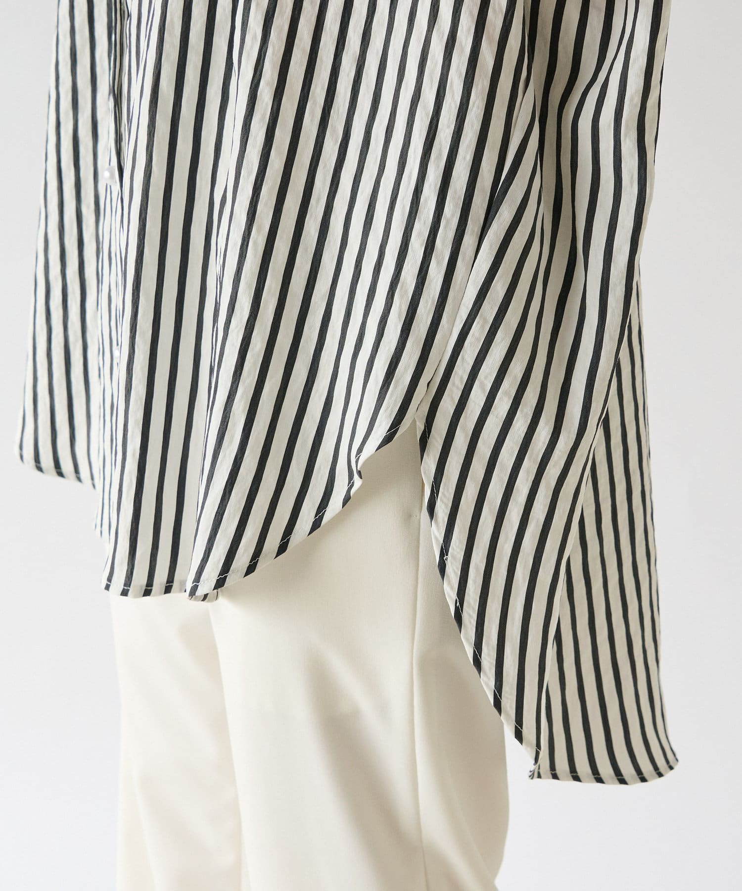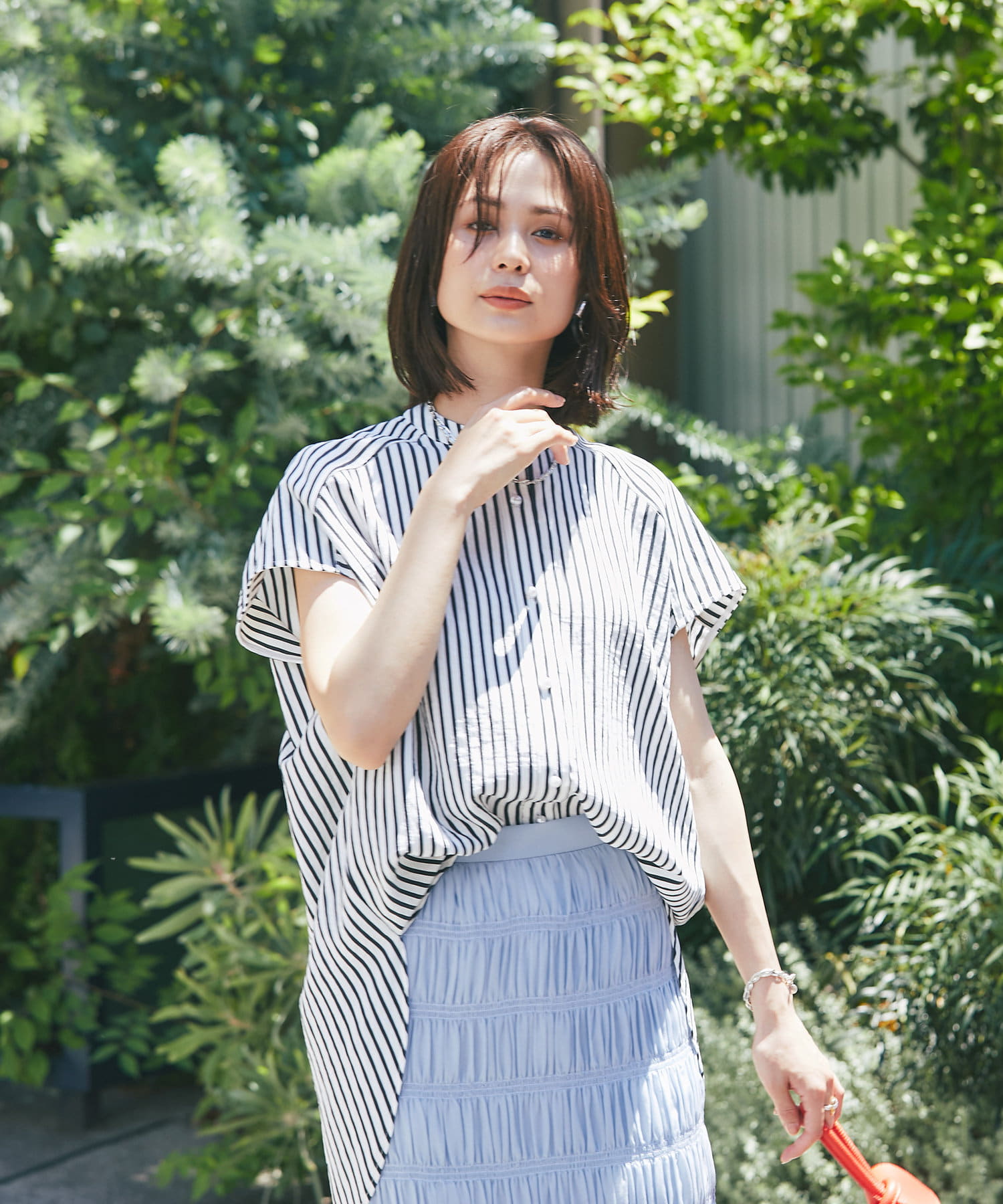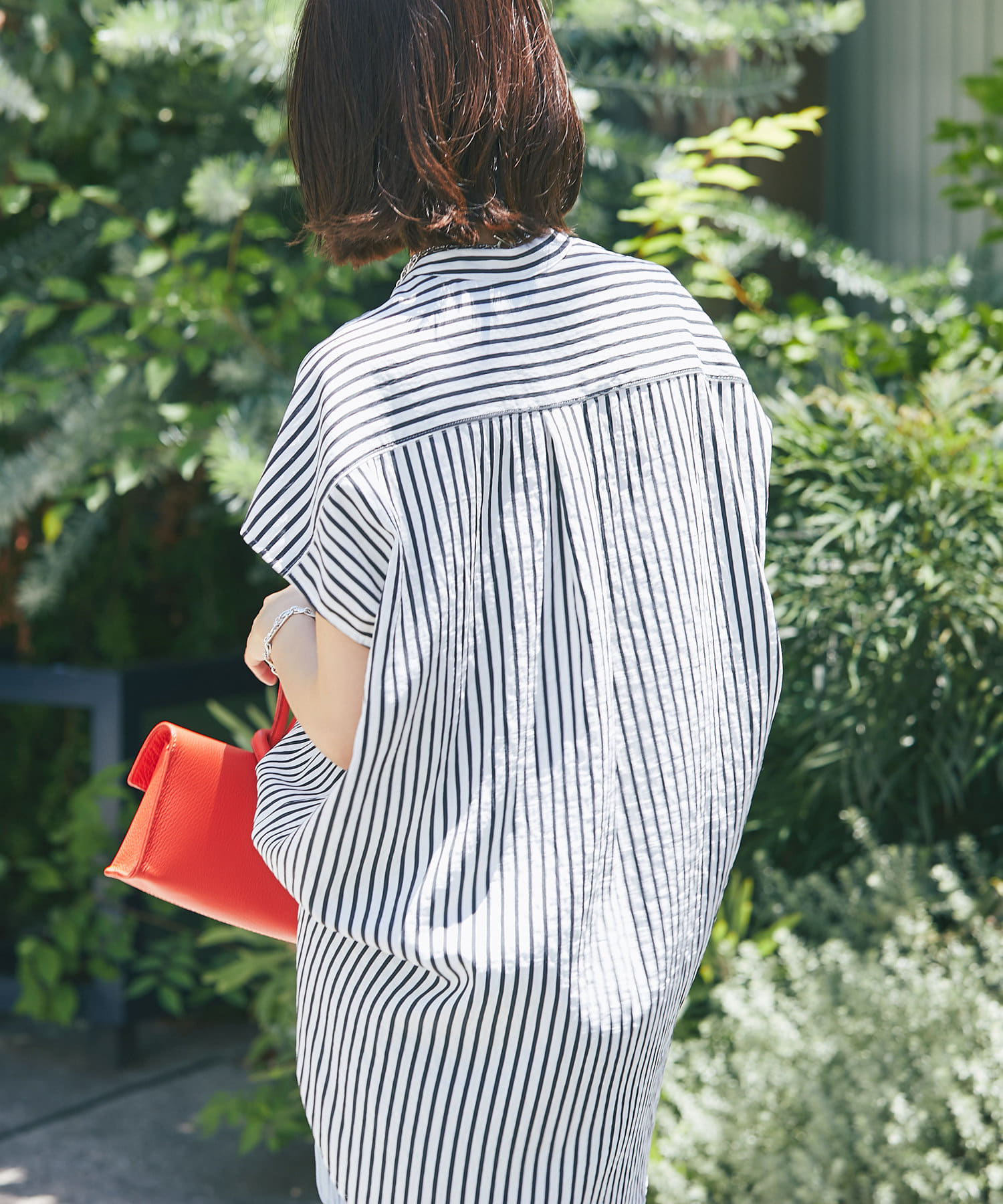 甘めの印象ながら、ストライプ柄が爽やかに全体の印象を引き締めて、毎日のコーデに取り入れやすい一枚に仕上げました。