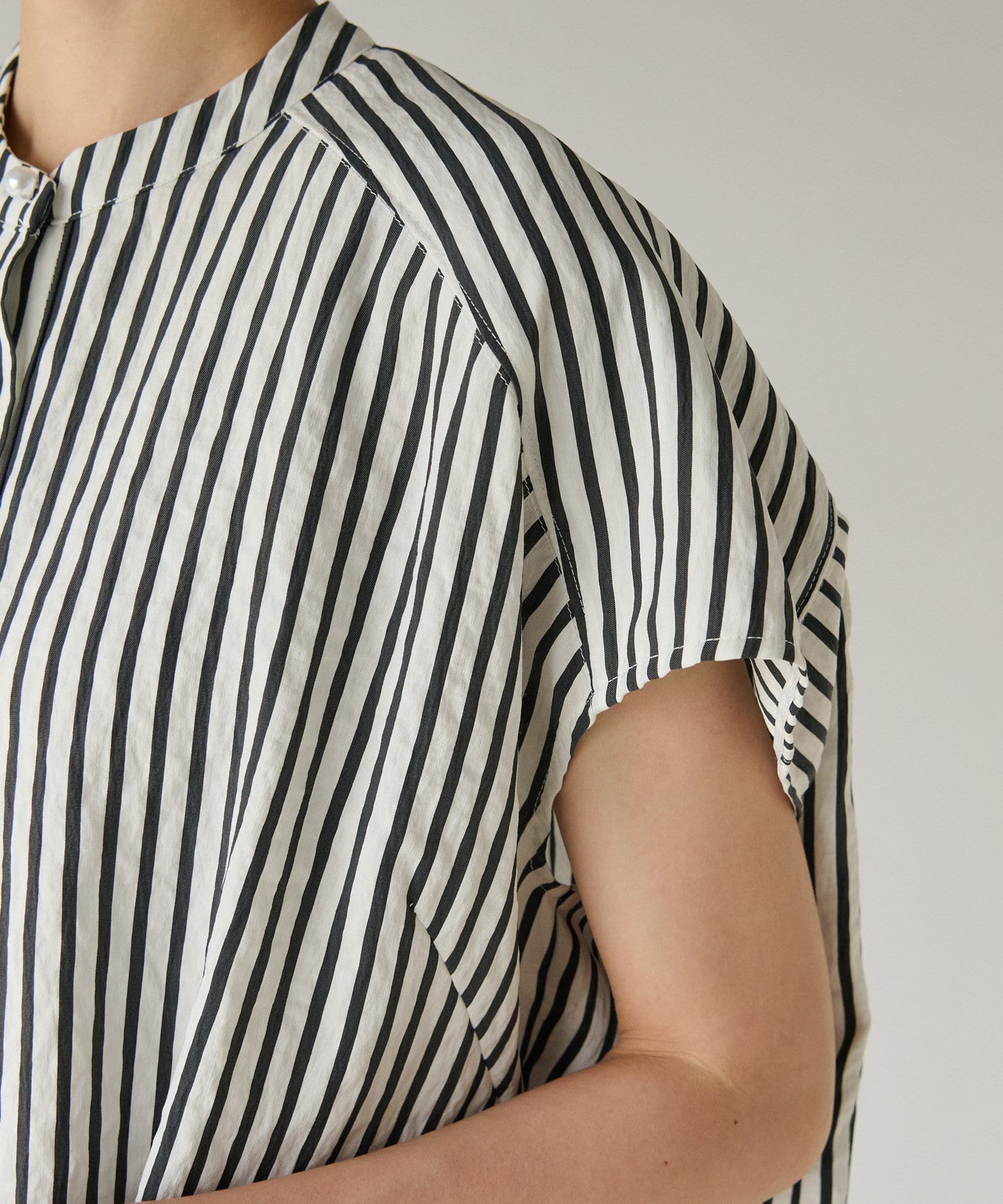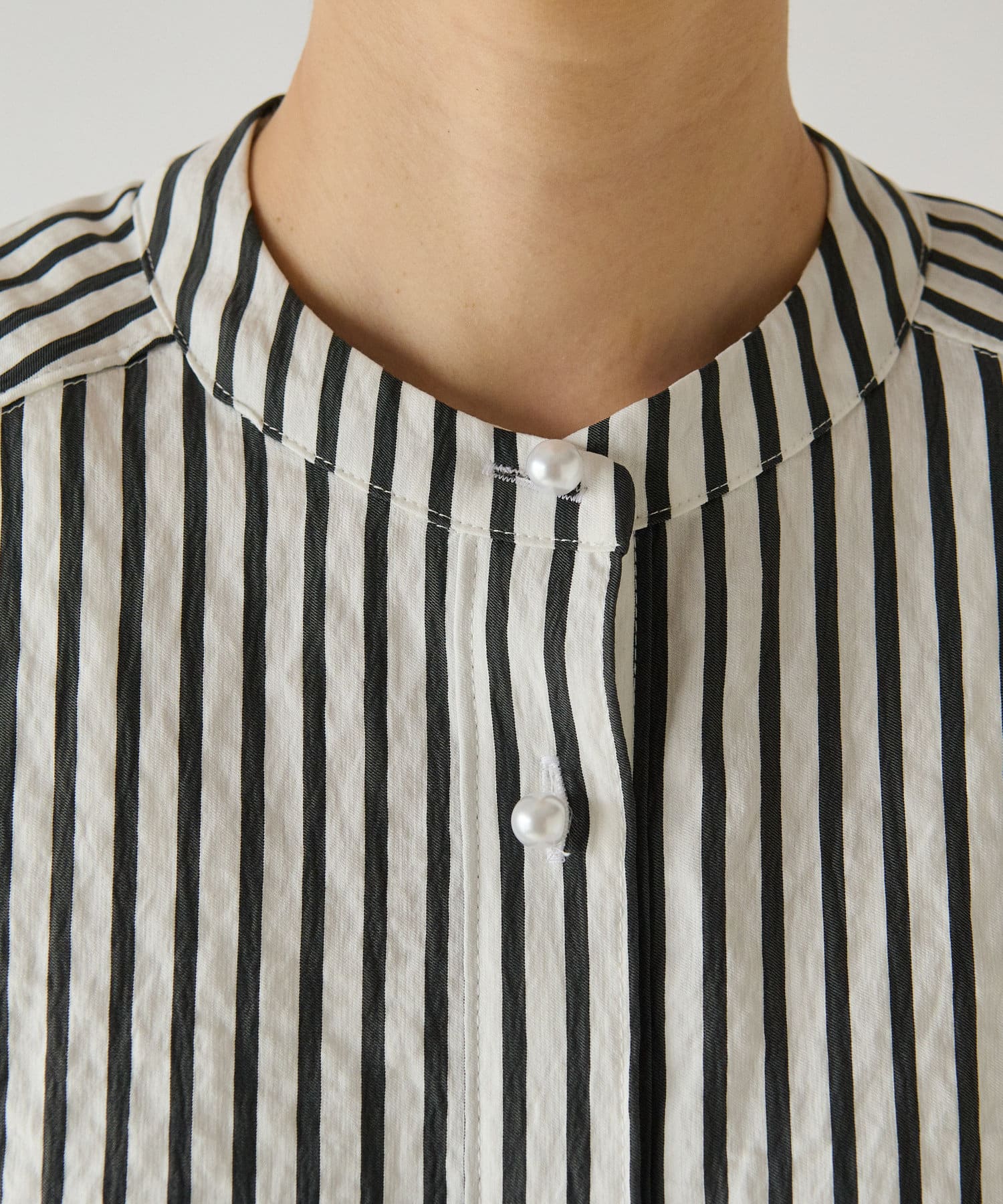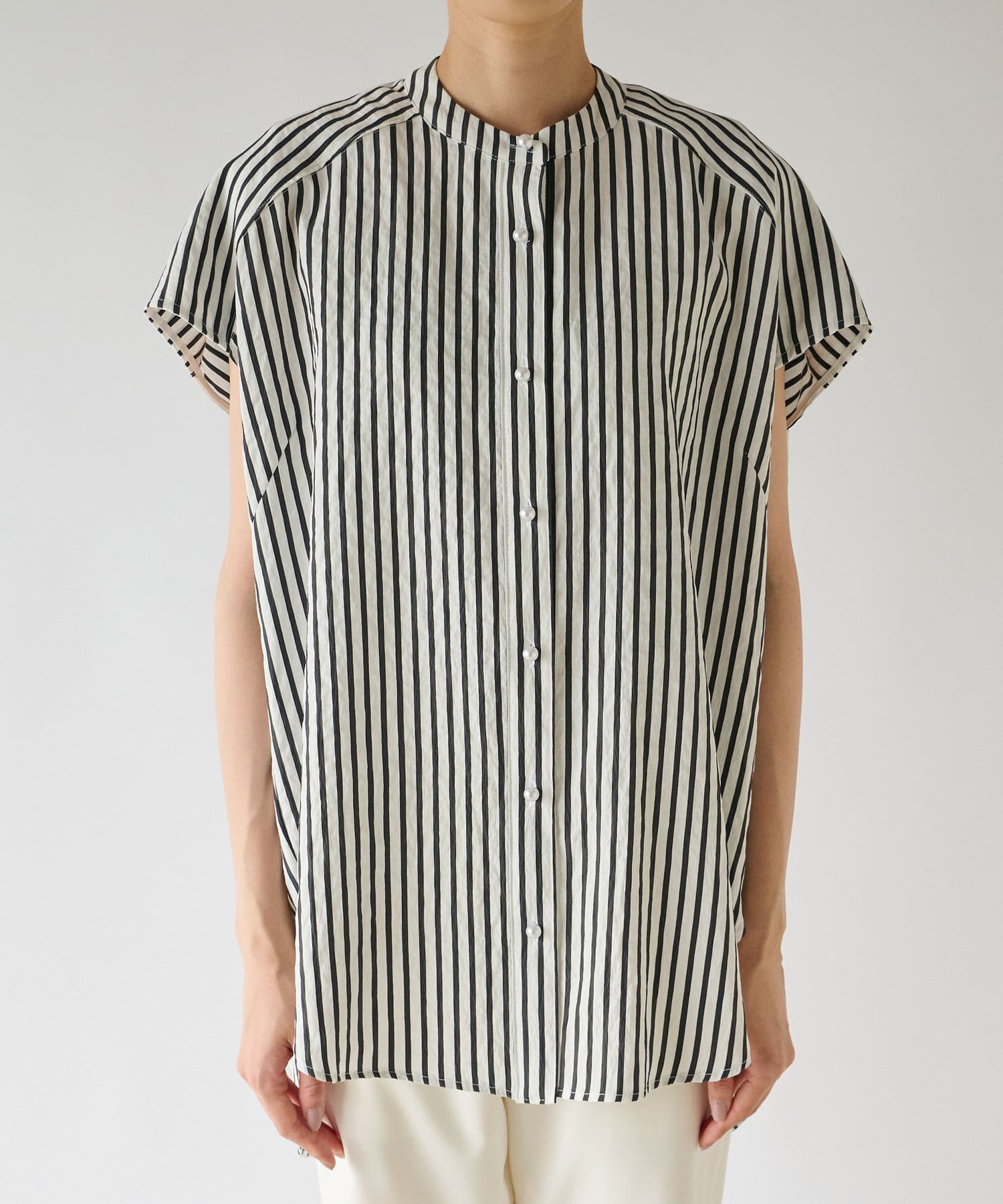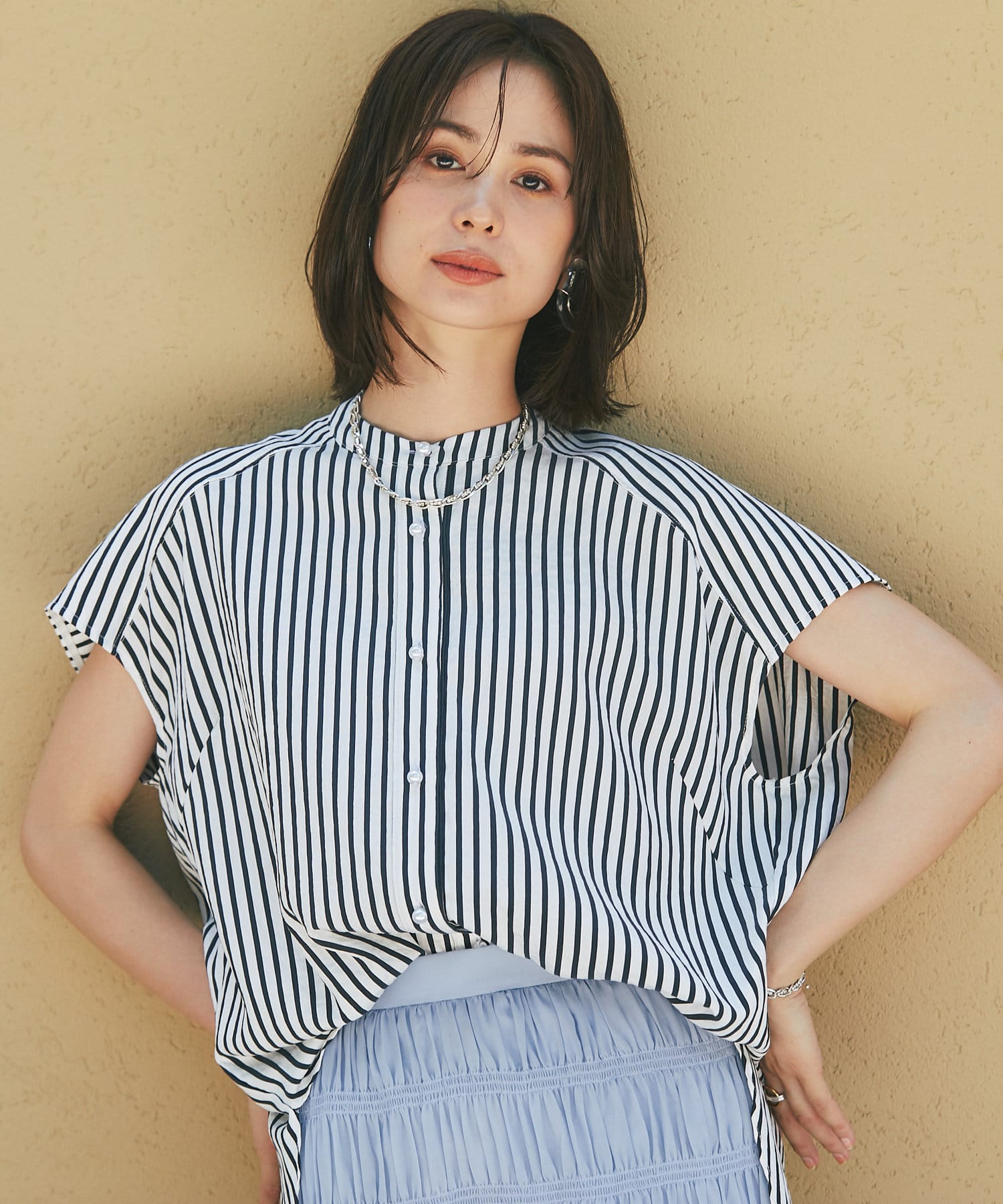 #パールディテール #大人カジュアル #きれいめカジュアル #オフィスカジュアル #ビッグパール #美人映え #スタンドカラー #デザインブラウス #ノースリーブ #ストライプ柄 #スタンドカラー #フレンチ袖