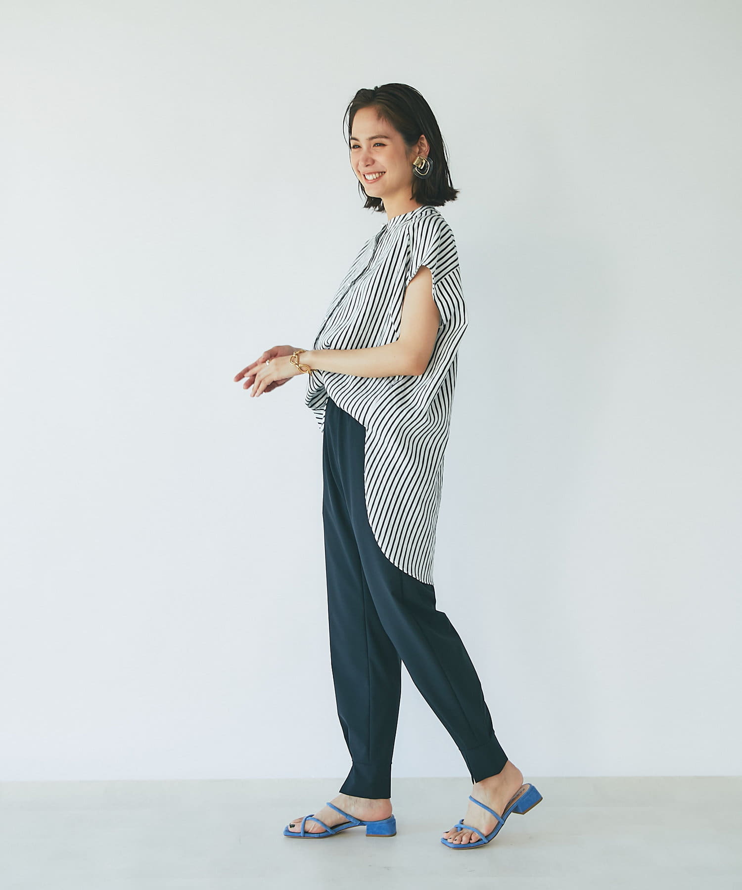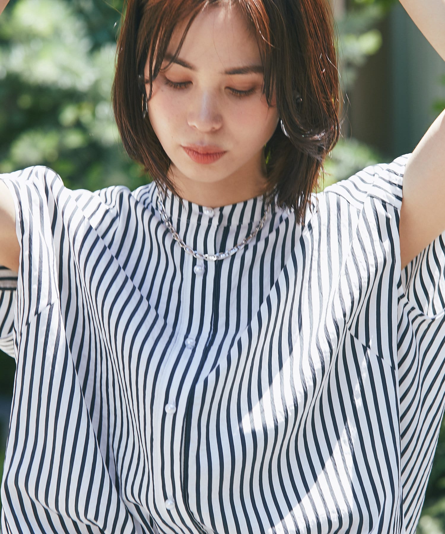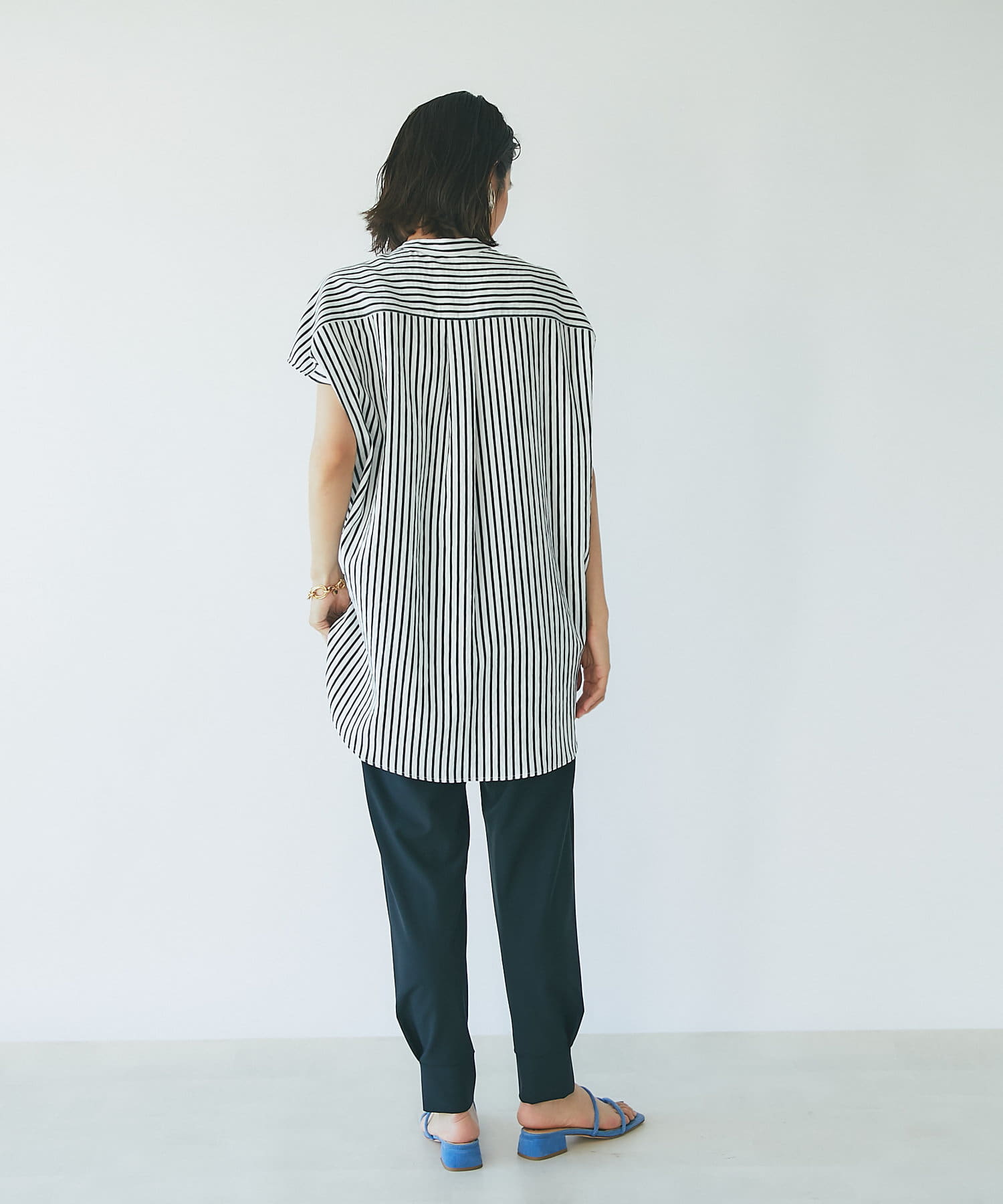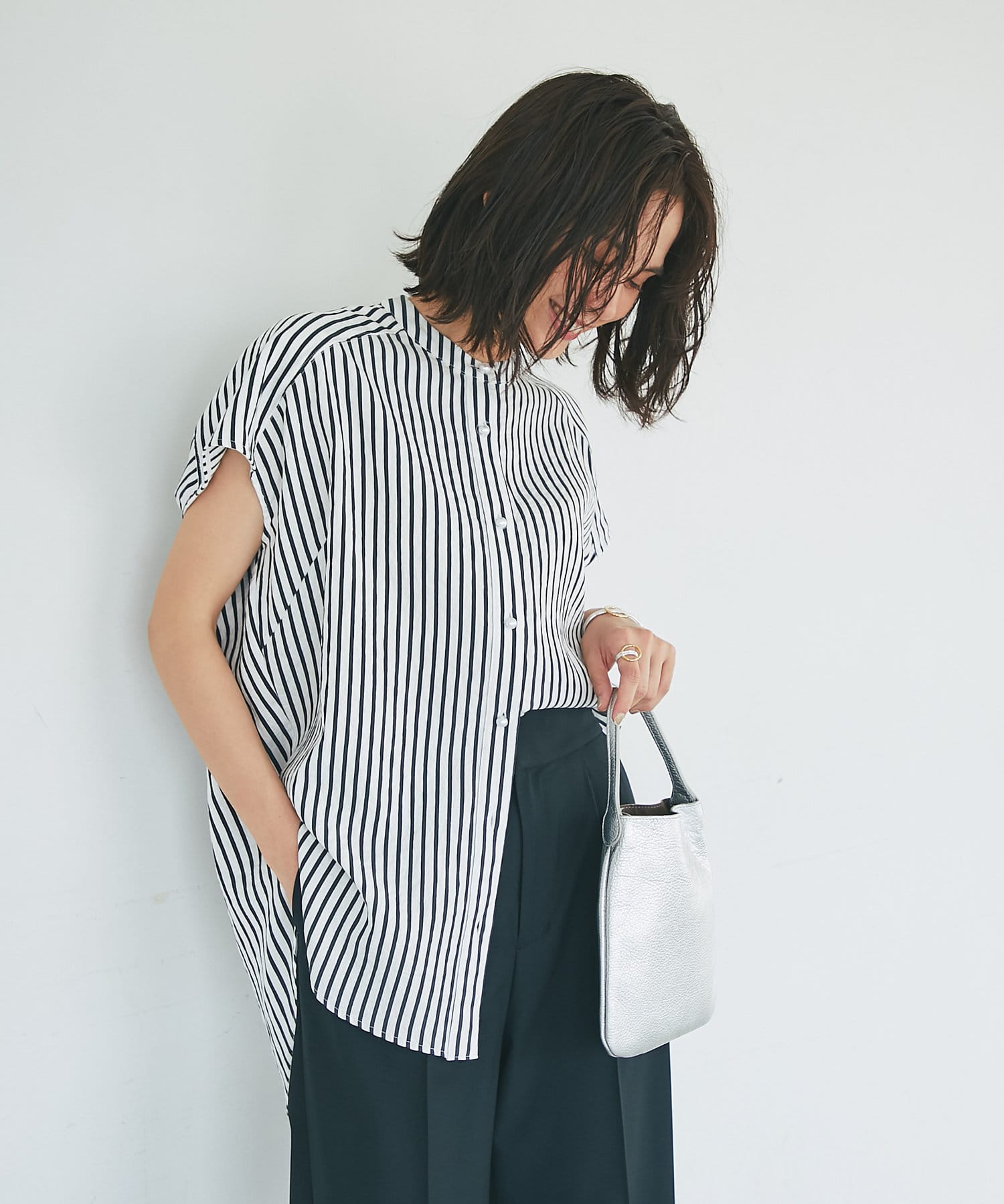 #パールディテール #大人カジュアル #きれいめカジュアル #オフィスカジュアル #ビッグパール #美人映え #スタンドカラー #デザインブラウス #ノースリーブ #ストライプ柄 #スタンドカラー #フレンチ袖
